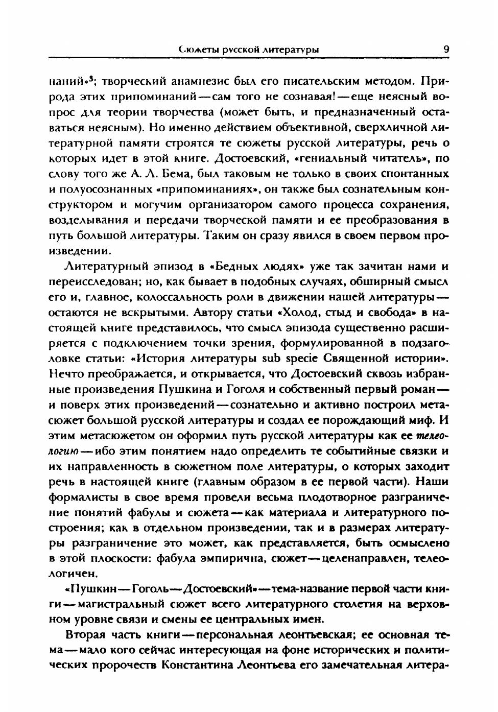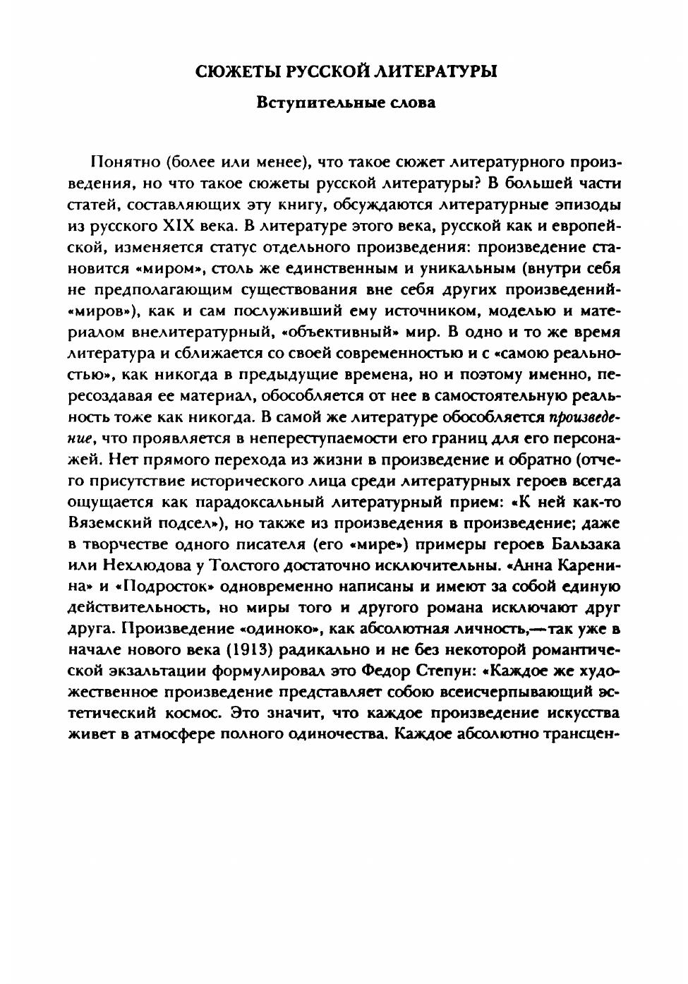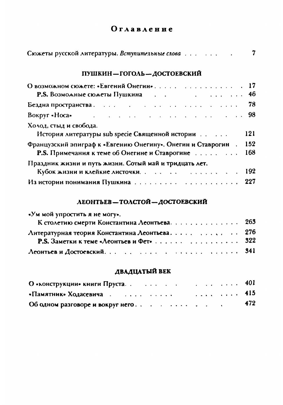 Книга сложилась из работ, написанных за последние 10 лет (все написаны после выхода последней книги автора «О художественных мирах», 1985). Сквозная тема книги сформулирована ее заглавием. «Сюжеты русской литературы» - это действия и события, совершавшиеся в пространстве русской литературы главным образом XIX века, но и нашего столетия тоже, магистральные сверхсюжеты, смысловые линии, просекающие это пространство. «Пушкин - Гоголь - Достоевский» - тема-название первой части книги - главный сюжет столетия на верховном уровне связи и смены ее центральных имен. Контакты и отношения между такими произведениями, как «Евгений Онегин», «Повести Белкина», «Нос», «Шинель», «Бедные люди», «Бесы», «Братья Карамазовы», и образуют сюжеты, развивающиеся в поле целой литературы. В статьях, образующих эту первую и главную часть книги, ставятся такие общие темы, как «История литературы sub specie Священной истории» (статья «Холод, стыд и свобода»), понимание Пушкина русской мыслью от Гоголя и Достоевского до Андрея Синявского и Андрея Битова («Из истории понимания Пушкина»). Трем главным именам в этой части аккомпанируют присутствующие также в ее статьях Баратынский, Языков, Аполлон Григорьев, Константин Леонтьев. Последнему имени посвящена персональная вторая часть книги - леонтьевская: «Леонтьев - Толстой - Достоевский». Ее основная тема - замечательная литературная теория Леонтьева, содержавшая пророческие для будущей теории литературы и поэтики зерна. Большая статья - «Леонтьев и Достоевский». Третья часть - «Двадцатый век». В центре этой части - несколько материалов полумемуарно полутеоретического характера о жизненной и научной судьбе и филологически-философском учении М.М. Бахтина. Другие герои этой части - Владислав Ходасевич, Марсель Пруст (единственный выход за тему «сюжетов русской литературы», впрочем, Пруст имеет также к ним отношение), А.Д. Синявский, Андрей Битов, Людмила Петрушевская, Александр Михаилов. Для научных работников, широкого круга специалистов.