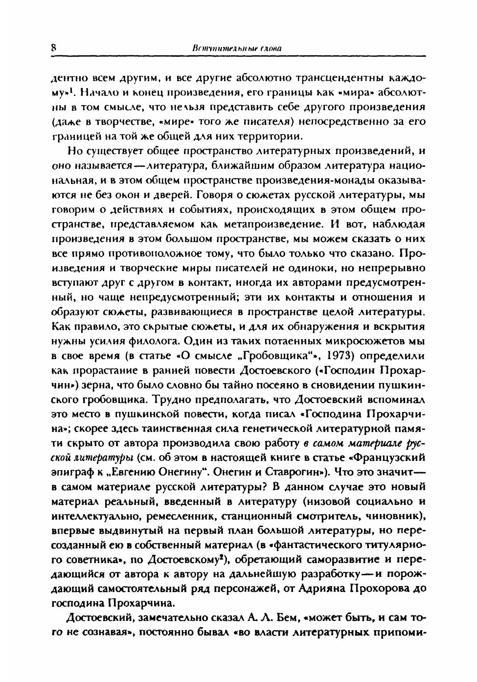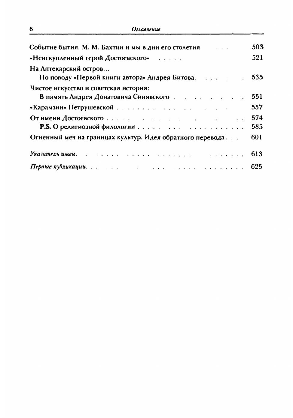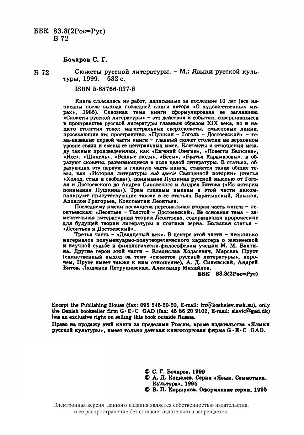 Книга сложилась из работ, написанных за последние 10 лет (все написаны после выхода последней книги автора «О художественных мирах», 1985). Сквозная тема книги сформулирована ее заглавием. «Сюжеты русской литературы» - это действия и события, совершавшиеся в пространстве русской литературы главным образом XIX века, но и нашего столетия тоже, магистральные сверхсюжеты, смысловые линии, просекающие это пространство. «Пушкин - Гоголь - Достоевский» - тема-название первой части книги - главный сюжет столетия на верховном уровне связи и смены ее центральных имен. Контакты и отношения между такими произведениями, как «Евгений Онегин», «Повести Белкина», «Нос», «Шинель», «Бедные люди», «Бесы», «Братья Карамазовы», и образуют сюжеты, развивающиеся в поле целой литературы. В статьях, образующих эту первую и главную часть книги, ставятся такие общие темы, как «История литературы sub specie Священной истории» (статья «Холод, стыд и свобода»), понимание Пушкина русской мыслью от Гоголя и Достоевского до Андрея Синявского и Андрея Битова («Из истории понимания Пушкина»). Трем главным именам в этой части аккомпанируют присутствующие также в ее статьях Баратынский, Языков, Аполлон Григорьев, Константин Леонтьев. Последнему имени посвящена персональная вторая часть книги - леонтьевская: «Леонтьев - Толстой - Достоевский». Ее основная тема - замечательная литературная теория Леонтьева, содержавшая пророческие для будущей теории литературы и поэтики зерна. Большая статья - «Леонтьев и Достоевский». Третья часть - «Двадцатый век». В центре этой части - несколько материалов полумемуарно полутеоретического характера о жизненной и научной судьбе и филологически-философском учении М.М. Бахтина. Другие герои этой части - Владислав Ходасевич, Марсель Пруст (единственный выход за тему «сюжетов русской литературы», впрочем, Пруст имеет также к ним отношение), А.Д. Синявский, Андрей Битов, Людмила Петрушевская, Александр Михаилов. Для научных работников, широкого круга специалистов.