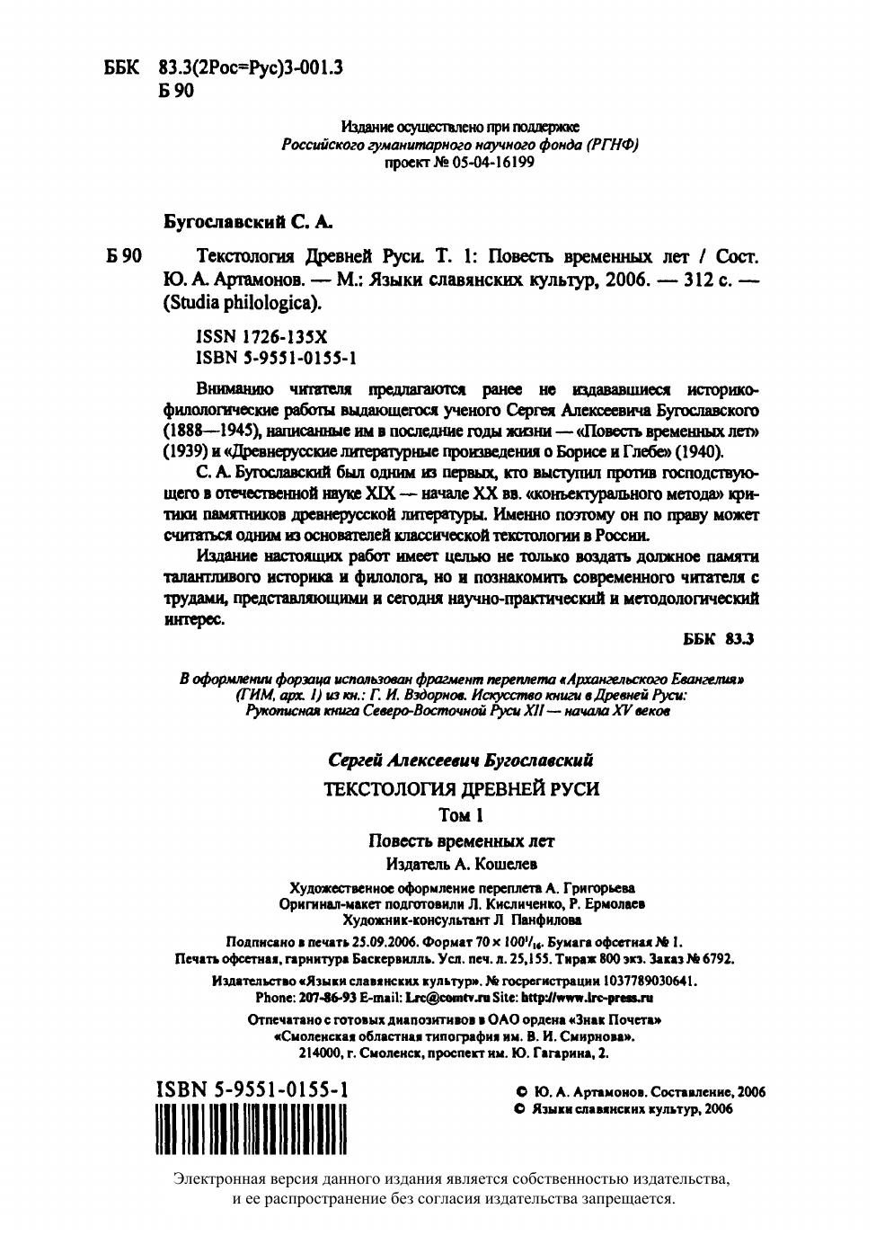 Вниманию читателя предлагаются ранее не издававшиеся историко-филологические работы выдающегося ученого Сергея Алексеевича Бугославского, написанные им в последние годы жизни - "Повесть временных лет" (1939) и "Древнерусские литературные произведения о Борисе и Глебе" (1940). С.А.Бугославский был одним из первых, кто выступил против господствующего в отечественной науке XIX - начале XX вв. "конъектурального метода" критики памятников древнерусской литературы. Именно поэтому он по праву может считаться одним из основателей классической текстологии в России. Издание настоящих работ имеет целью не только воздать должное памяти талантливого историка и филолога, но и познакомить современного читателя с трудами, представляющими и сегодня научно-практический и методологический интерес. Для научных работников, широкого круга специалистов.