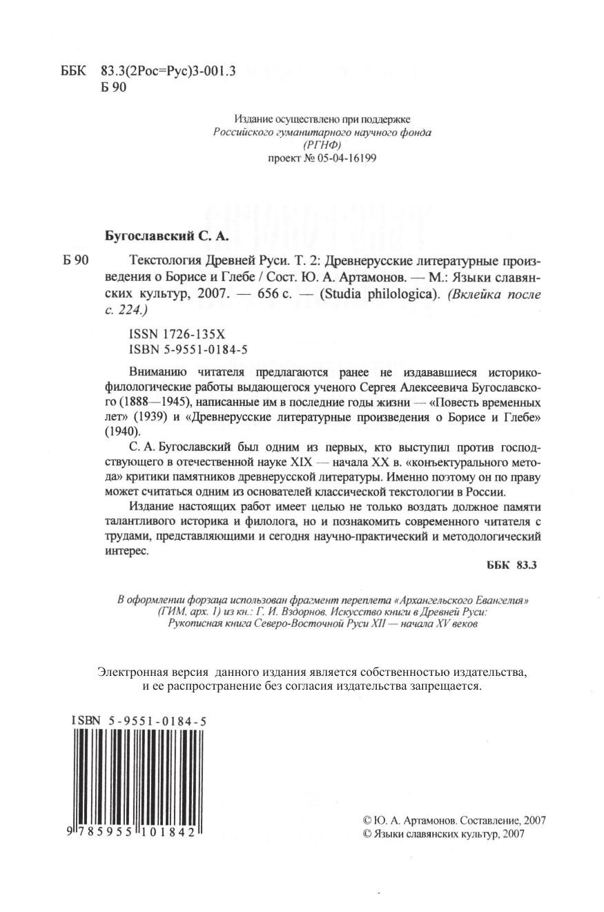 Вниманию читателя предлагаются ранее не издававшиеся историко-филологические работы выдающегося ученого Сергея Алексеевича Бугославского (1888–1945), написанные им в последние годы жизни – «Повесть временных лет» (1939) и «Древнерусские литературные произведения о Борисе и Глебе» (1940). С. А. Бугославский был одним из первых, кто выступил против господствующего в отечественной науке XIX – начала XX вв. «конъектурального метода» критики памятников древнерусской литературы. Именно поэтому он по праву может считаться одним из основателей классической текстологии в России. Издание настоящих работ имеет целью не только воздать должное памяти талантливого историка и филолога, но и познакомить современного читателя с трудами, представляющими и сегодня научно-практический и методологический интерес.