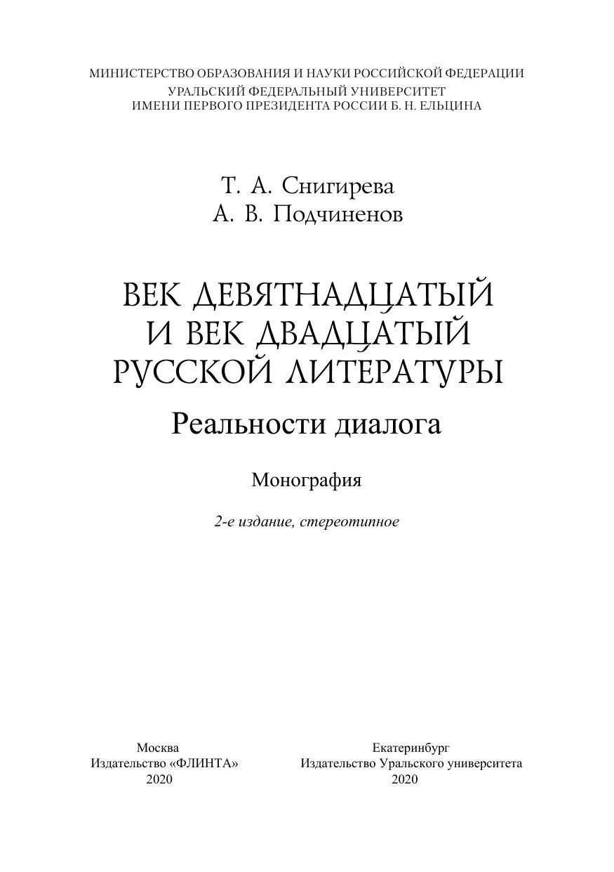 Век девятнадцатый и век двадцатый русской литературы: реальности диалоги