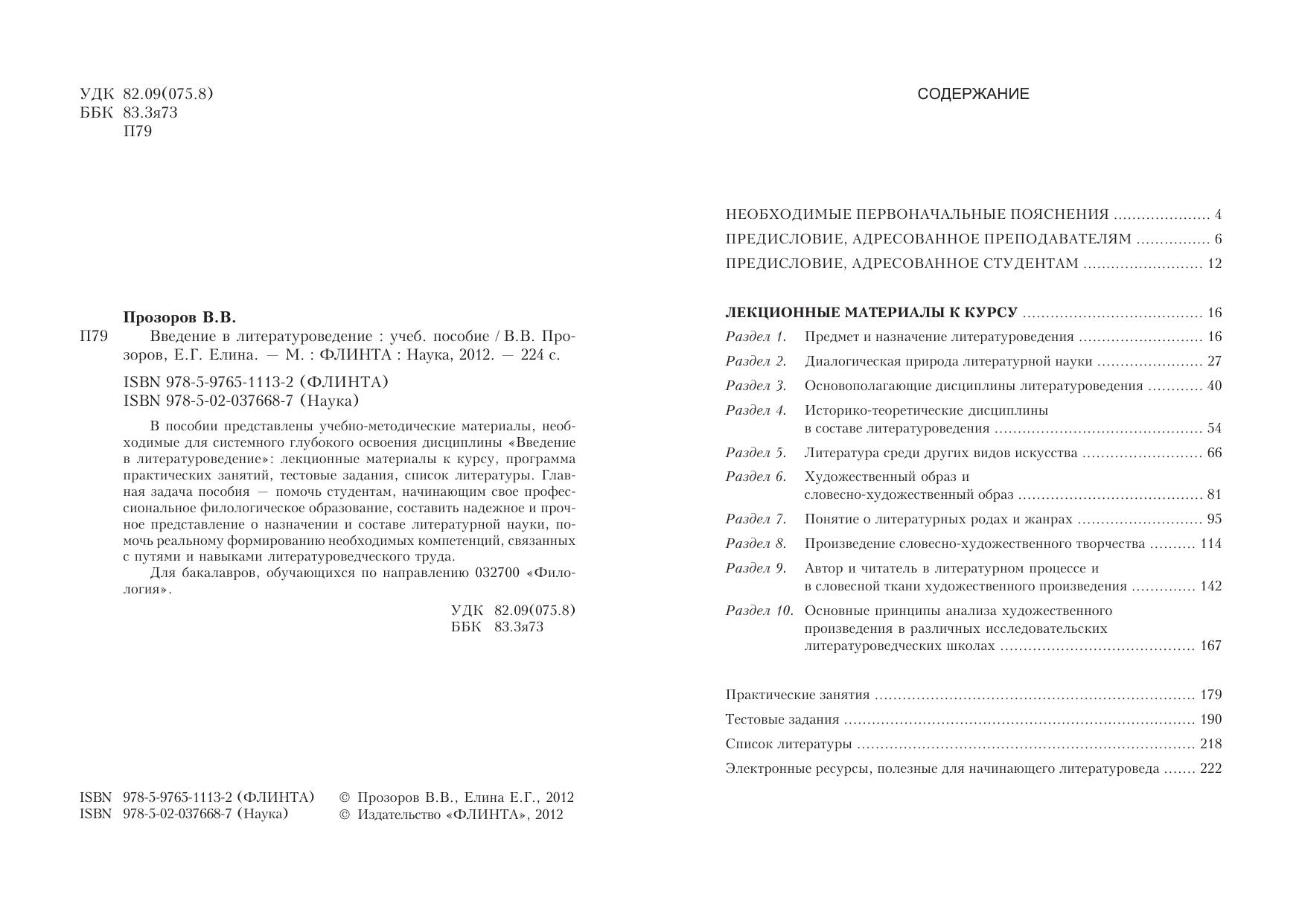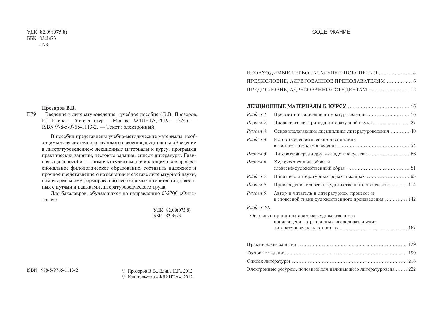 В пособии представлены учебно-методические материалы, необходимые для системного глубокого освоения дисциплины «Введение в литературоведение»: лекционные материалы к курсу, программа практических занятий, тестовые задания, список литературы. Главная задача пособия — помочь студентам, начинающим свое профессиональное филологическое образование, составить надежное и прочное представление о назначении и составе литературной науки, помочь реальному формированию необходимых компетенций, связанных с путями и навыками литературоведческого труда.