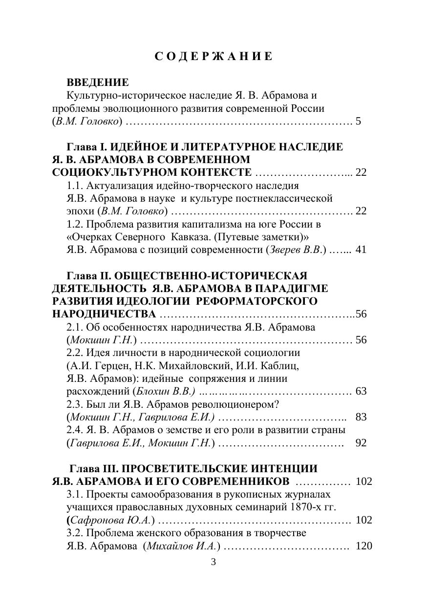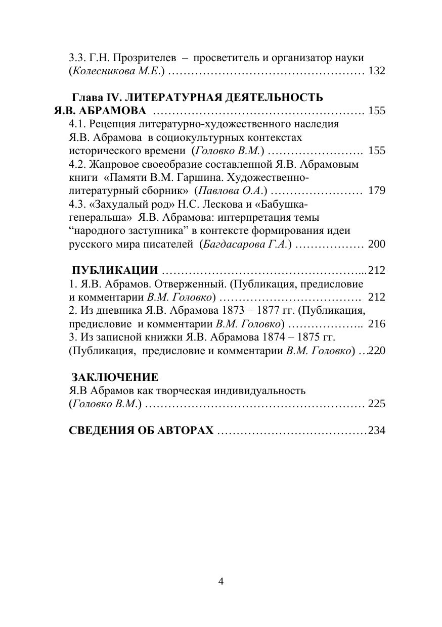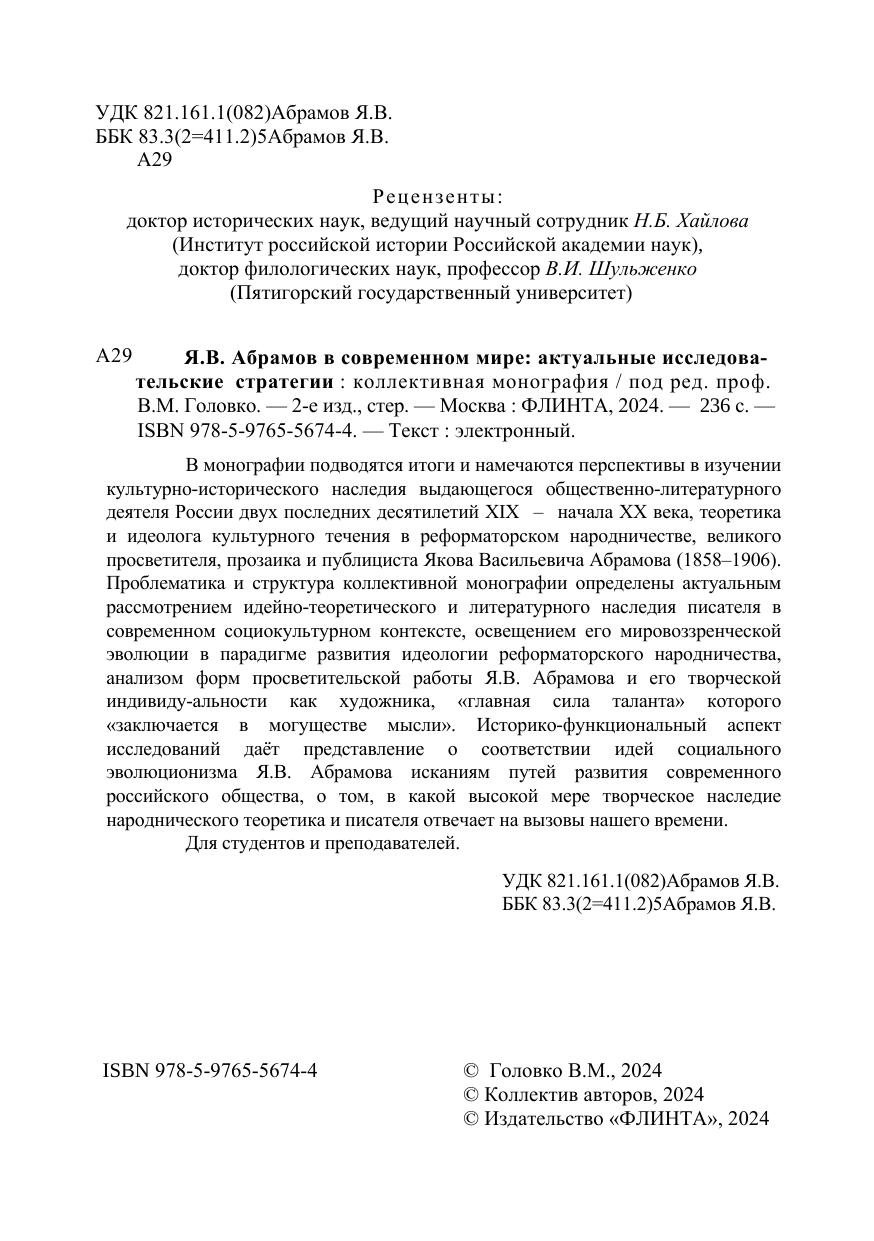 изучении культурно-исторического наследия выдающегося общественно-литературного деятеля России двух последних десятилетий ХIХ – начала ХХ века, теоретика и идеолога культурного течения в реформаторском народничестве, великого просветителя, прозаика и публициста Якова Васильевича Абрамова (1858–1906). Проблематика и структура коллективной монографии определены актуальным рассмотрением идейно-теоретического и литературного наследия писателя в современном социокультурном контексте, освещением его мировоззренческой эволюции в парадигме развития идеологии реформаторского народничества, анализом форм просветительской работы Я.В. Абрамова и его творческой индивидуальности как художника, «главная сила таланта» которого «заключается в могуществе мысли». Историко-функциональный аспект исследований даёт представление о соответствии идей социального эволюционизма Я.В. Абрамова исканиям путей развития современного российского общества, о том, в какой высокой мере творческое наследие народнического теоретика и писателя отвечает на вызовы нашего времени.