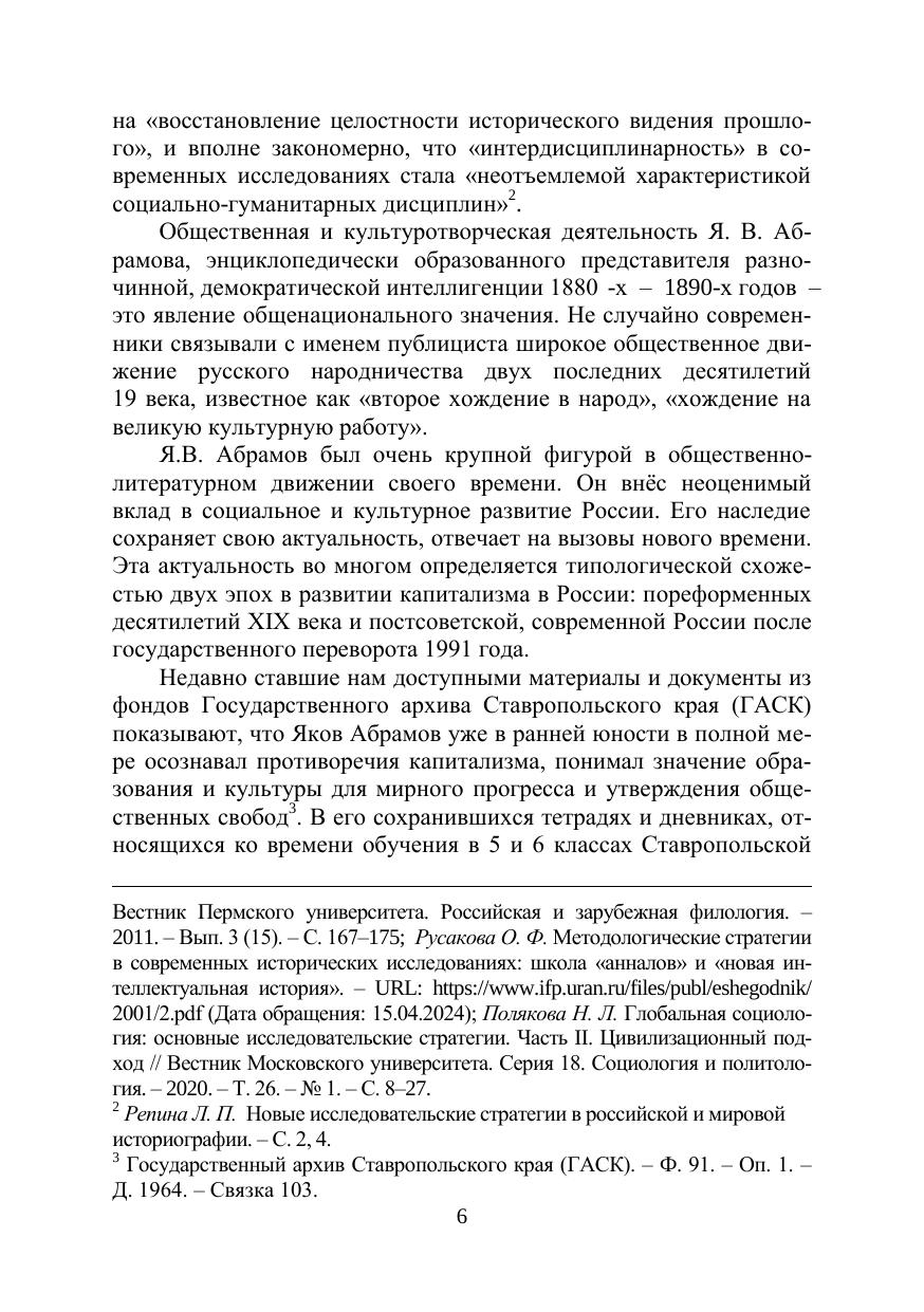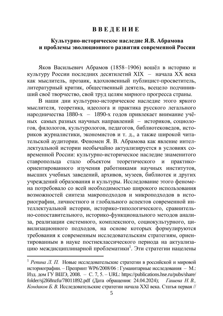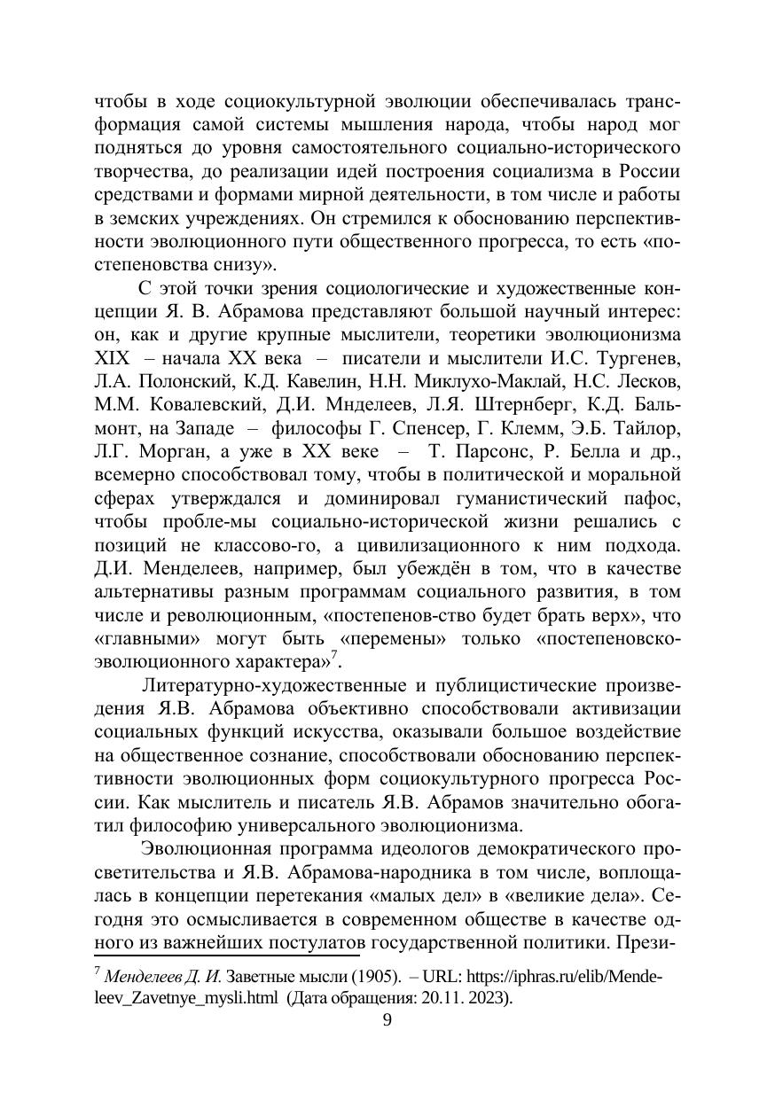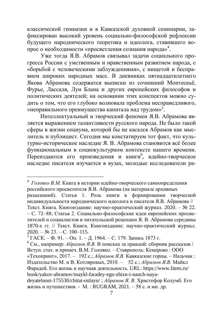 изучении культурно-исторического наследия выдающегося общественно-литературного деятеля России двух последних десятилетий ХIХ – начала ХХ века, теоретика и идеолога культурного течения в реформаторском народничестве, великого просветителя, прозаика и публициста Якова Васильевича Абрамова (1858–1906). Проблематика и структура коллективной монографии определены актуальным рассмотрением идейно-теоретического и литературного наследия писателя в современном социокультурном контексте, освещением его мировоззренческой эволюции в парадигме развития идеологии реформаторского народничества, анализом форм просветительской работы Я.В. Абрамова и его творческой индивидуальности как художника, «главная сила таланта» которого «заключается в могуществе мысли». Историко-функциональный аспект исследований даёт представление о соответствии идей социального эволюционизма Я.В. Абрамова исканиям путей развития современного российского общества, о том, в какой высокой мере творческое наследие народнического теоретика и писателя отвечает на вызовы нашего времени.