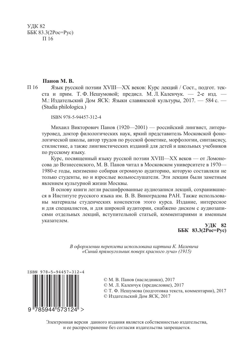 Михаил Викторович Панов (1920-2001) - российский лингвист, литературовед, доктор филологических наук, яркий представитель Московской фоно логической школы, автор трудов по русской фонетике, морфологии, синтаксису стилистике, а также лингвистических изданий для детей и школьных учебник по русскому языку. Курс, посвященный языку русской поэзии XVIII-XX веков - от Ломоносова до Вознесенского, М. В. Панов читал в Московском университете в 1970- 1980-е годы, неизменно собирая огромную аудиторию, которую составляли и только студенты, но и взрослые вольнослушатели. Эти лекции были заметные явлением культурной жизни Москвы. В основу книги легли расшифрованные аудиозаписи лекций, сохранившиеся в Институте русского языка им. В. В. Виноградова РАН. Также использованы материалы студенческих конспектов этого курса. Издание, интересно и для специалистов, и для широкой аудитории, снабжено диском с аудиозаписями отдельных лекций, вступительной статьей, комментариями и именным указателем.
