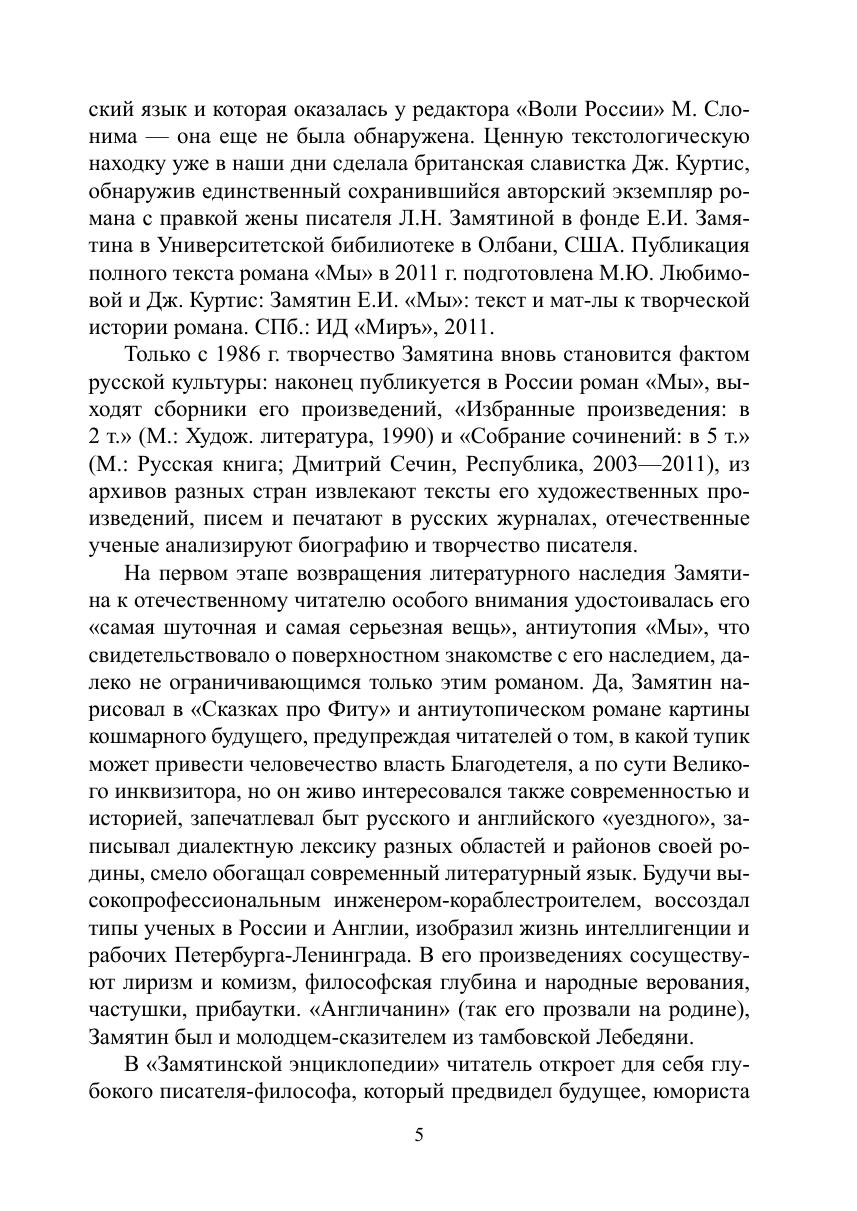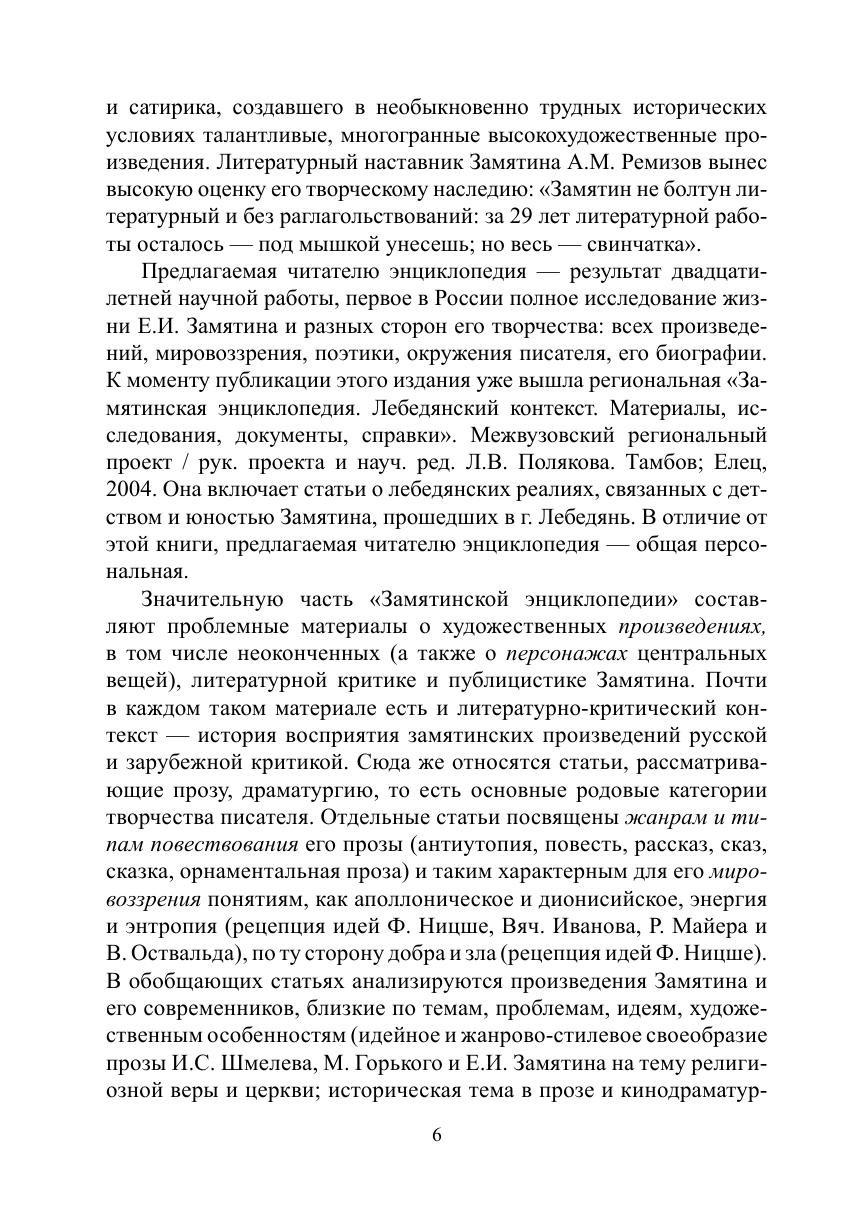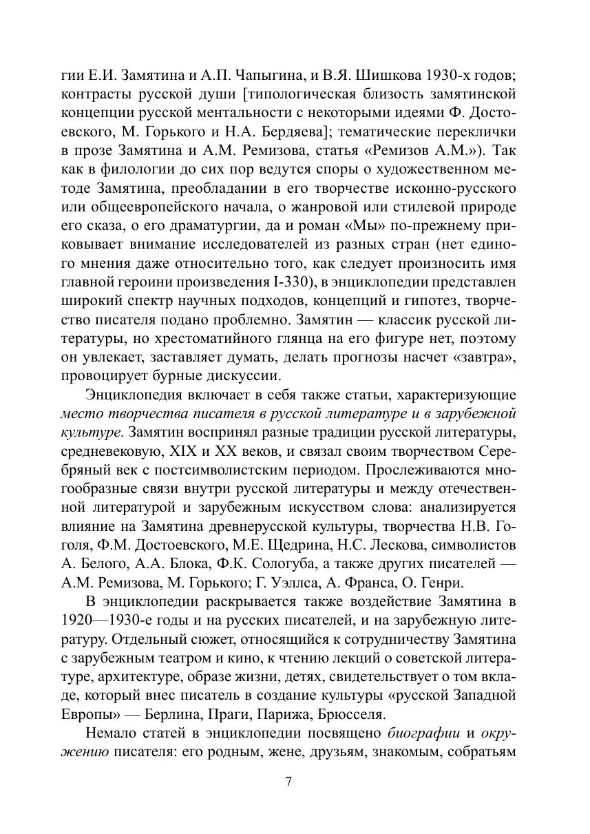 «Замятинская энциклопедия» — первое в мире справочное издание, основанное на полном исследовании жизни Е.И. Замятина (1884—1937) и разных сторон его творчества: всех художественных произведений и статей, мировоззрения, поэтики, окружения Замятина. Создается широкая панорама литературной жизни России 1900—1920-х годов и русской эмиграции 1930-х годов. В книге воссозданы также связи Замятина с русской классической литературой, изобразительным искусством, отечественным и зарубежным театром, кино. Большое внимание уделено роману «Мы», вошедшему в школьную и вузовскую программы, а также основным прозаическим и драматургическим произведениям писателя, театральным постановкам его пьес и экранизации сценария по драме М. Горького «На дне». Представлена богатая библиография о творчестве Замятина.