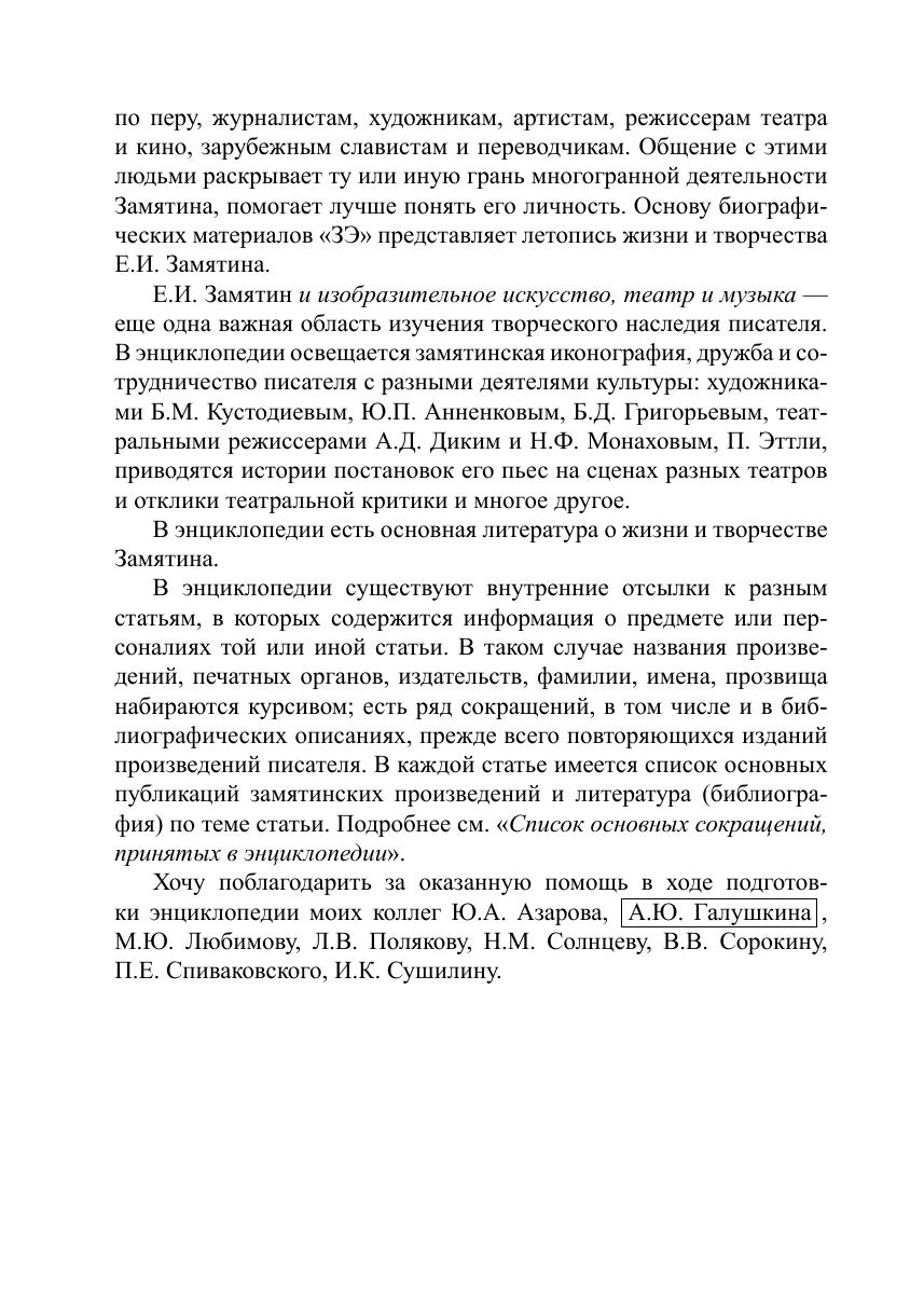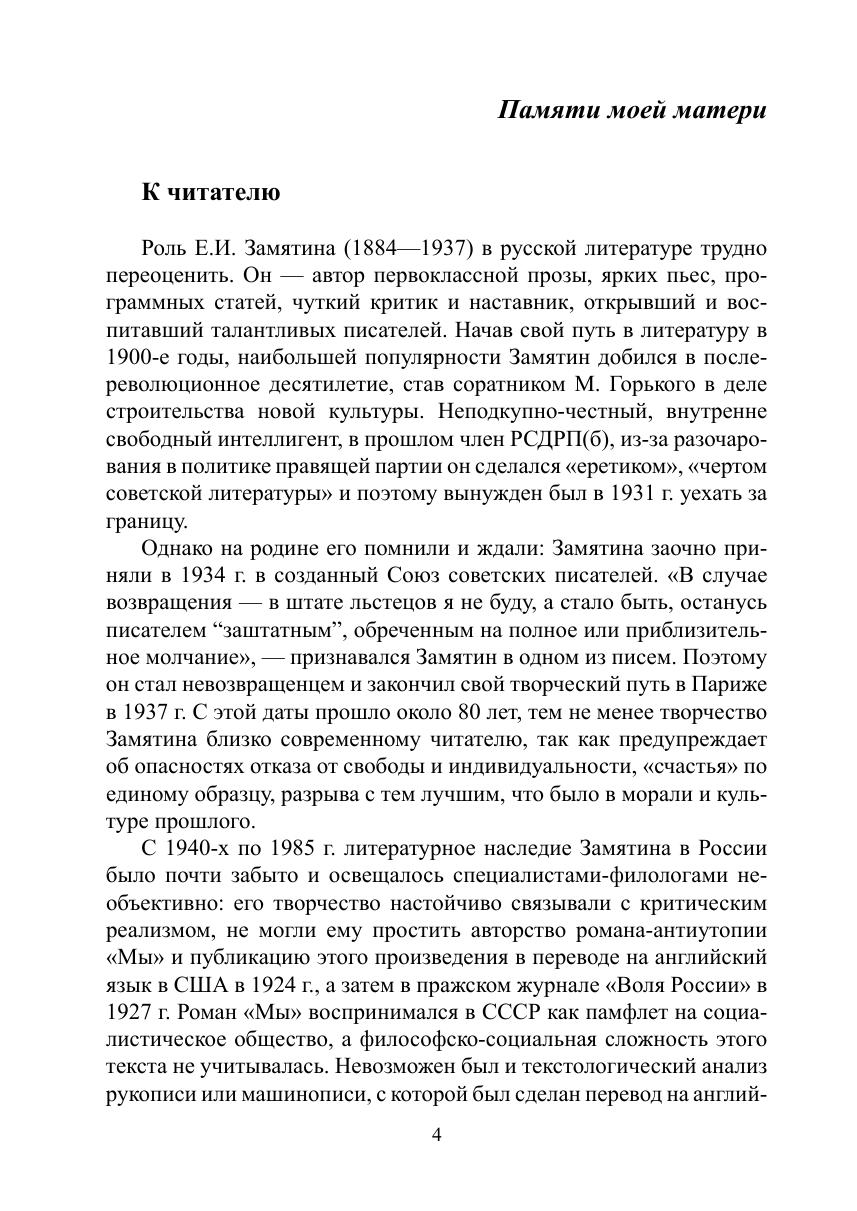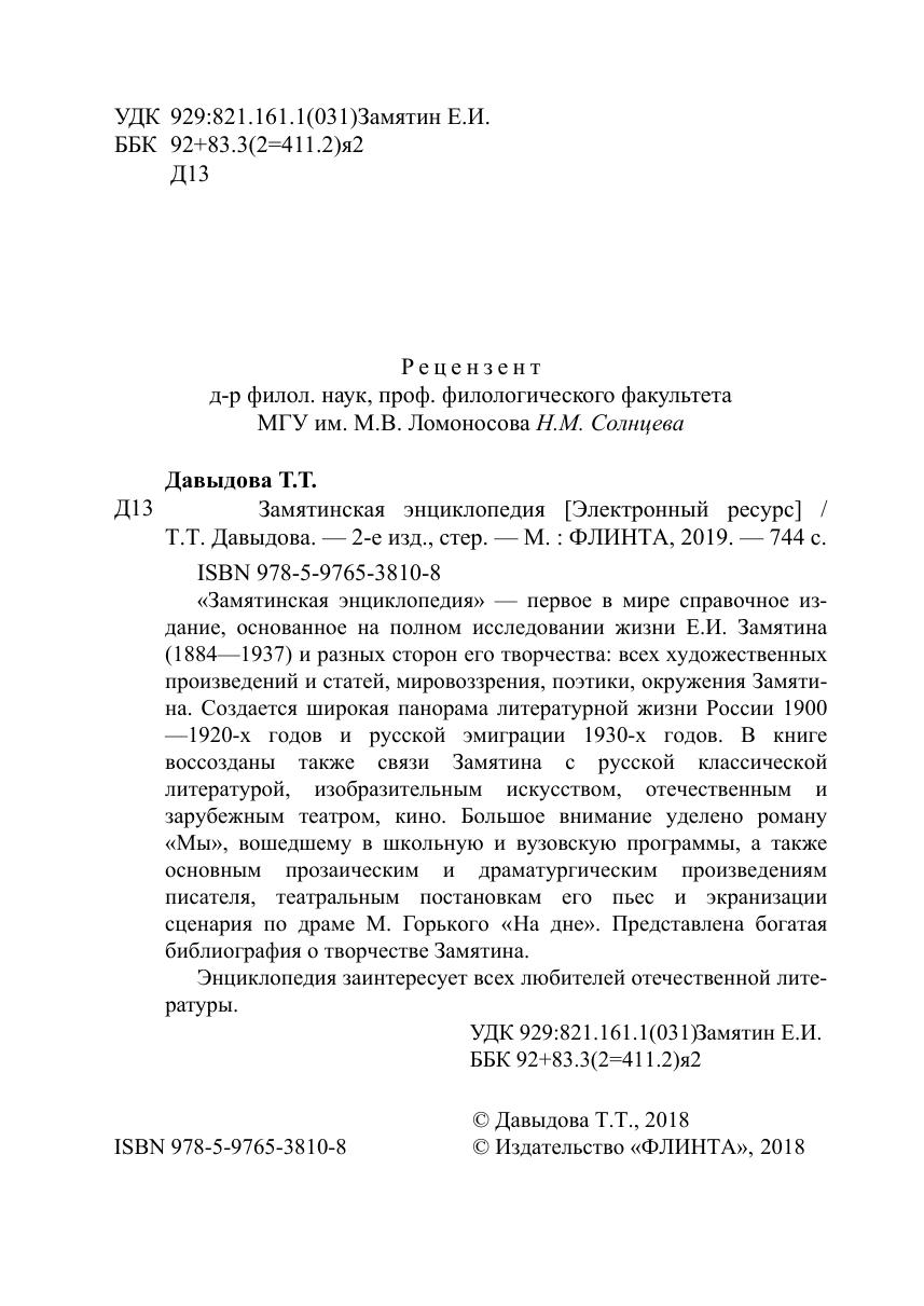 «Замятинская энциклопедия» — первое в мире справочное издание, основанное на полном исследовании жизни Е.И. Замятина (1884—1937) и разных сторон его творчества: всех художественных произведений и статей, мировоззрения, поэтики, окружения Замятина. Создается широкая панорама литературной жизни России 1900—1920-х годов и русской эмиграции 1930-х годов. В книге воссозданы также связи Замятина с русской классической литературой, изобразительным искусством, отечественным и зарубежным театром, кино. Большое внимание уделено роману «Мы», вошедшему в школьную и вузовскую программы, а также основным прозаическим и драматургическим произведениям писателя, театральным постановкам его пьес и экранизации сценария по драме М. Горького «На дне». Представлена богатая библиография о творчестве Замятина.