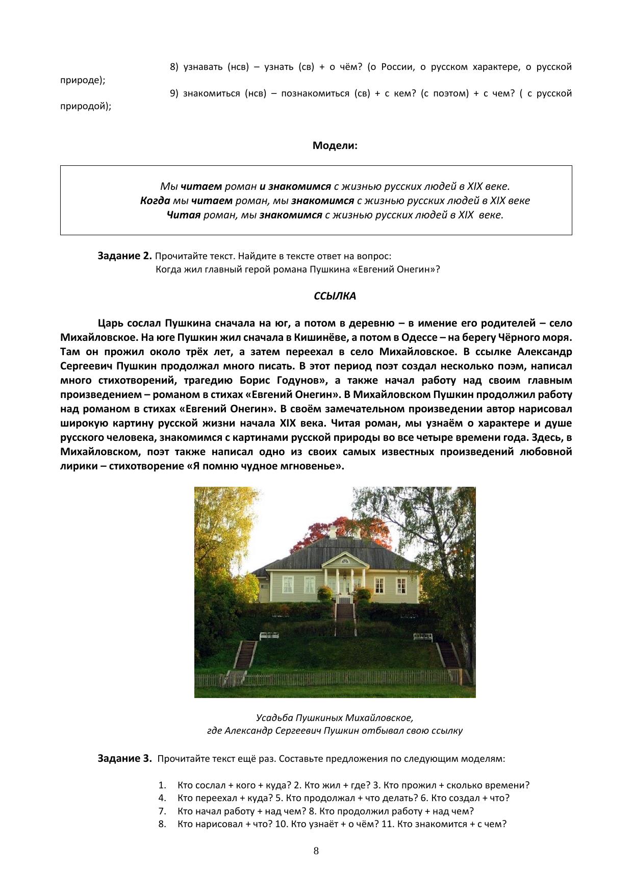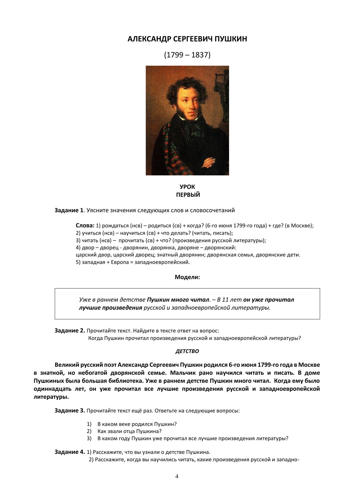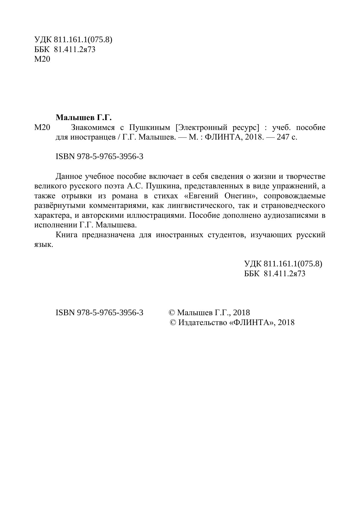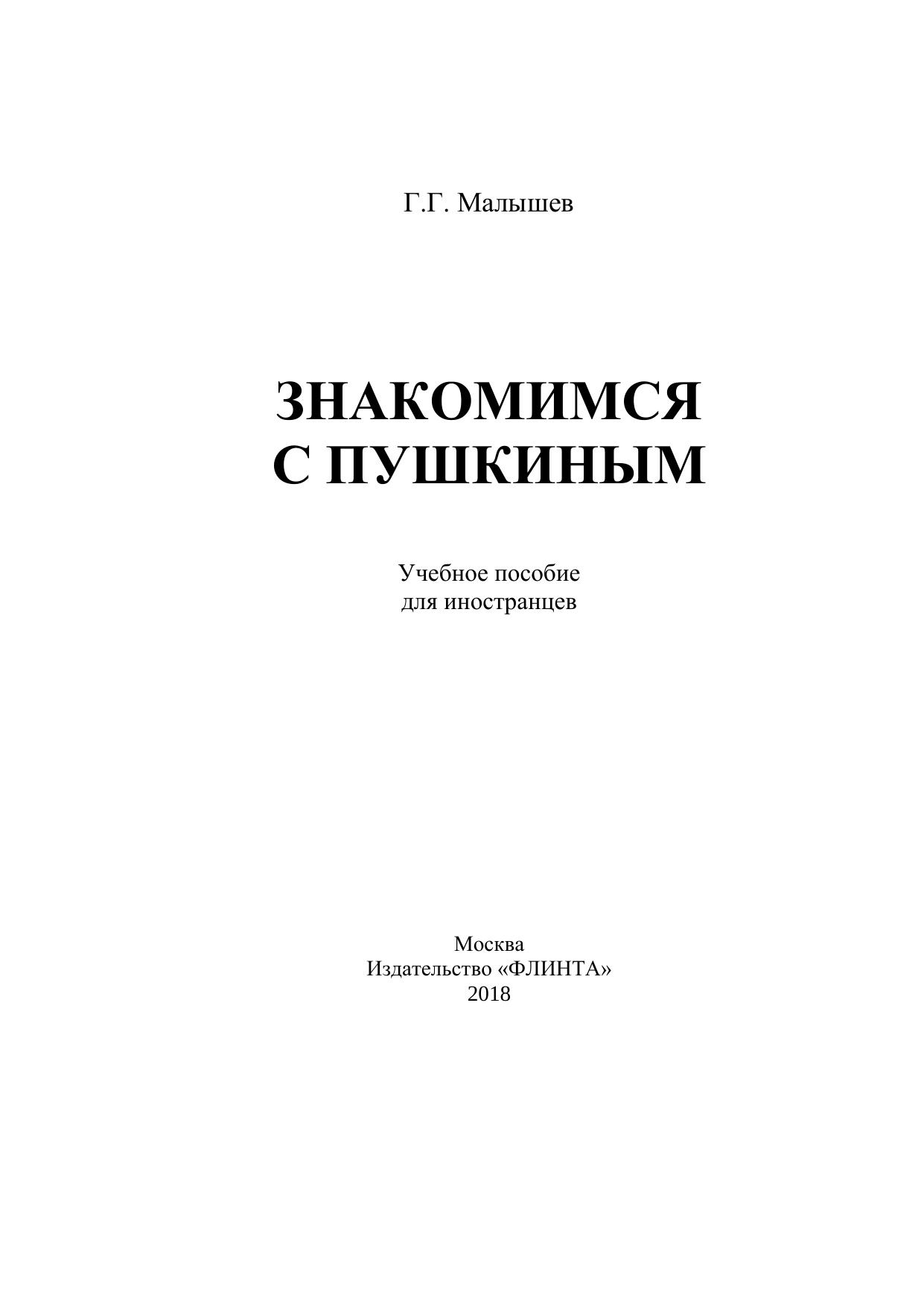 Данное учебное пособие включает в себя сведения о жизни и творчестве великого русского поэта А.С. Пушкина, представленных в виде упражнений, а также отрывки из романа в стихах «Евгений Онегин», сопровождаемые развёрнутыми комментариями, как лингвистического, так и страноведческого характера, и авторскими иллюстрациями. Пособие дополнено аудиозаписями в исполнении Г.Г. Малышева.