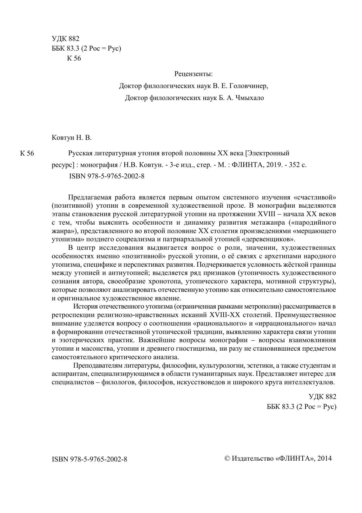 Предлагаемая работа является первым опытом системного изучения «счастливой» (позитивной) утопии в современной художественной прозе. В монографии выделяются этапы становления русской литературной утопии на протяжении XVIII – начала XX веков с тем, чтобы выяснить особенности и динамику развития метажанра («пародийного жанра»), представленного во второй половине ХХ столетия произведениями «мерцающего утопизма» позднего соцреализма и патриархальной утопией «деревенщиков».