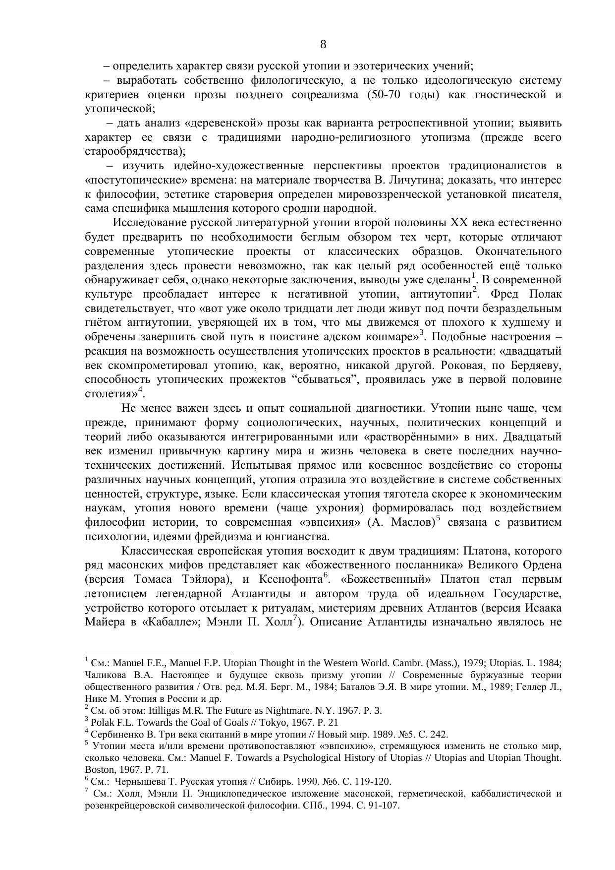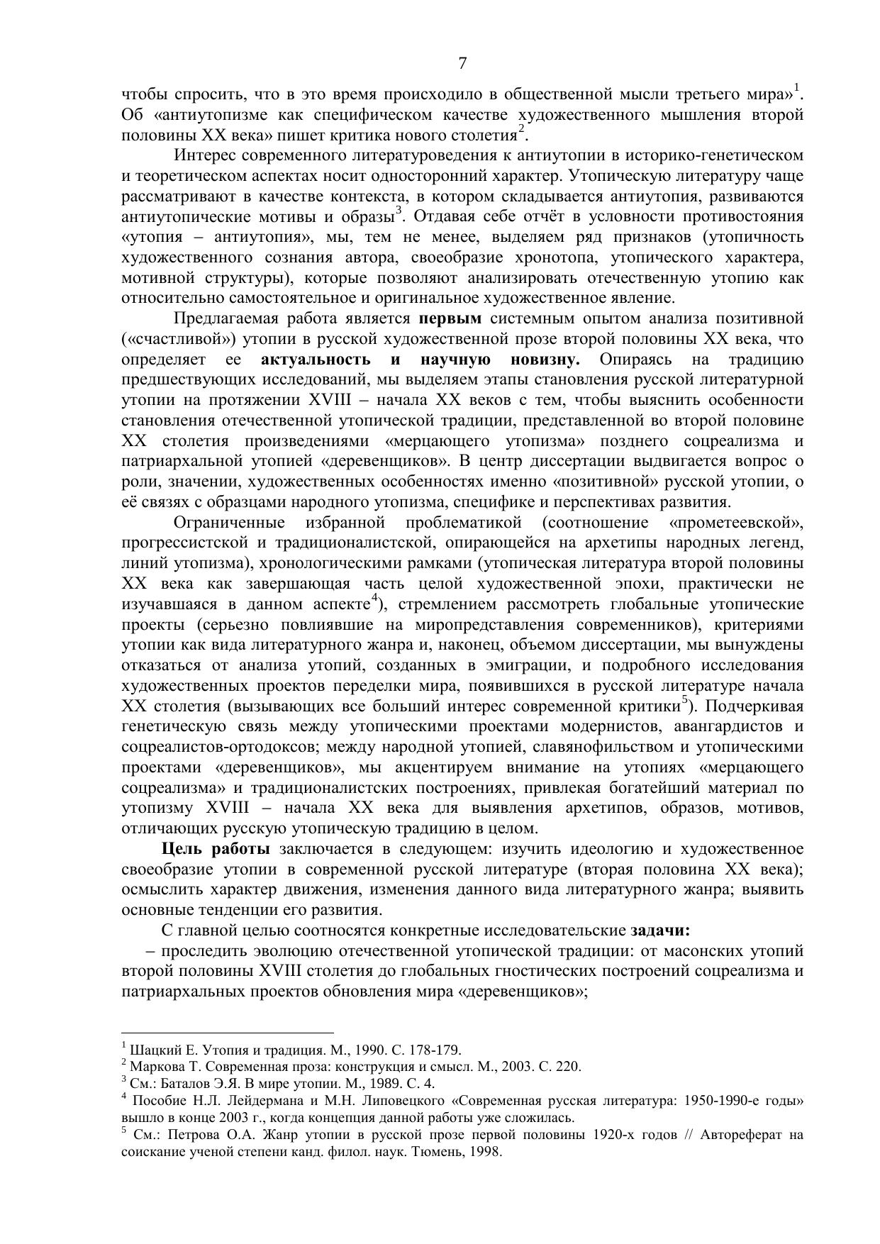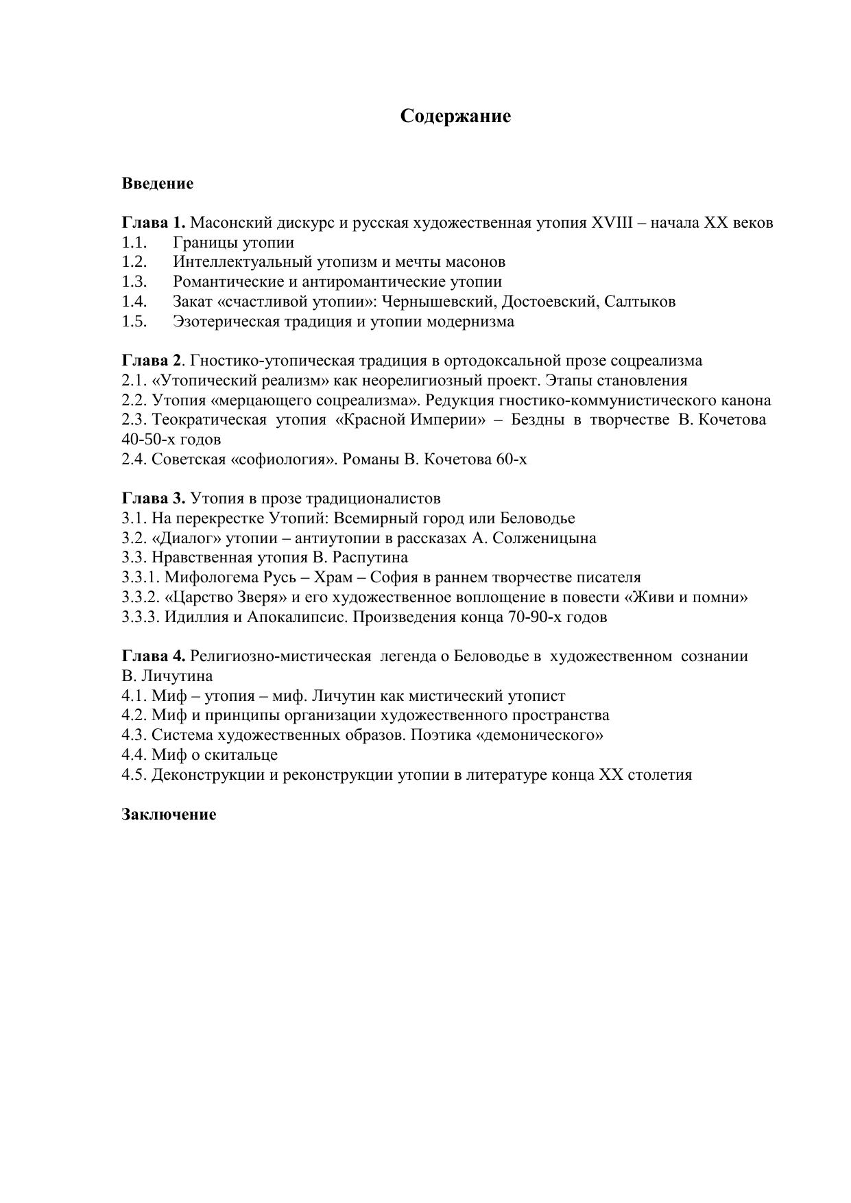 В центр исследования выдвигается вопрос о роли, значении, художественных особенностях именно «позитивной» русской утопии, о её связях с архетипами народного утопизма, специфике и перспективах развития. Подчеркивается условность жёсткой границы между утопией и антиутопией; выделяется ряд признаков (утопичность художественного сознания автора, своеобразие хронотопа, утопического характера, мотивной структуры), которые позволяют анализировать отечественную утопию как относительно самостоятельное и оригинальное художественное явление.