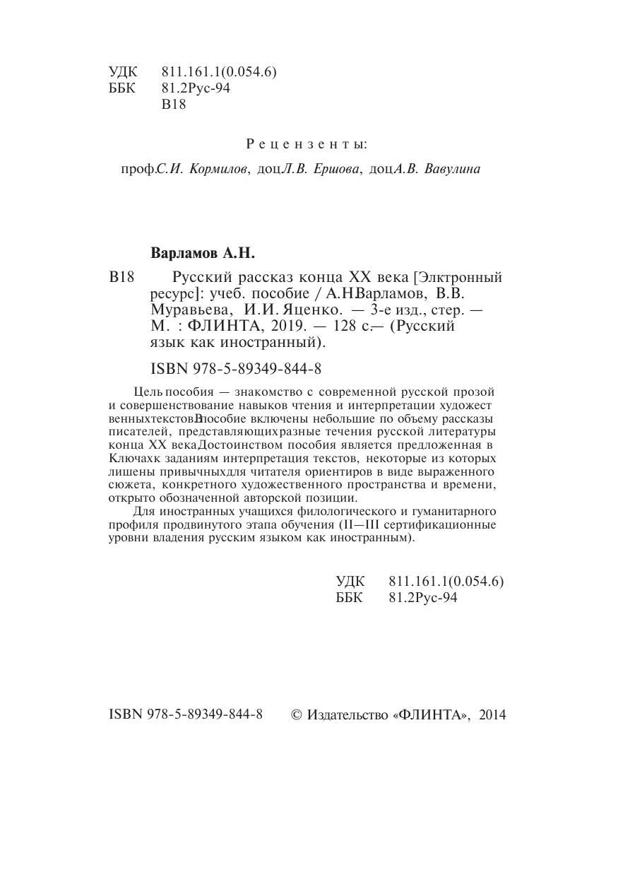 Цель пособия — знакомство с современной русской прозой и совершенствование навыков чтения и интерпритации художественных текстов. В пособие включены ннебольшие по объему рассказы писателей, представляющих разные течения русской литературы концв ХХ века. Достоинством пособия является предложеннаяв Ключах к заданияминтерпритации текстов, некоторые из которых лишены привычных для читателя ориентиров в виде выраженного сюжета, конкретного художественного пространства и времени, открыто обозначенной авторской позиции. Для иностранных учащихся филологического и гуманитарного профиля продвинутого этапа обучения (II—III сертифицированные уровни владения русским языком как иностранным).