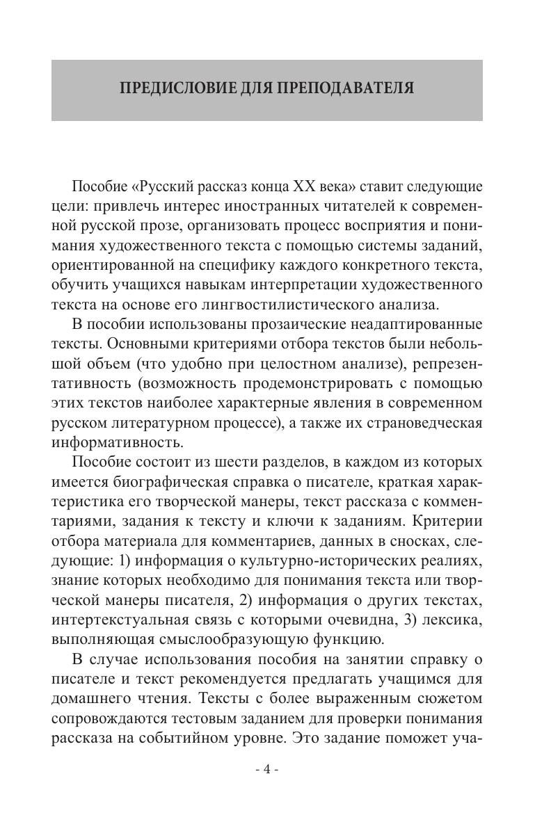 Цель пособия знакомство с современной русской прозой и совершенствование навыков чтения и интерпретации художественных текстов. В пособие включены небольшие по объему рассказы писателей, представляющих разные течения русской литературы конца ХХ века. Достоинством пособия является предложенная в «Ключах к заданиям» интерпретация текстов, некоторые из которых лишены привычных для читателей ориентиров в виде выраженного сюжета, конкретного художественного пространства и времени, открыто обозначенной авторской позиции. Для иностранных учащихся филологического и гуманитарного профиля продвинутого этапа обучения (уровни В2-С1).