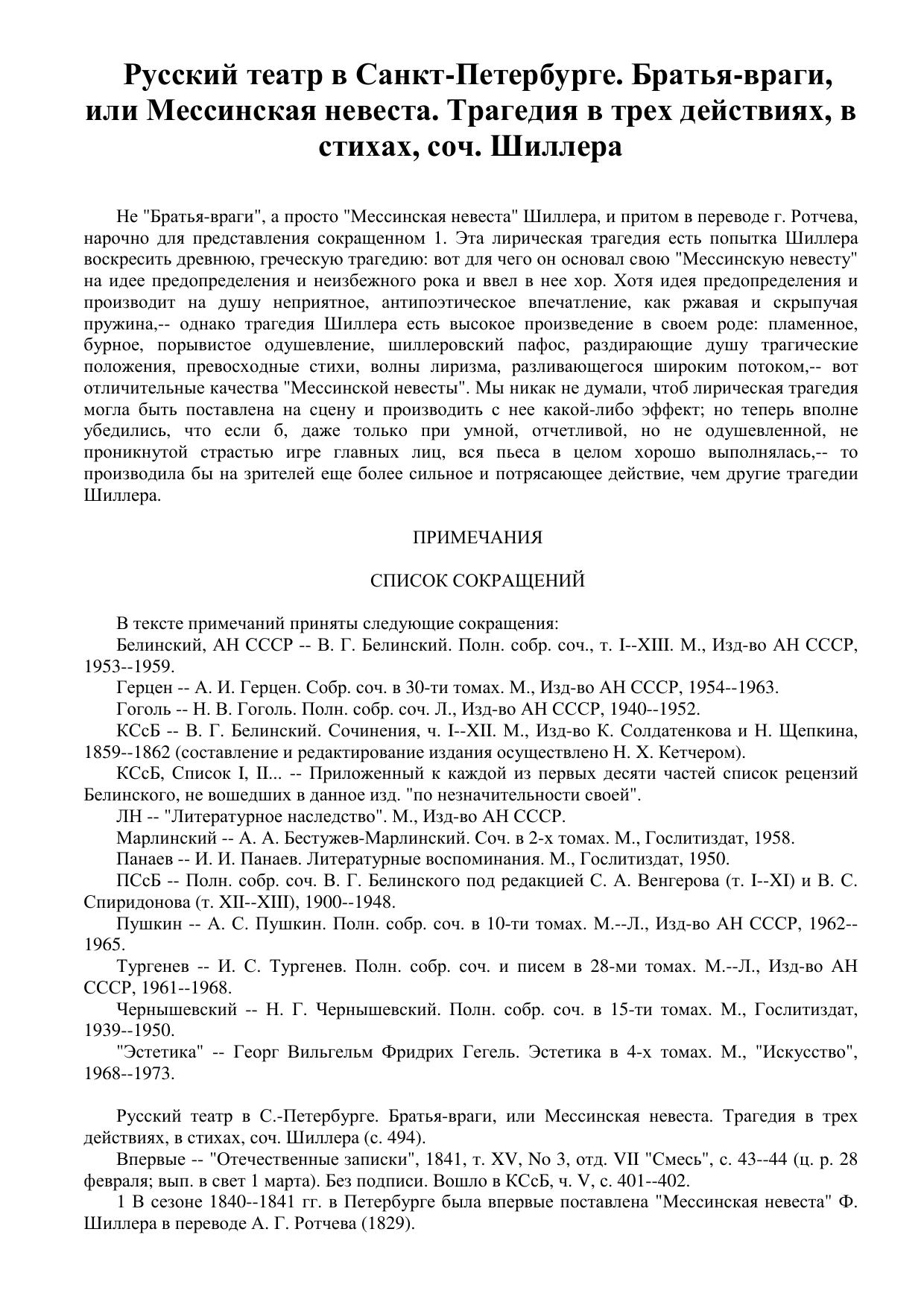Русский театр в С.-Петербурге. Братья-враги, или Мессинская невеста. Трагедия в трех действиях, в стихах, соч. Шиллера