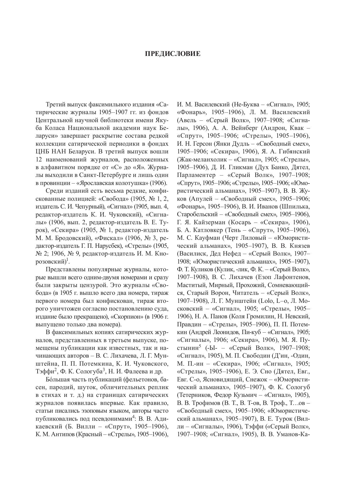 Третий выпуск продолжает серию издания, посвященного сатирическим журналам 1905–1907 гг. из фондов Центральной научной библиотеки имени Якуба Коласа Национальной академии наук Беларуси. Содержит факсимильные копии 12 наименований журналов, расположенных в алфавитном порядке от «С» до «Я». Адресуется историкам, литераторам, художникам, работникам библиотек и музеев, а также всем, кто интересуется духовным наследием прошлого.