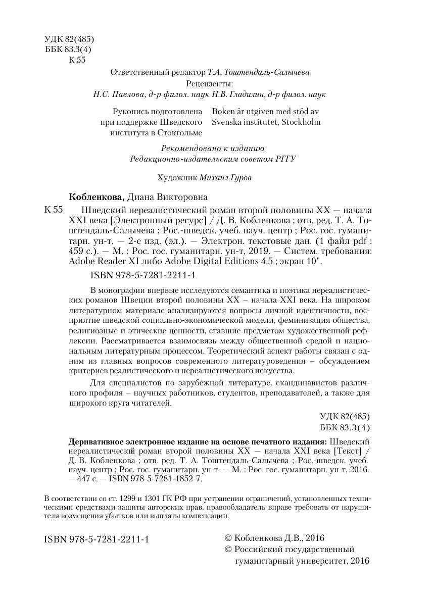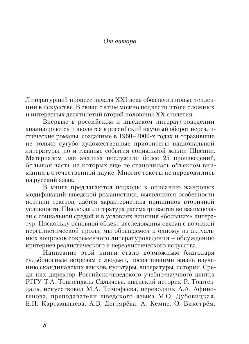 В монографии впервые исследуются семантика и поэтика нереалистических романов Швеции второй половины ХХ — начала ХХI века. На широком литературном материале анализируются вопросы личной идентичности, восприятие шведской социально-экономической модели, феминизация общества, религиозные и этические ценности, ставшие предметом художественной рефлексии. Рассматривается взаимосвязь между общественной средой и национальным литературным процессом. Теоретический аспект работы связан с одним из главных вопросов современного литературоведения — обсуждением критериев реалистического и нереалистического искусства. Для специалистов по зарубежной литературе, скандинавистов различного профиля — научных работников, студентов, преподавателей, а также для широкого круга читателей.