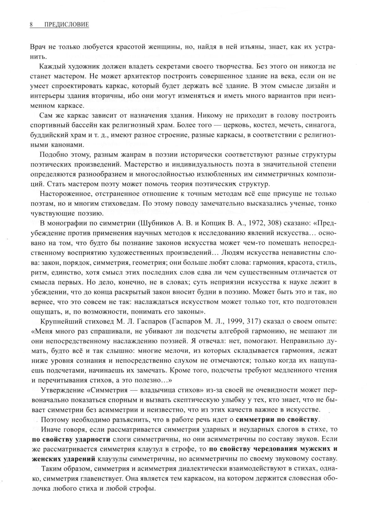 В монографии впервые показано, что каждое слово, каждый стих и каждое стихотворение подчинены невидимым законам симметрии, впервые найден универсальной способ преобразования кратко живущей и исчезающей во времени последовательности звуков в пространственную симметричную фигуру. Эта основополагающая закономерность продемонстрирована на многих поэтических образцах – от классики до верлибра. Выявленная симметричность стиховых структур позволяет пересмотреть как теорию, так и некоторые постулаты стихотворчества, комбинаторно построить строгую периодическую систему многих тысяч возможных поэтических структур, показать законы порождения ритмических семейств и межстиховой сочетаемости ритмических строк, создать простые методики анализа архитектоники и ритмической композиции стихотворений. Непротиворечивость теории симметризма фактам поэтической практики убедит читателя в истинности утверждения, поставленного в названии книги. Книга полезна поэтам, стиховедам, переводчикам, всем любителям поэзии и тем, кого интересуют проблемы единства законов мироздания в природе и искусстве.