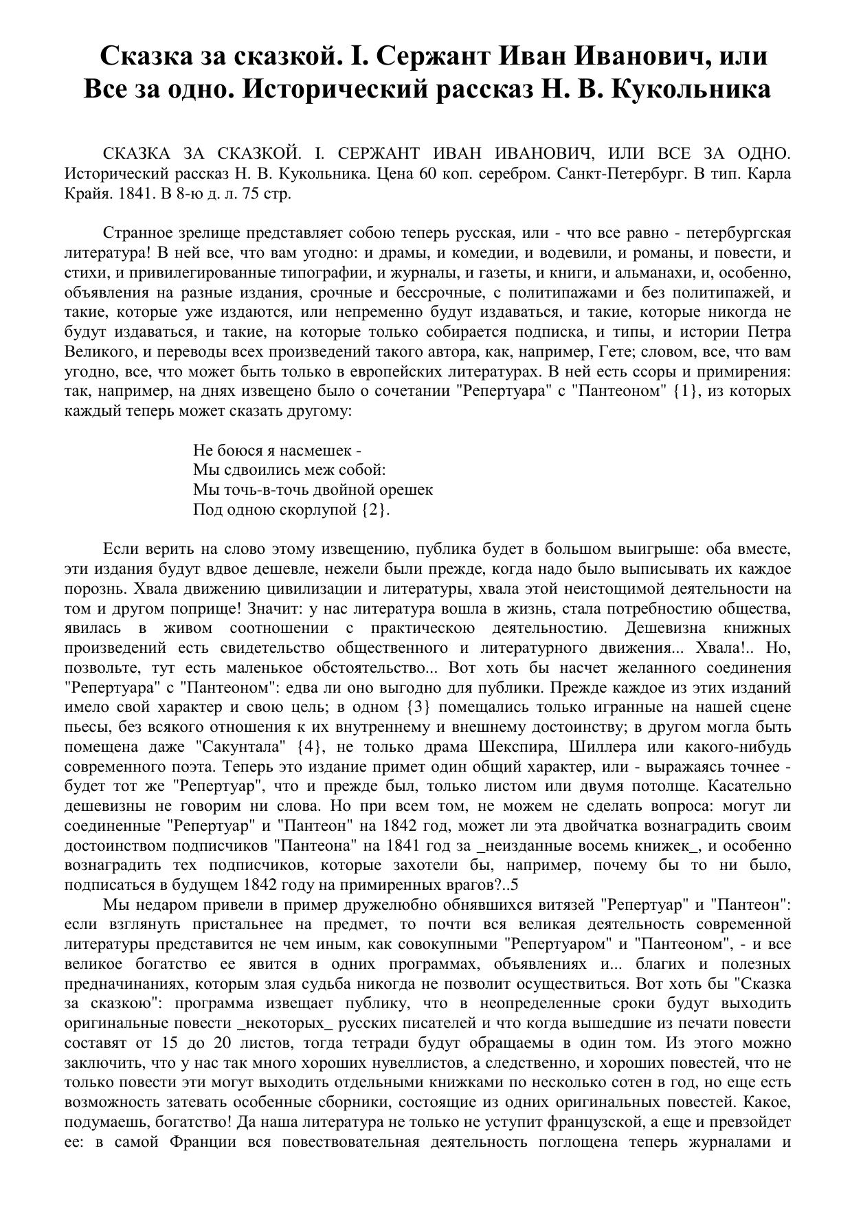 Сказка за сказкой. I. Сержант Иван Иванович, или Все за одно. Исторический рассказ Н. В. Кукольника