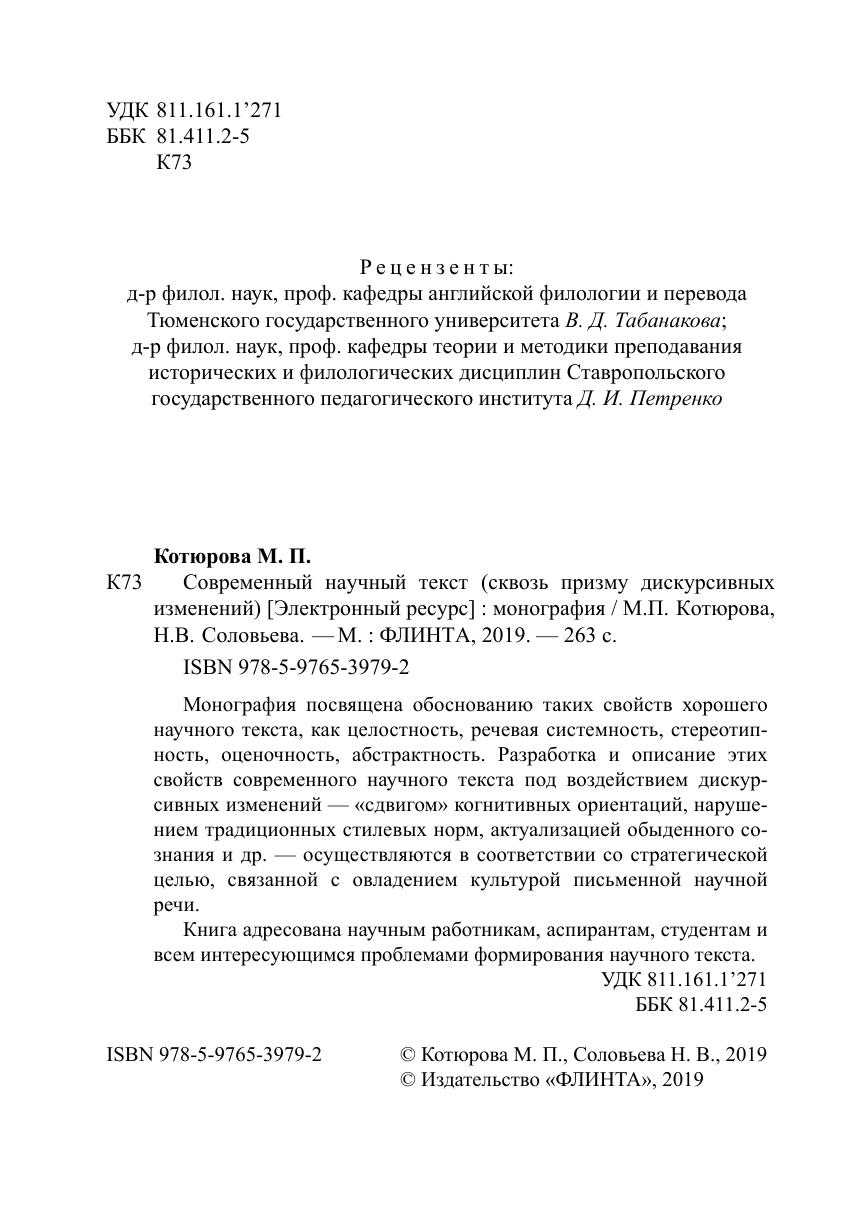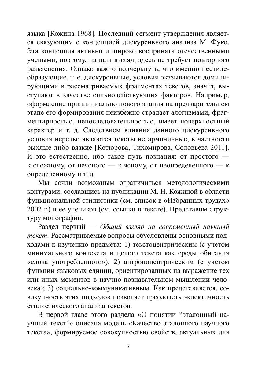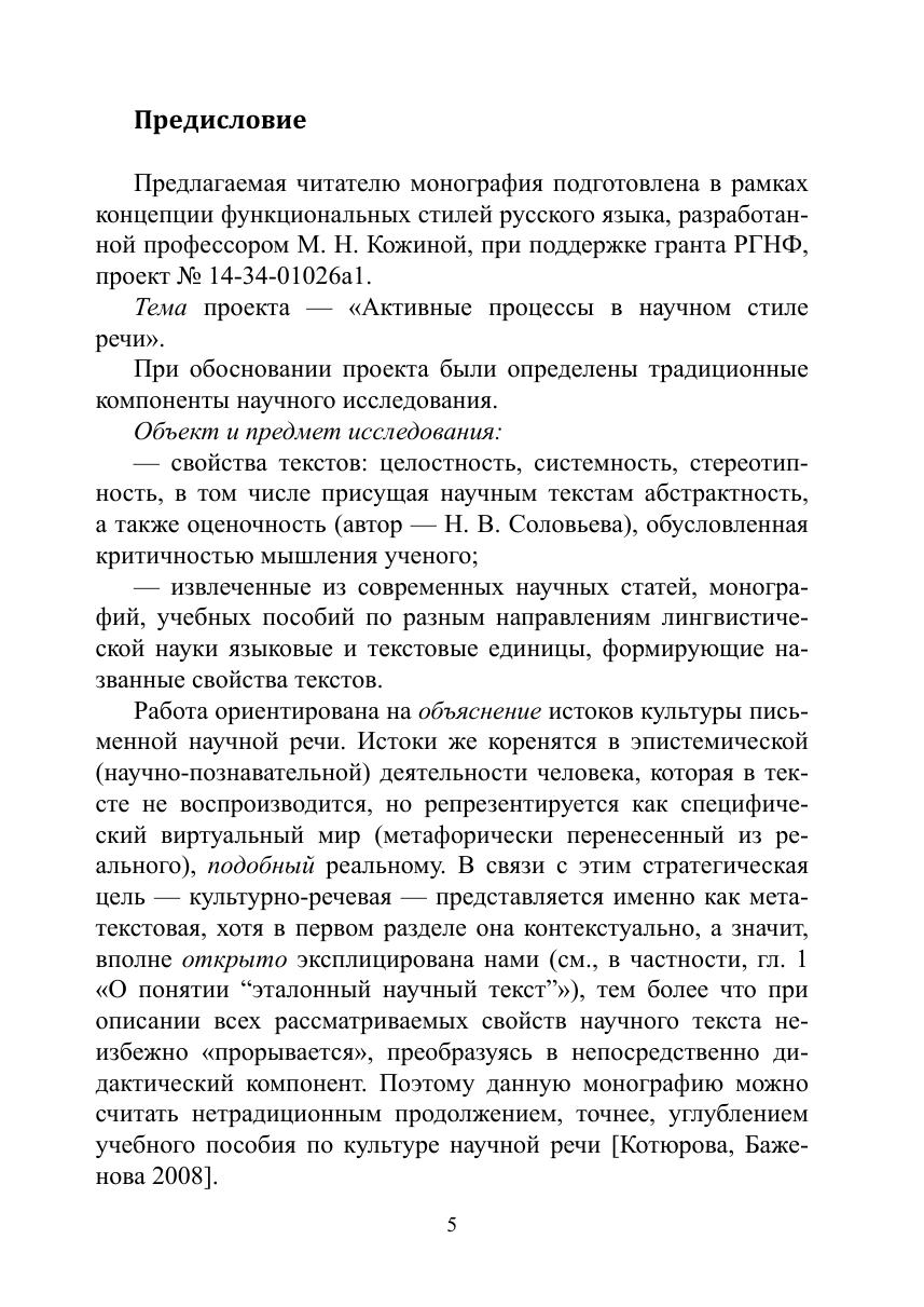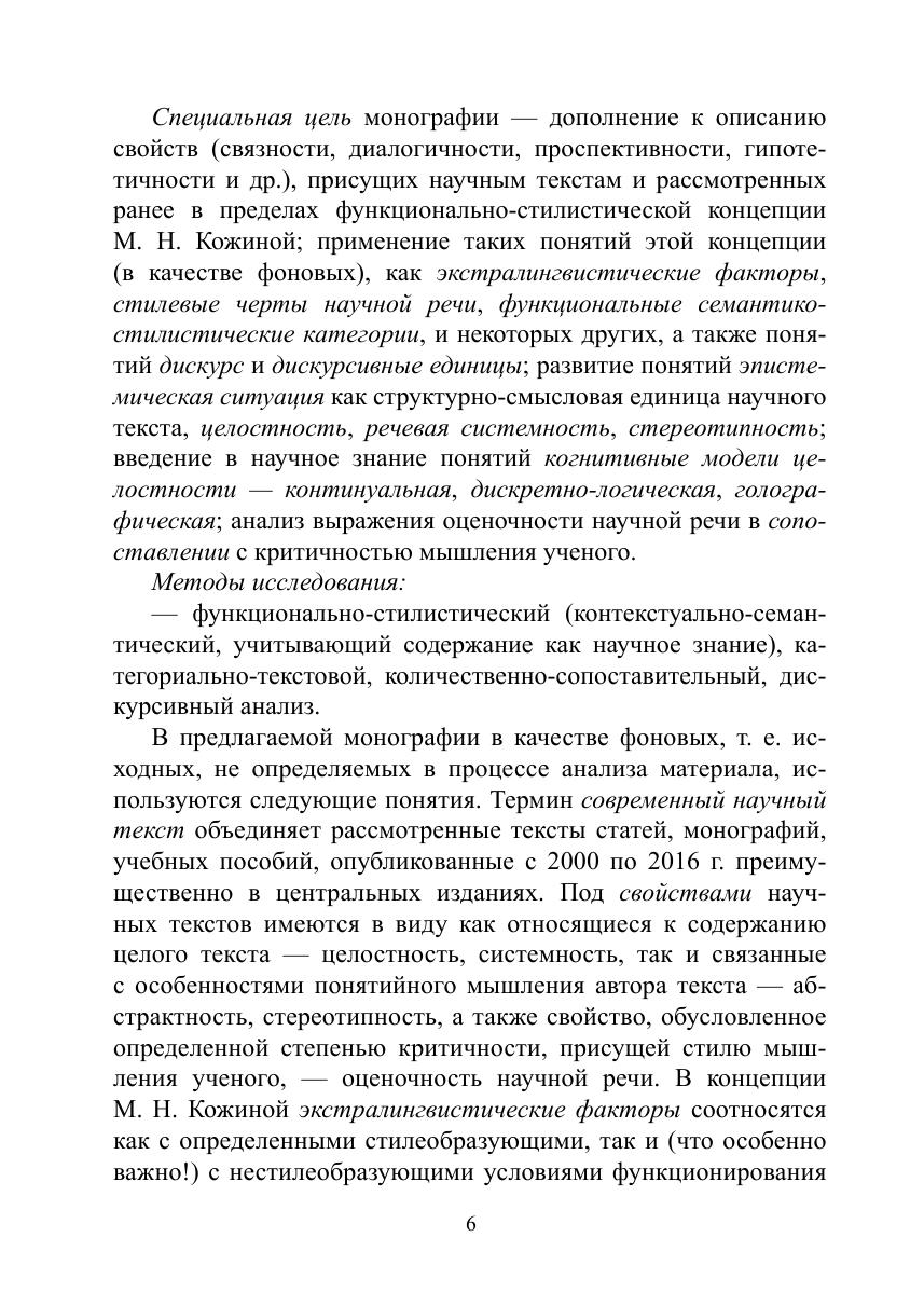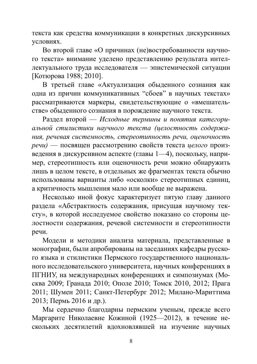 Монография посвящена обоснованию таких свойств хорошего научного текста, как целостность, речевая системность, стереотипность, оценочность, абстрактность. Разработка и описание этих свойств современного научного текста под воздействием дискурсивных изменений — «сдвигом» когнитивных ориентаций, нарушением традиционных стилевых норм, актуализацией обыденного сознания и др. — осуществляются в соответствии со стратегической целью, связанной с овладением культурой письменной научной речи.
