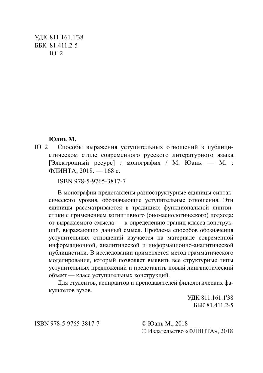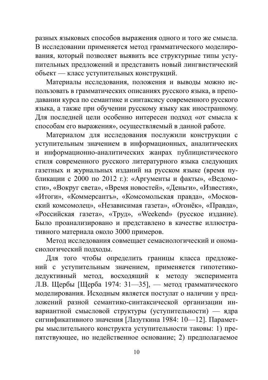 В монографии представлены разноструктурные единицы синтаксического уровня, обозначающие уступительные отношения. Эти единицы рассматриваются в традициях функциональной лингвистики с применением когнитивного (ономасиологического) подхода: от выражаемого смысла — к определению границ класса конструкций, выражающих данный смысл. Проблема способов обозначения уступительных отношений изучается на материале современной информационной, аналитической и информационно-аналитической публицистики. В исследовании применяется метод грамматического моделирования, который позволяет выявить все структурные типы уступительных предложений и представить новый лингвистический