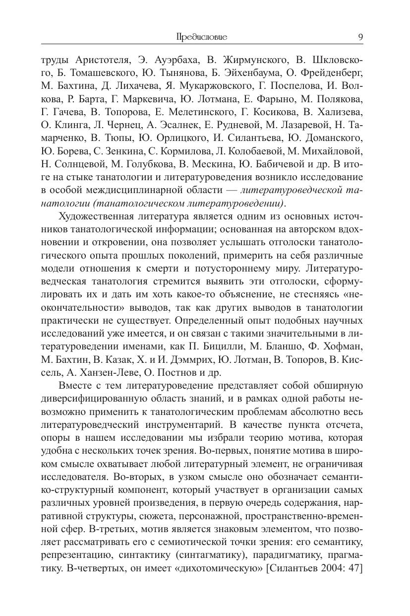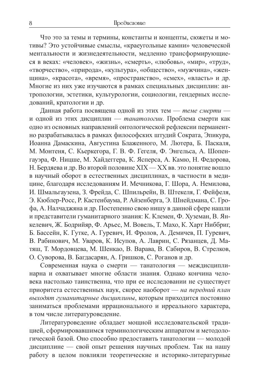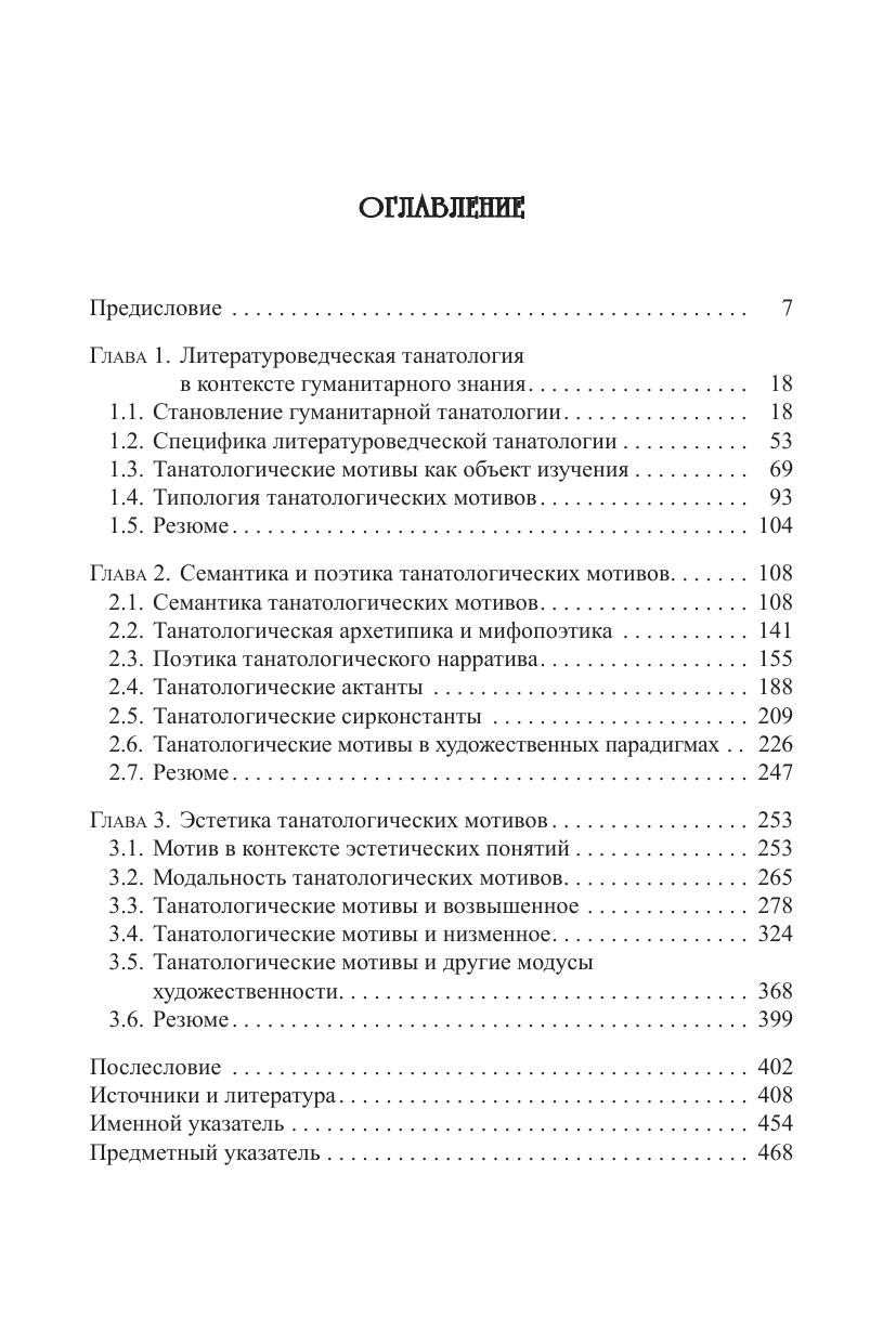 Монография представляет собой комплексное исследование функционирования танатологических мотивов в художественной литературе. Опираясь на богатые традиции изучения проблемы смерти в гуманитарной танатологии и литературоведении, автор выделяет специфическую область знания – литературоведческую танатологию, призванную выявлять и систематизировать танатологические элементы в литературе. Точкой отсчета для литературоведческих изысканий в этой сфере выбирается теория мотива, позволяющая сконцентрировать внимание на роли одного компонента текста в организации произведения, авторской творческой системы и даже исторически обусловленной художественной парадигмы. Логика исследования продиктована семиотическим подходом к мотивному анализу: изучаются семантика, синтактика и прагматика танатологических элементов. В контексте данных областей знака рассматриваются особенности репрезентации танатологических мотивов, их участие в организации сюжета, в создании образов персонажей, взаимодействие с различными художественными парадигмами, эстетическими категориями и т. д. Книга адресована филологам, философам, культурологам и всем, кто интересуется вопросами литературоведения и гуманитарной танатологии.