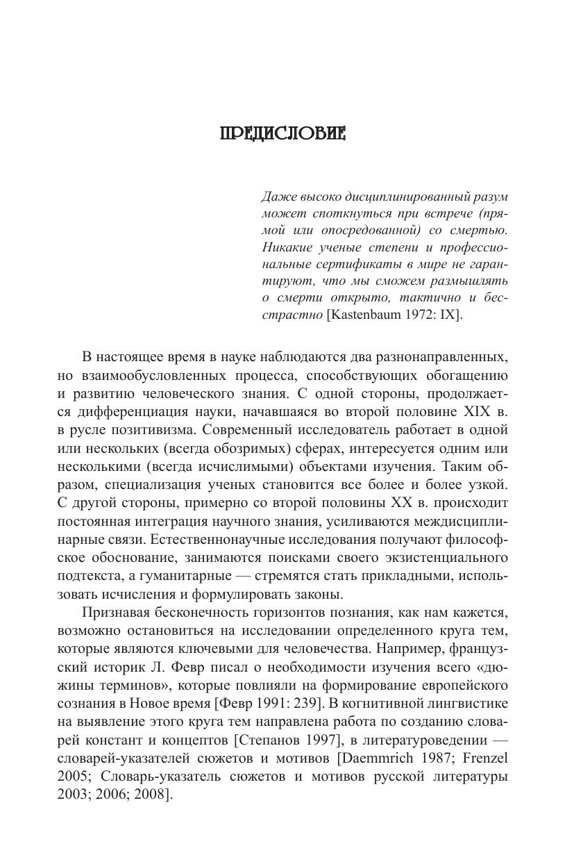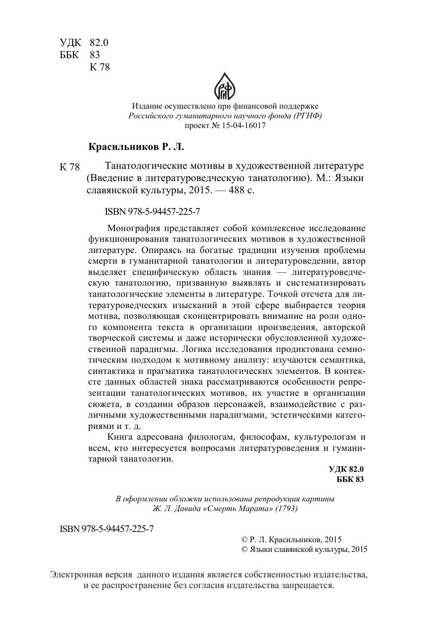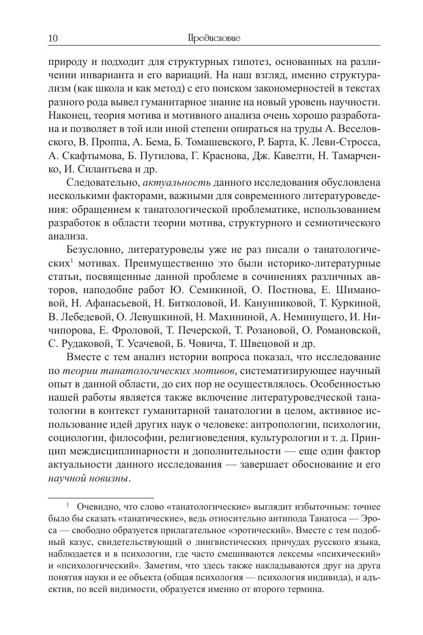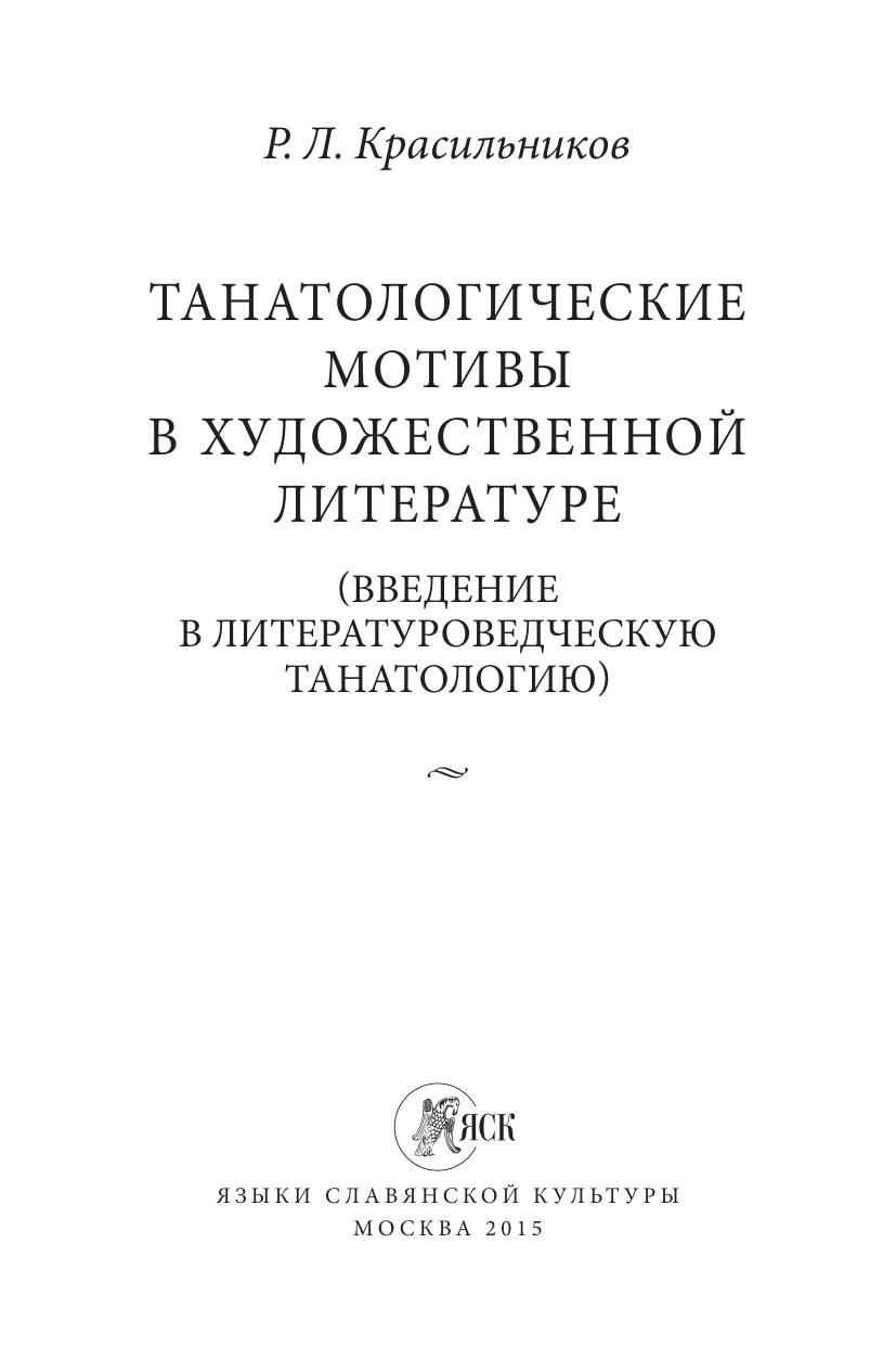 Монография представляет собой комплексное исследование функционирования танатологических мотивов в художественной литературе. Опираясь на богатые традиции изучения проблемы смерти в гуманитарной танатологии и литературоведении, автор выделяет специфическую область знания – литературоведческую танатологию, призванную выявлять и систематизировать танатологические элементы в литературе. Точкой отсчета для литературоведческих изысканий в этой сфере выбирается теория мотива, позволяющая сконцентрировать внимание на роли одного компонента текста в организации произведения, авторской творческой системы и даже исторически обусловленной художественной парадигмы. Логика исследования продиктована семиотическим подходом к мотивному анализу: изучаются семантика, синтактика и прагматика танатологических элементов. В контексте данных областей знака рассматриваются особенности репрезентации танатологических мотивов, их участие в организации сюжета, в создании образов персонажей, взаимодействие с различными художественными парадигмами, эстетическими категориями и т. д. Книга адресована филологам, философам, культурологам и всем, кто интересуется вопросами литературоведения и гуманитарной танатологии.