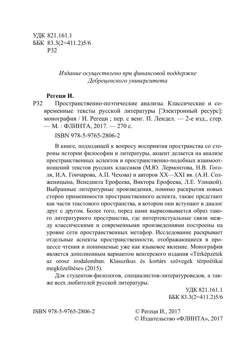 В книге, подходящей к вопросу восприятия пространства со стороны истории философии и литературы, акцент делается на анализе пространственных аспектов и пространственно-подобных взаимоотношений текстов русских классиков (М.Ю. Лермонтова, Н.В. Гоголя, И.А. Гончарова, А.П. Чехова) и авторов XX—XXI вв. (А.И. Солженицына, Венедикта Ерофеева, Виктора Ерофеева, Л.Е. Улицкой). Выбранные литературные произведения, помимо раскрытия новых сторон применимости пространственного аспекта, также предстают как части текстового пространства, в котором они вступают в диалог друг с другом. Более того, перед нами вырисовывается образ такого литературного пространства, где интертекстуальные связи между классическими и современными произведениями построены на уровне сети пространственных метафор. Исследование раскрывает отдельные аспекты пространственности, отображающиеся в процессе чтения и понимаемые уже как языковое явление. Монография является дополненным вариантом венгерского издания «T?rk?pzetek az orosz irodalomban. Klasszikus ?s kort?rs sz?vegek t?rpo?tikai megk?zel?t?se» (2015).