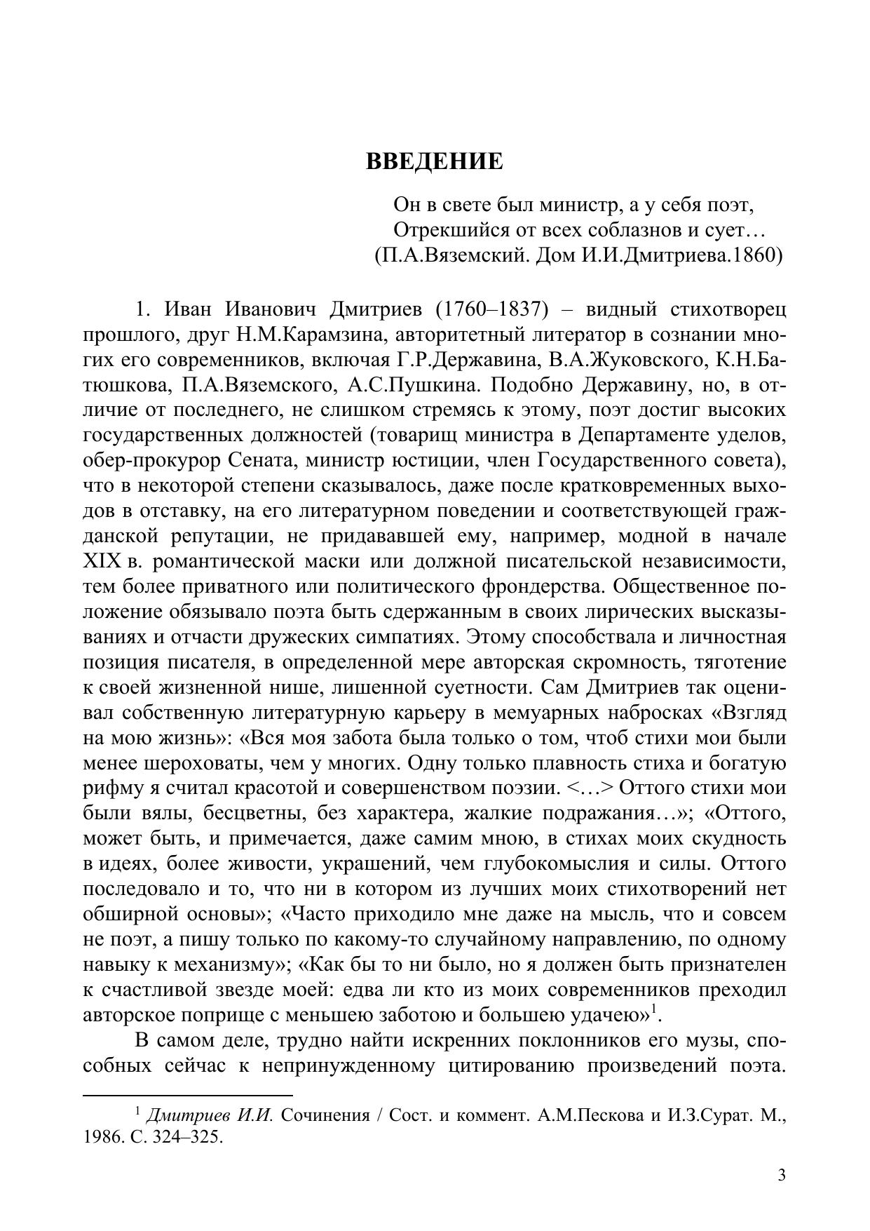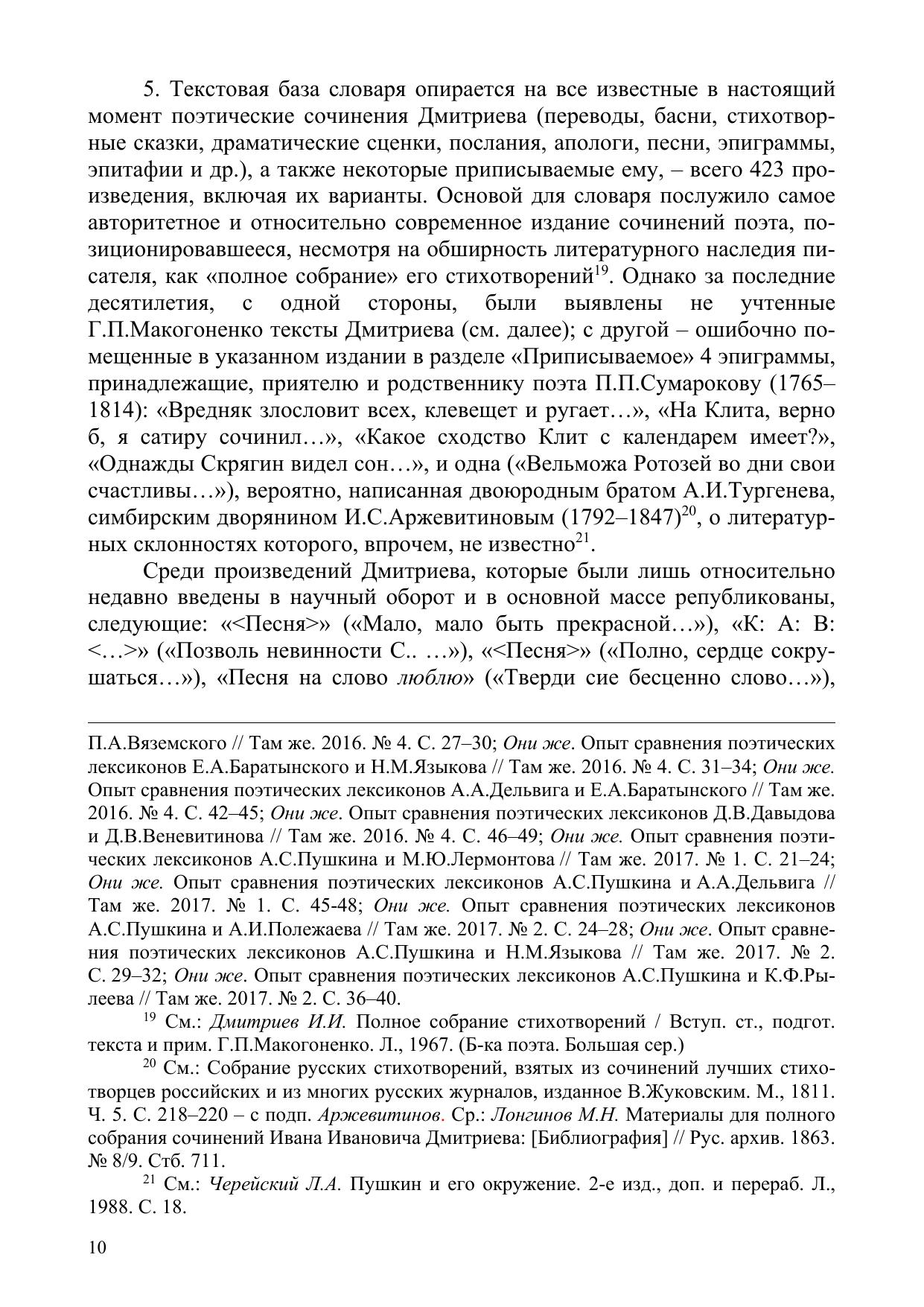 Словарь является первым опытом лексикографического описания языка поэта И. И. Дмитриева (1760–1837). Он включает три раздела: теоретическое введение, где рассматриваются вопросы литературного наследия писателя, делаются выводы относительно количественно-качественной структуры его поэтического языка; алфавитно-частотный указатель лексем и онимов, отмеченных в произведениях автора; рейтинг наиболее употребительных слов. В словаре толкуются устаревшие, редкие и окказиональные лексемы, поясняются непонятные имена, мифологизмы, даются указания на фразеологические связи слов и другие их контекстно-функциональные характеристики.