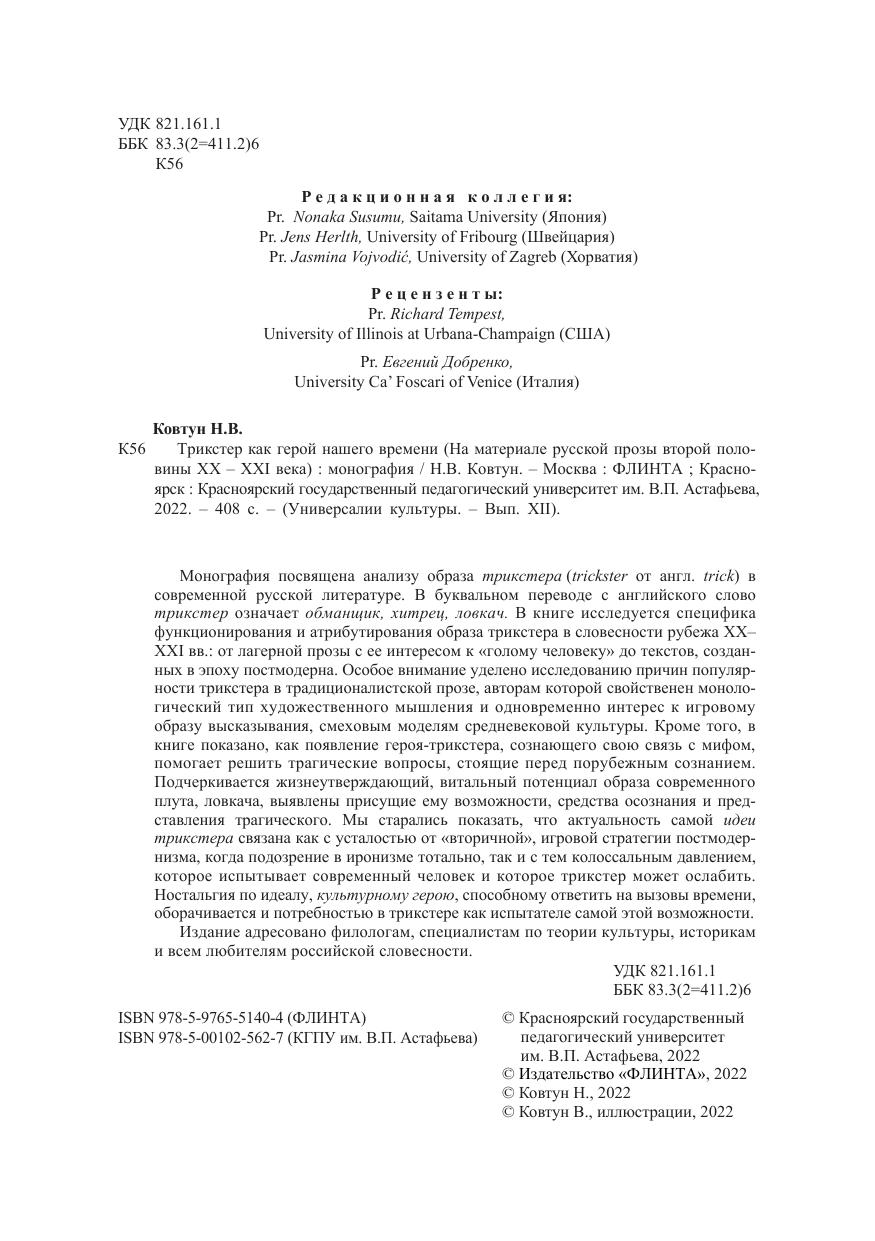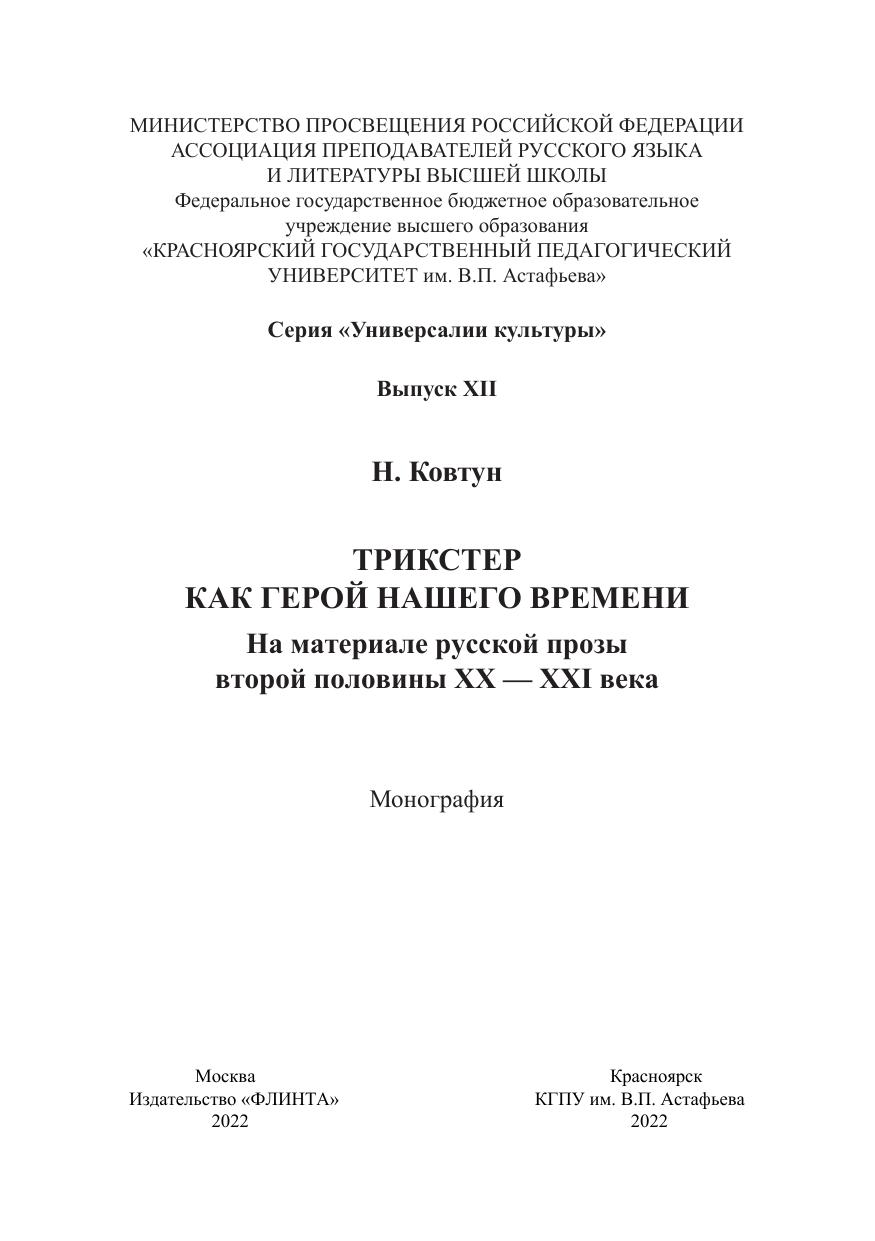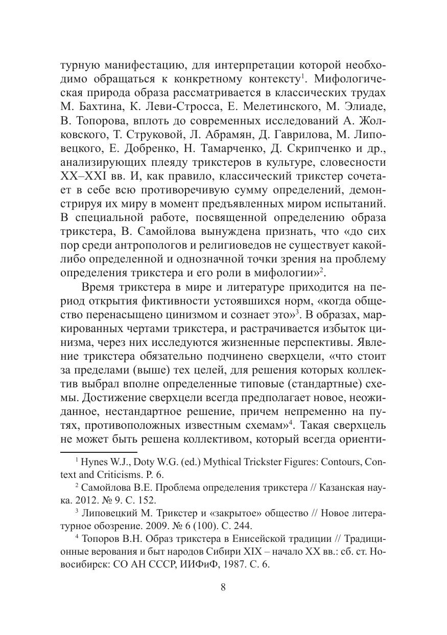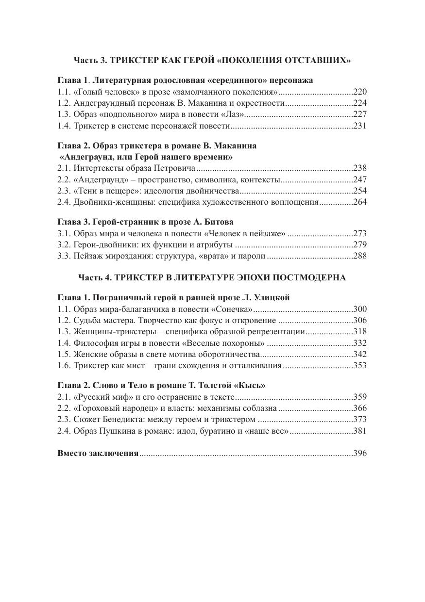 Монография посвящена анализу образа трикстера (trickster от англ. trick) в современной русской литературе. В буквальном переводе с английского слово трикстер означает обманщик, хитрец, ловкач. В книге исследуется специфика функционирования и атрибутирования образа трикстера в словесности рубежа ХХ–ХХI вв.: от лагерной прозы с ее интересом к «голому человеку» до текстов, созданных в эпоху постмодерна. Особое внимание уделено исследованию причин популярности трикстера в традиционалистской прозе, авторам которой свойственен монологический тип художественного мышления и одновременно интерес к игровому образу высказывания, смеховым моделям средневековой культуры. Кроме того, в книге показано, как появление героя-трикстера, сознающего свою связь с мифом, помогает решить трагические вопросы, стоящие перед порубежным сознанием. Подчеркивается жизнеутверждающий, витальный потенциал образа современного плута, ловкача, выявлены присущие ему возможности, средства осознания и представления трагического. Мы старались показать, что актуальность самой идеи трикстера связана как с усталостью от «вторичной», игровой стратегии постмодернизма, когда подозрение в иронизме тотально, так и с тем колоссальным давлением, которое испытывает современный человек и которое трикстер может ослабить. Ностальгия по идеалу, культурному герою, способному ответить на вызовы времени, оборачивается и потребностью в трикстере как испытателе самой этой возможности.