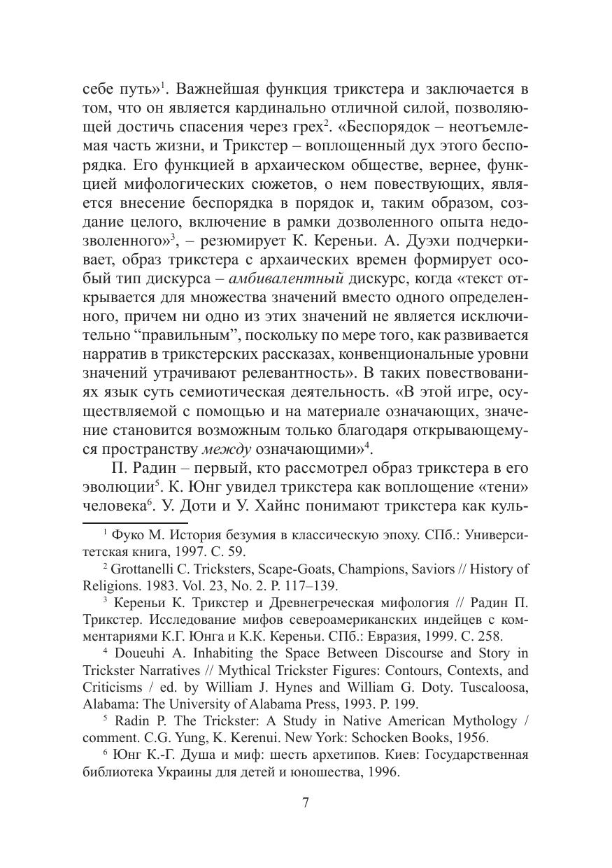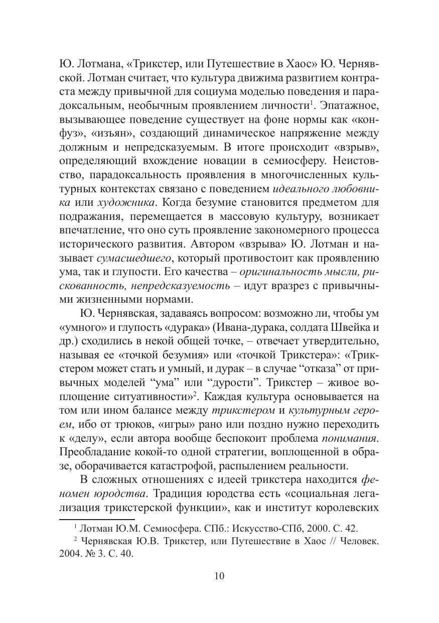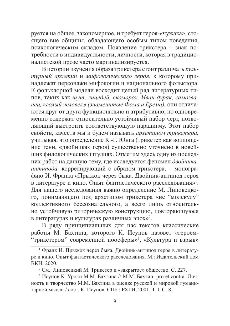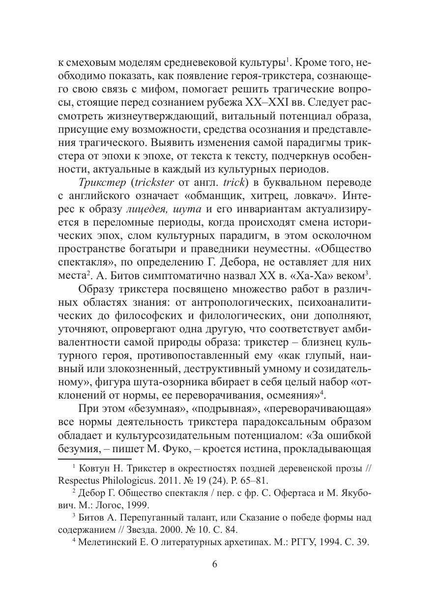 Монография посвящена анализу образа трикстера (trickster от англ. trick) в современной русской литературе. В буквальном переводе с английского слово трикстер означает обманщик, хитрец, ловкач. В книге исследуется специфика функционирования и атрибутирования образа трикстера в словесности рубежа ХХ–ХХI вв.: от лагерной прозы с ее интересом к «голому человеку» до текстов, созданных в эпоху постмодерна. Особое внимание уделено исследованию причин популярности трикстера в традиционалистской прозе, авторам которой свойственен монологический тип художественного мышления и одновременно интерес к игровому образу высказывания, смеховым моделям средневековой культуры. Кроме того, в книге показано, как появление героя-трикстера, сознающего свою связь с мифом, помогает решить трагические вопросы, стоящие перед порубежным сознанием. Подчеркивается жизнеутверждающий, витальный потенциал образа современного плута, ловкача, выявлены присущие ему возможности, средства осознания и представления трагического. Мы старались показать, что актуальность самой идеи трикстера связана как с усталостью от «вторичной», игровой стратегии постмодернизма, когда подозрение в иронизме тотально, так и с тем колоссальным давлением, которое испытывает современный человек и которое трикстер может ослабить. Ностальгия по идеалу, культурному герою, способному ответить на вызовы времени, оборачивается и потребностью в трикстере как испытателе самой этой возможности.