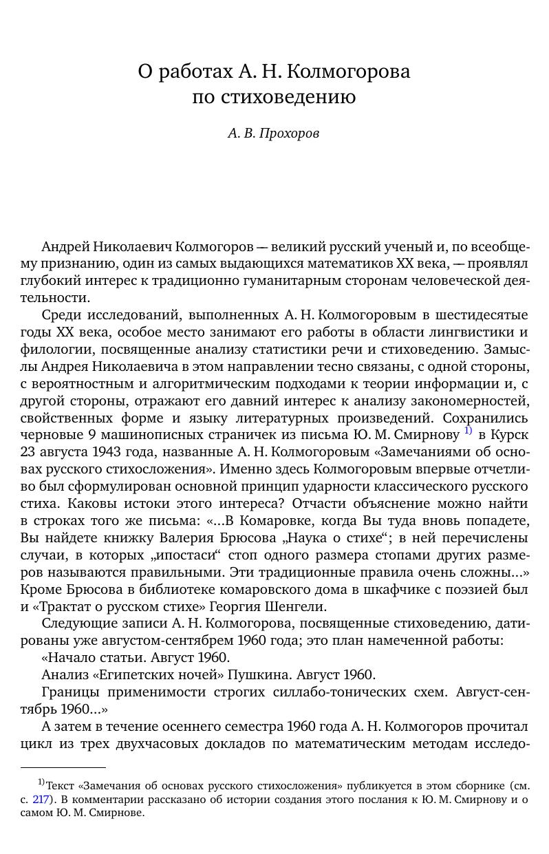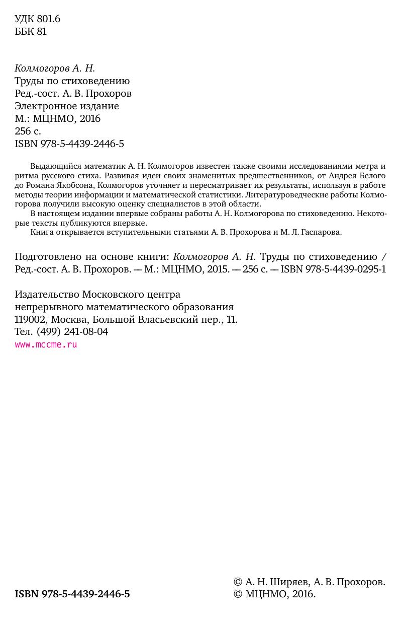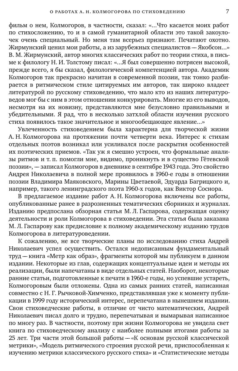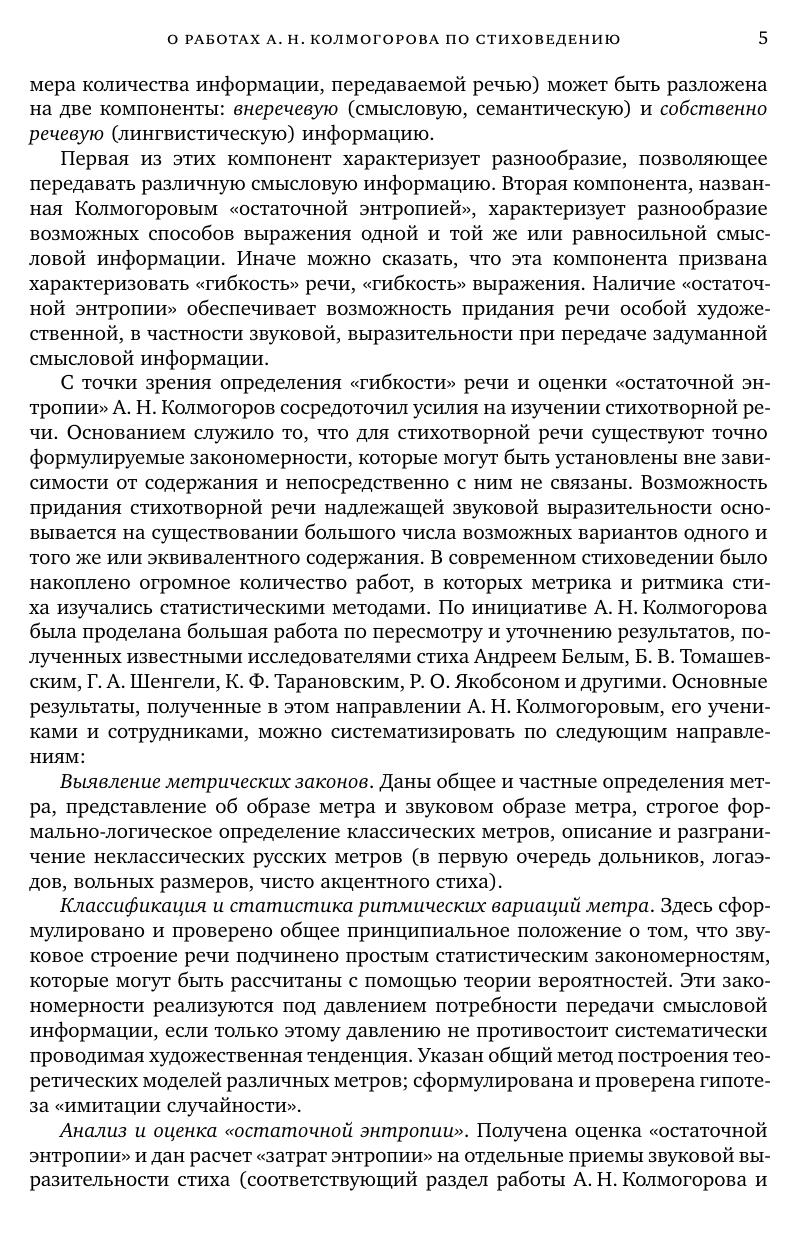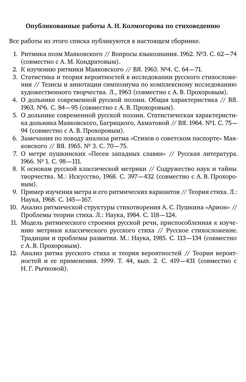Выдающийся математик А. Н. Колмогоров известен также своими исследованиями метра и ритма русского стиха. Развивая идеи своих знаменитых предшественников, от Андрея Белого до Романа Якобсона, Колмогоров уточняет и пересматривает их результаты, используя в работе методы теории информации и математической статистики. Литературоведческие работы Колмогорова получили высокую оценку специалистов в этой области. В настоящем издании впервые собраны работы А. Н. Колмогорова по стиховедению. Некоторые тексты публикуются впервые. Книга открывается вступительными статьями А. В. Прохорова и М. Л. Гаспарова.