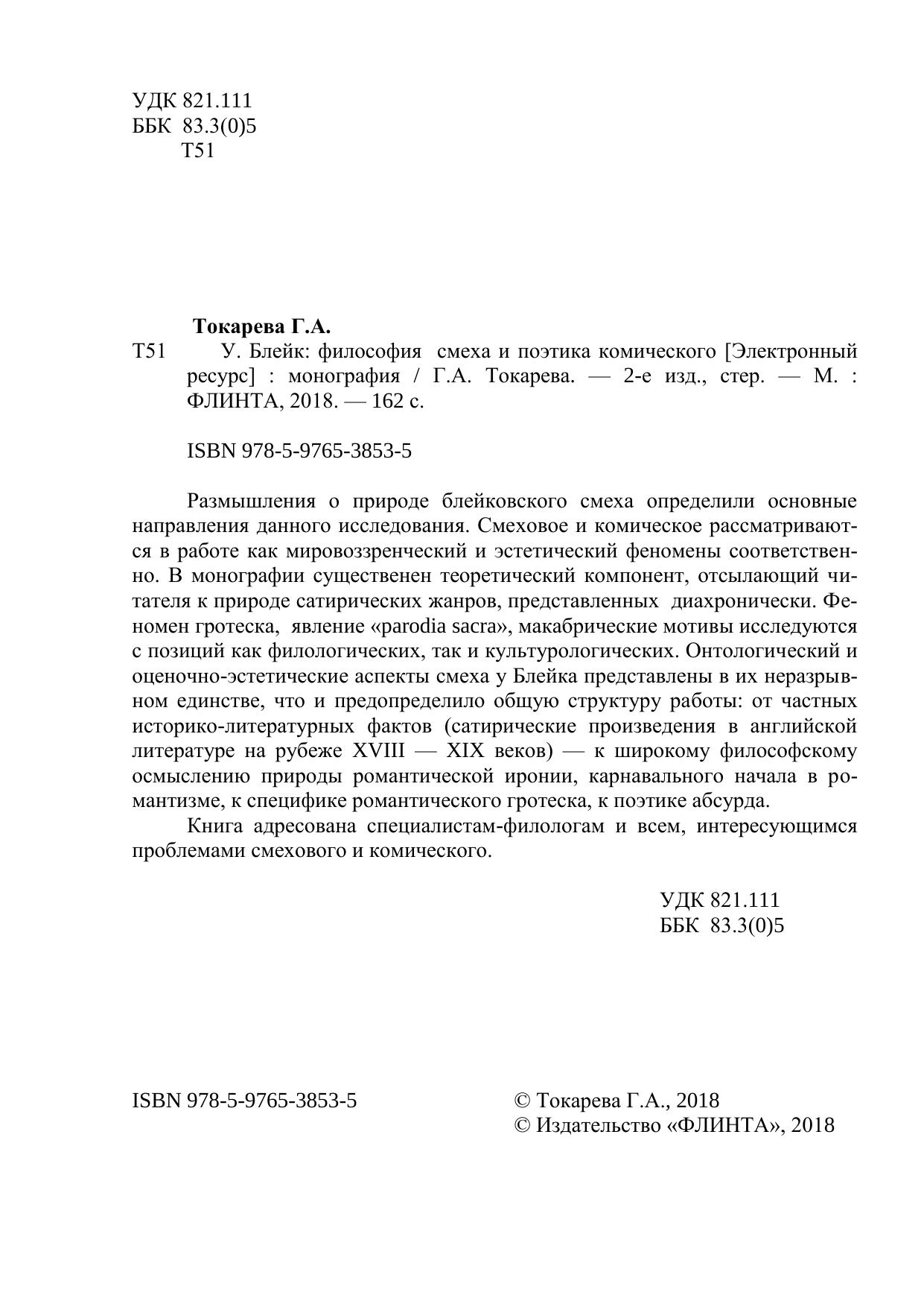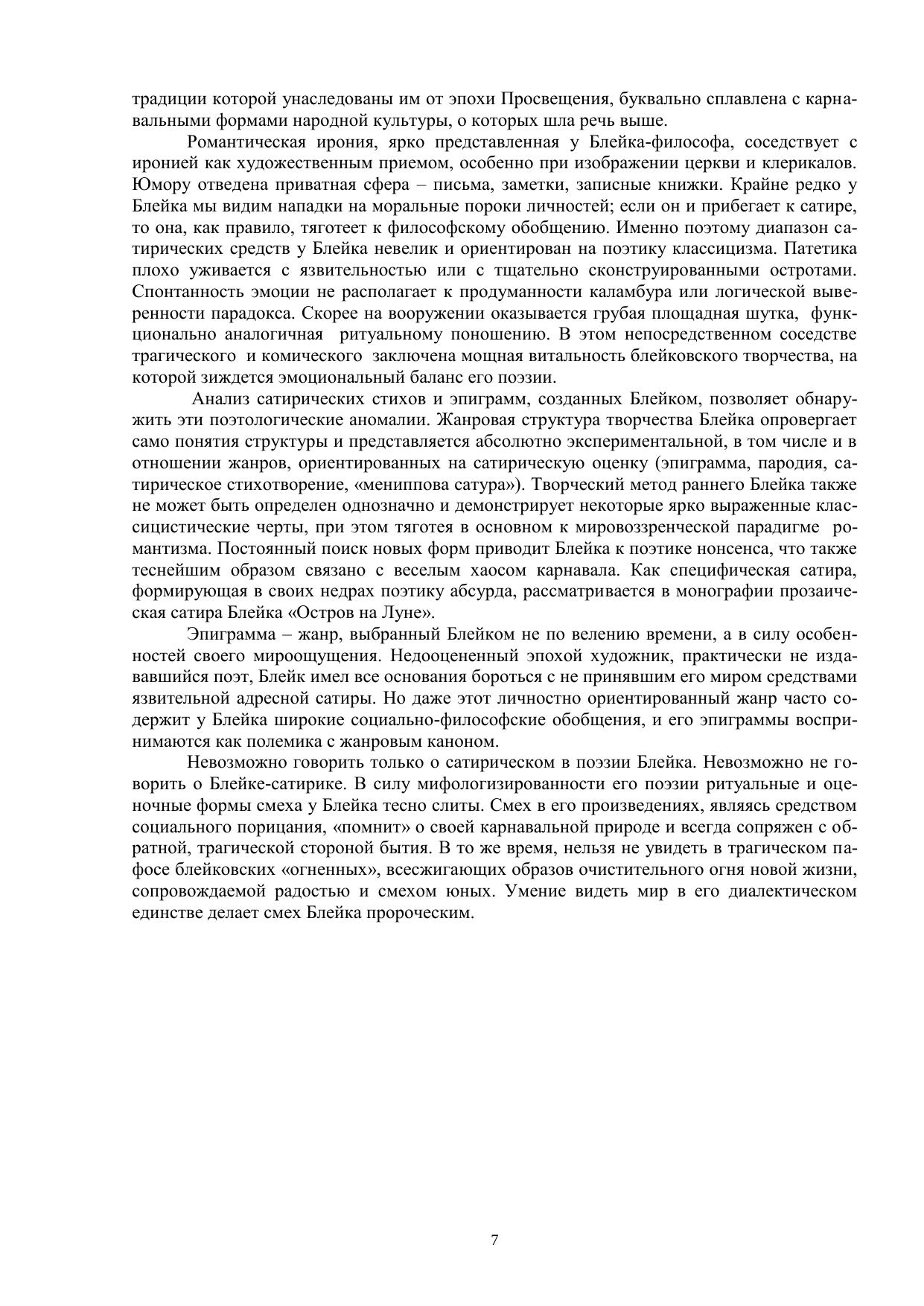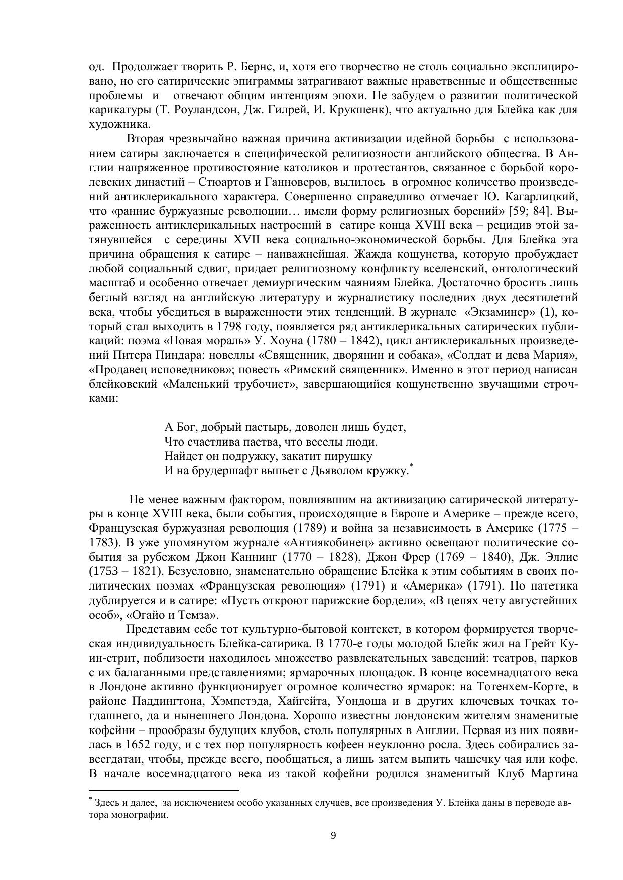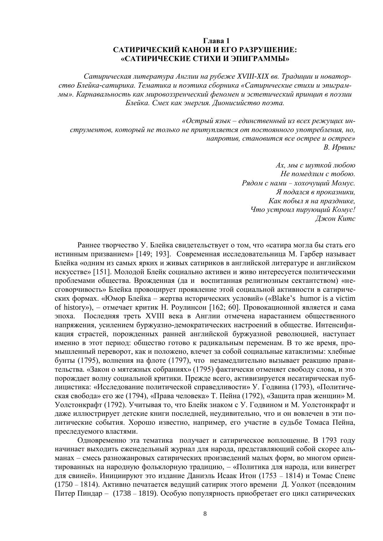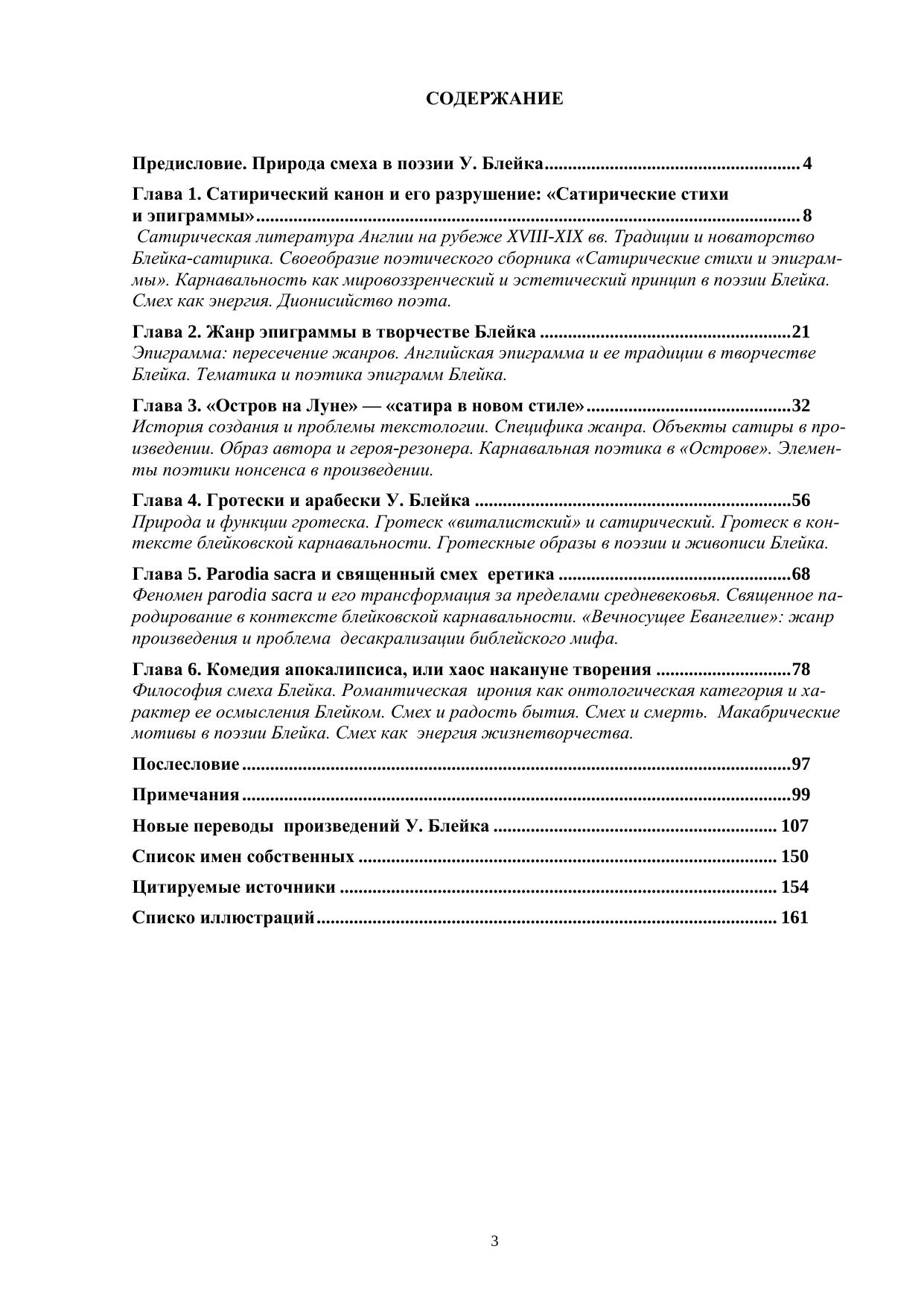 Размышления о природе блейковского смеха определили основные направления данного исследования. Смеховое и комическое рассматривают-ся в работе как мировоззренческий и эстетический феномены соответственно. В монографии существенен теоретический компонент, отсылающий читателя к природе сатирических жанров, представленных диахронически. Феномен гротеска, явление «parodia sacra», макабрические мотивы исследуются с позиций как филологических, так и культурологических. Онтологический и оценочно-эстетические аспекты смеха у Блейка представлены в их неразрывном единстве, что и предопределило общую структуру работы: от частных историко-литературных фактов (сатирические произведения в английской литературе на рубеже XVIII — XIX веков) — к широкому философскому осмыслению природы романтической иронии, карнавального начала в романтизме, к специфике романтического гротеска, к поэтике абсурда.