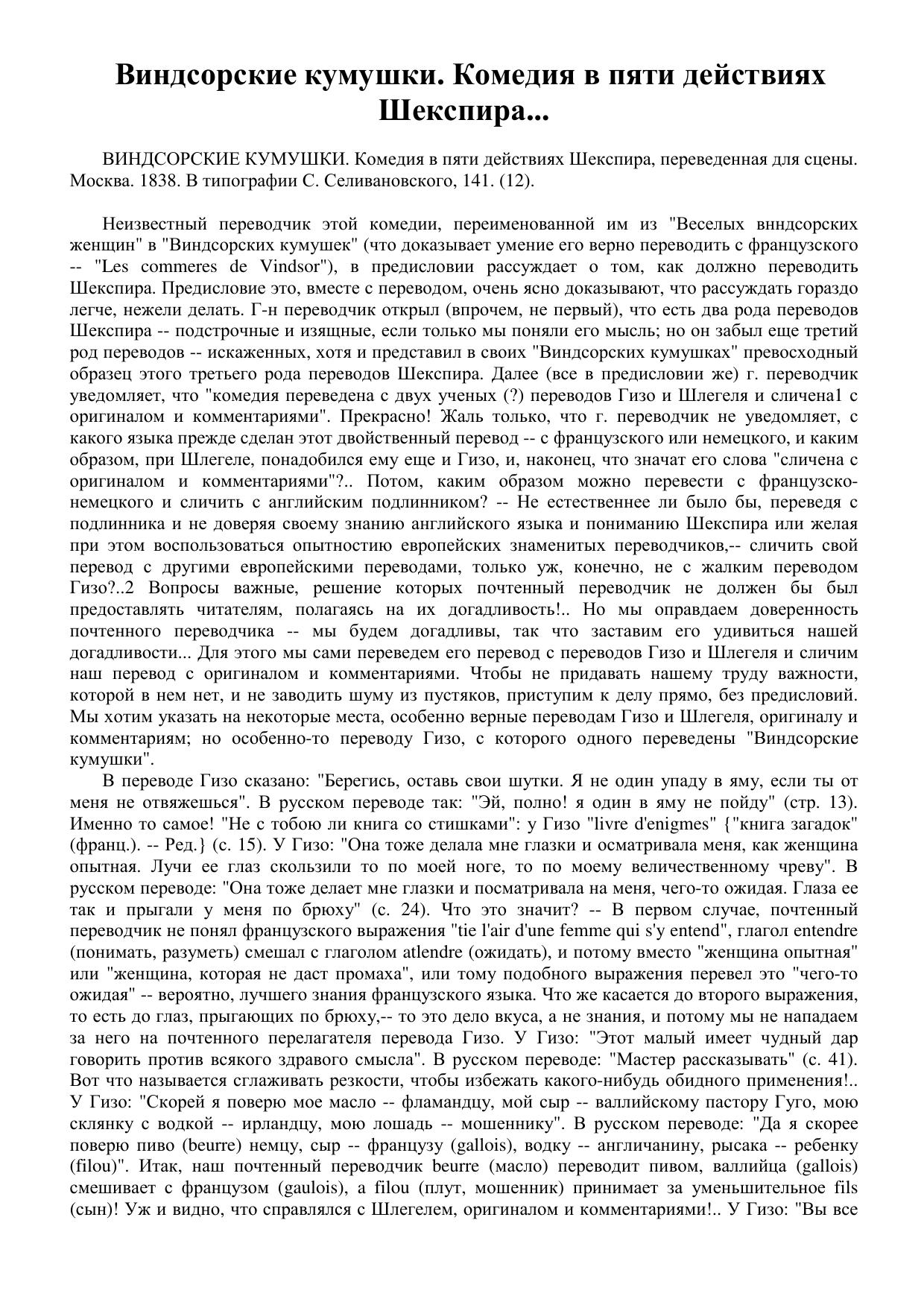 Виндсорские кумушки. Комедия в пяти действиях Шекспира...
