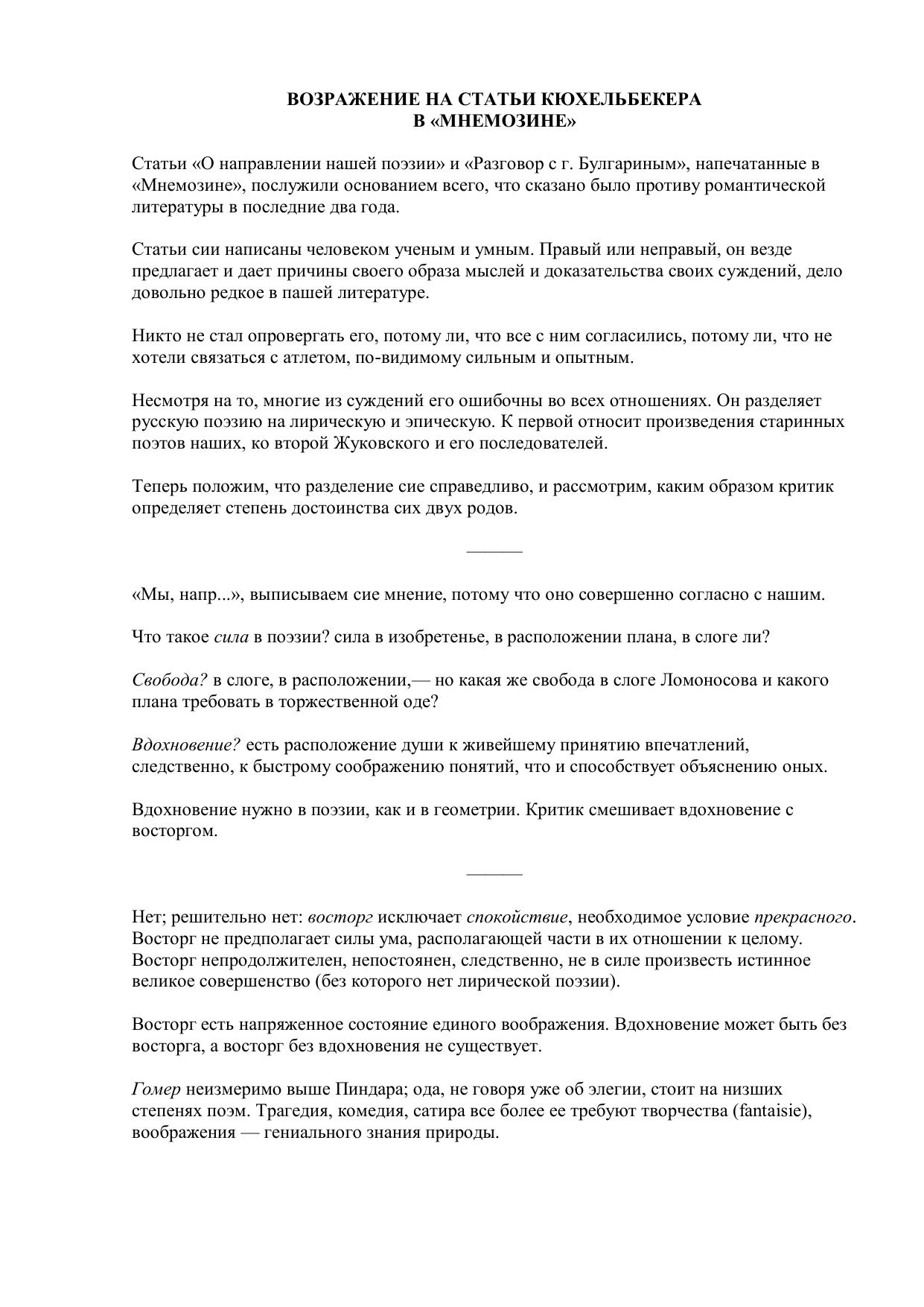 Возражение на статьи Кюхельбекера в "Мнемозине"