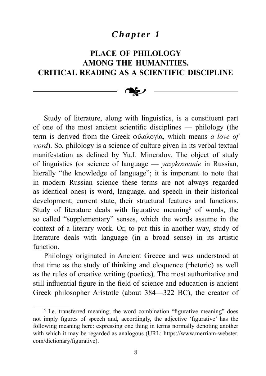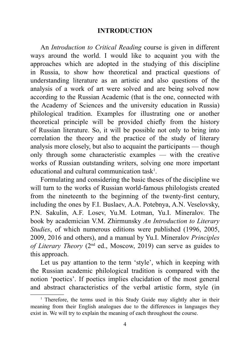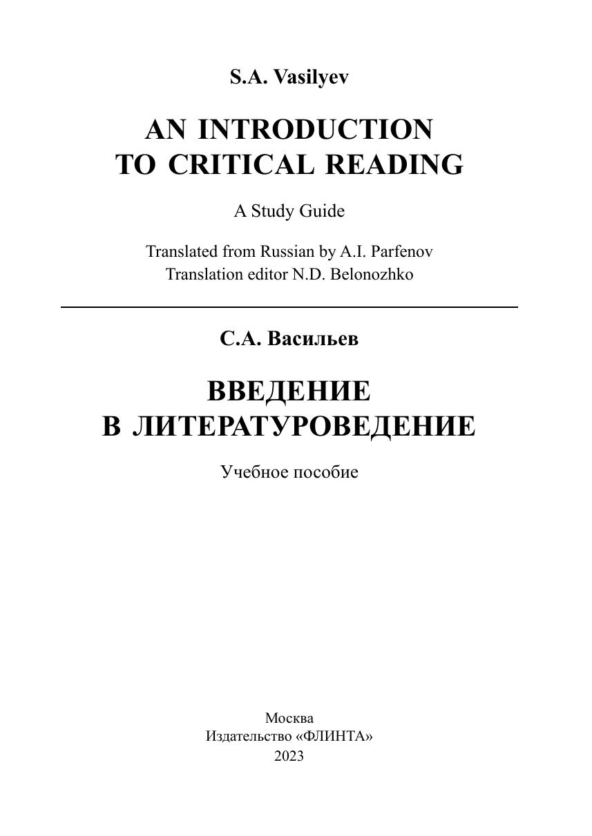 The textbook is a complete Study Guide on Introduction to Critical Reading, accompanied by methodological materials. The theoretical foundations of the discipline were developed on the basis of the works by P.N. Sakulin, A.F. Losev, Yu.I. Mineralov, scholars of the Russian academic tradition.