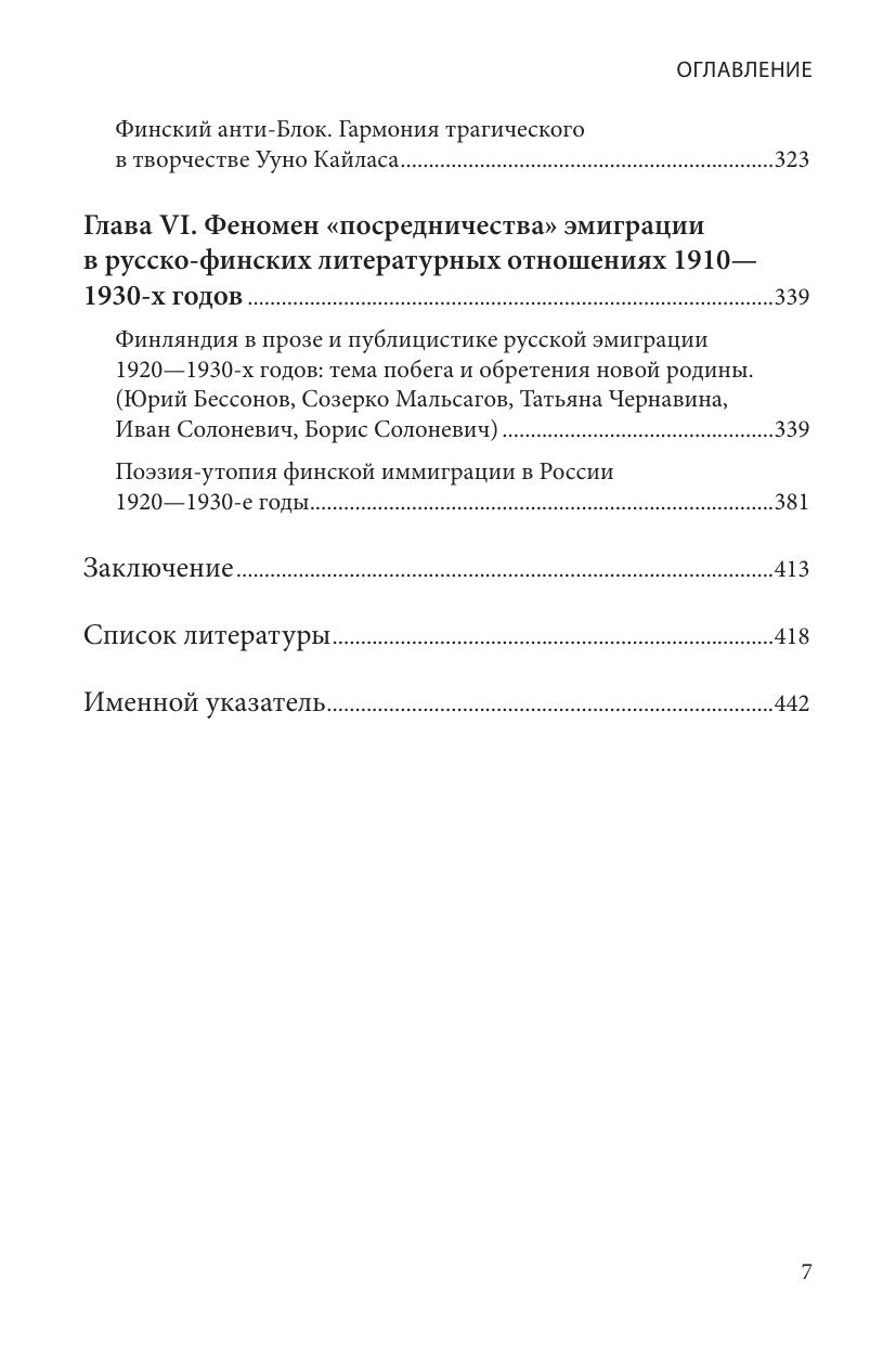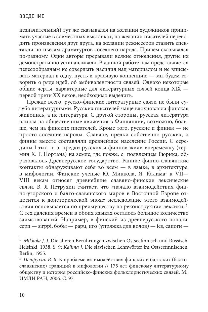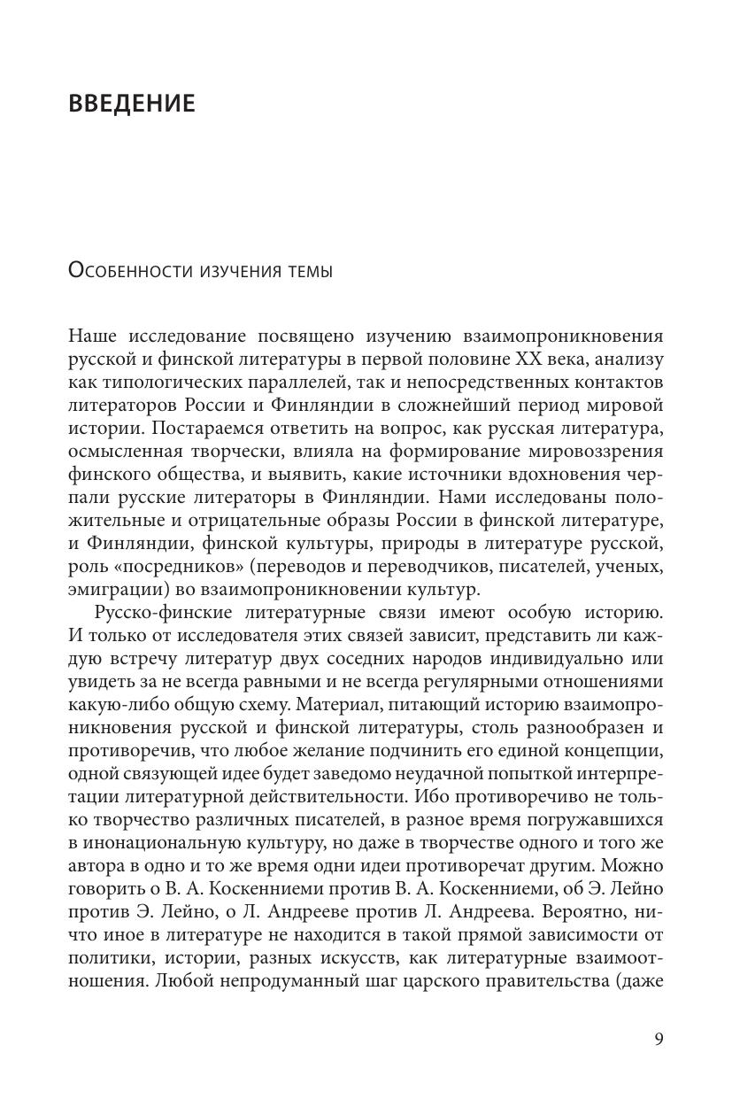 Монография посвящена изучению взаимопроникновения русской и финской литературы в первой половине ХХ века. Исследованы как типологические параллели, так и непосредственные контакты литераторов России и Финляндии в сложнейший период мировой истории. Проанализировано влияние русской литературы на формирование мировоззрения финского общества. Подтвержден теоретический вывод, что взаимопроникновение литературы разных народов возможно не только через сближение, но и через отталкивание. Изучена роль «посредников» (переводов и переводчиков, писателей, ученых, эмиграции) во взаимопроникновении культур. Подлинным «посредником» в русско-финских литературных контактах являлась «Калевала», сюжеты которой творчески были восприняты русскими поэтами. Введен в научный обиход ряд уникальных материалов из архивов России и Финляндии.