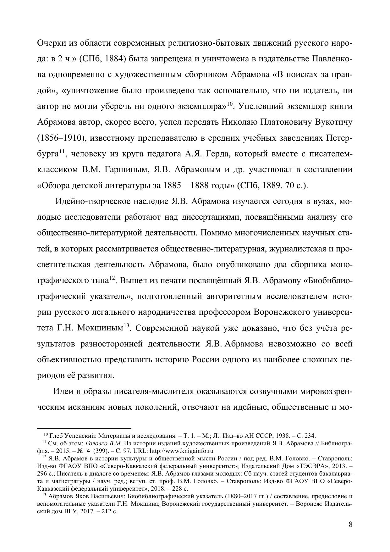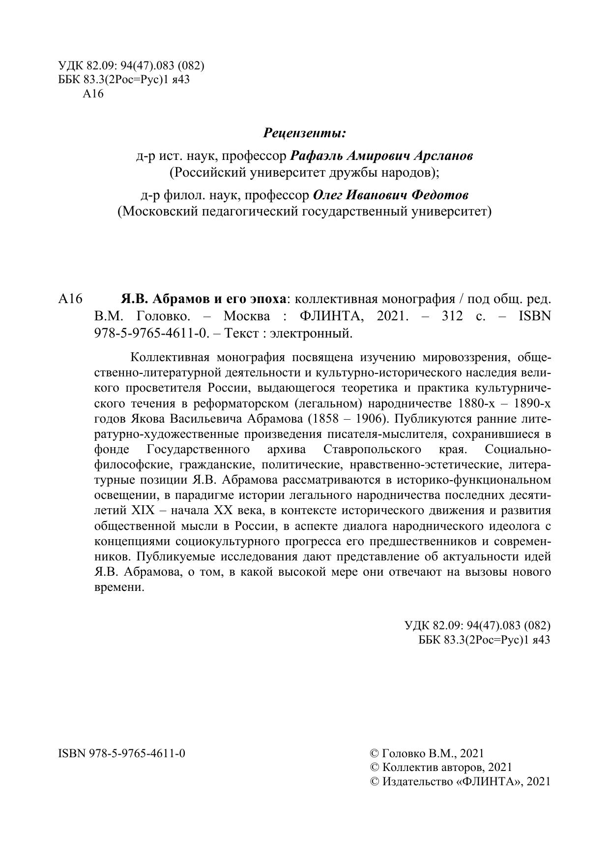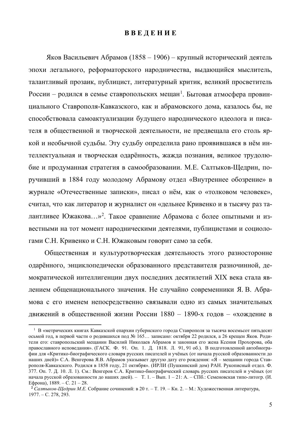 Коллективная монография посвящена изучению мировоззрения, общественно-литературной деятельности и культурно-исторического наследия великого просветителя России, выдающегося теоретика и практика культурнического течения в реформаторском (легальном) народничестве 1880-х – 1890-х годов Якова Васильевича Абрамова (1858 – 1906). Публикуются ранние литературно-художественные произведения писателя-мыслителя, сохранившиеся в фонде Государственного архива Ставропольского края. Социально-философские, гражданские, политические, нравственно-эстетические, литературные позиции Я.В. Абрамова рассматриваются в историко-функциональном освещении, в парадигме истории легального народничества последних десятилетий ХIХ – начала ХХ века, в контексте исторического движения и развития общественной мысли в России, в аспекте диалога народнического идеолога с концепциями социокультурного прогресса его предшественников и современников. Публикуемые исследования дают представление об актуальности идей Я.В. Абрамова, о том, в какой высокой мере они отвечают на вызовы нового времени.