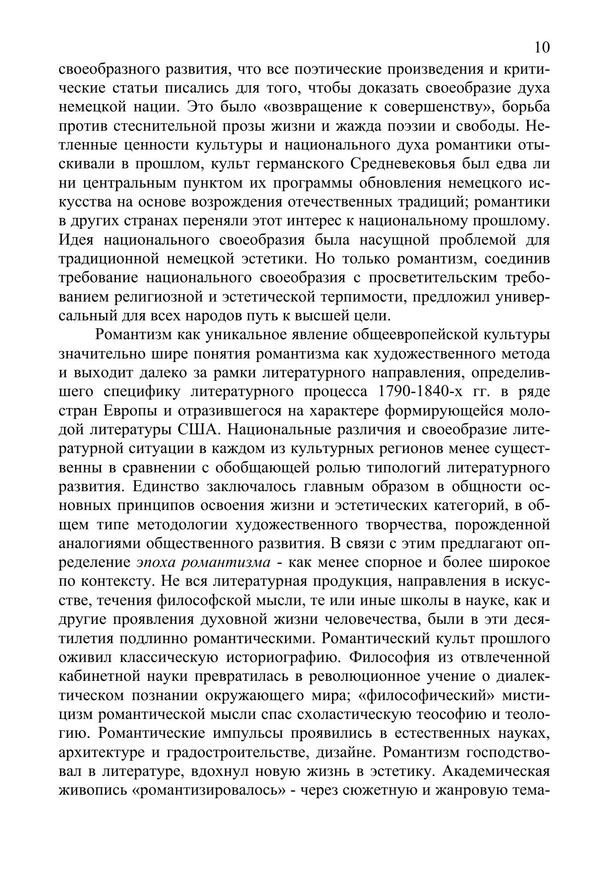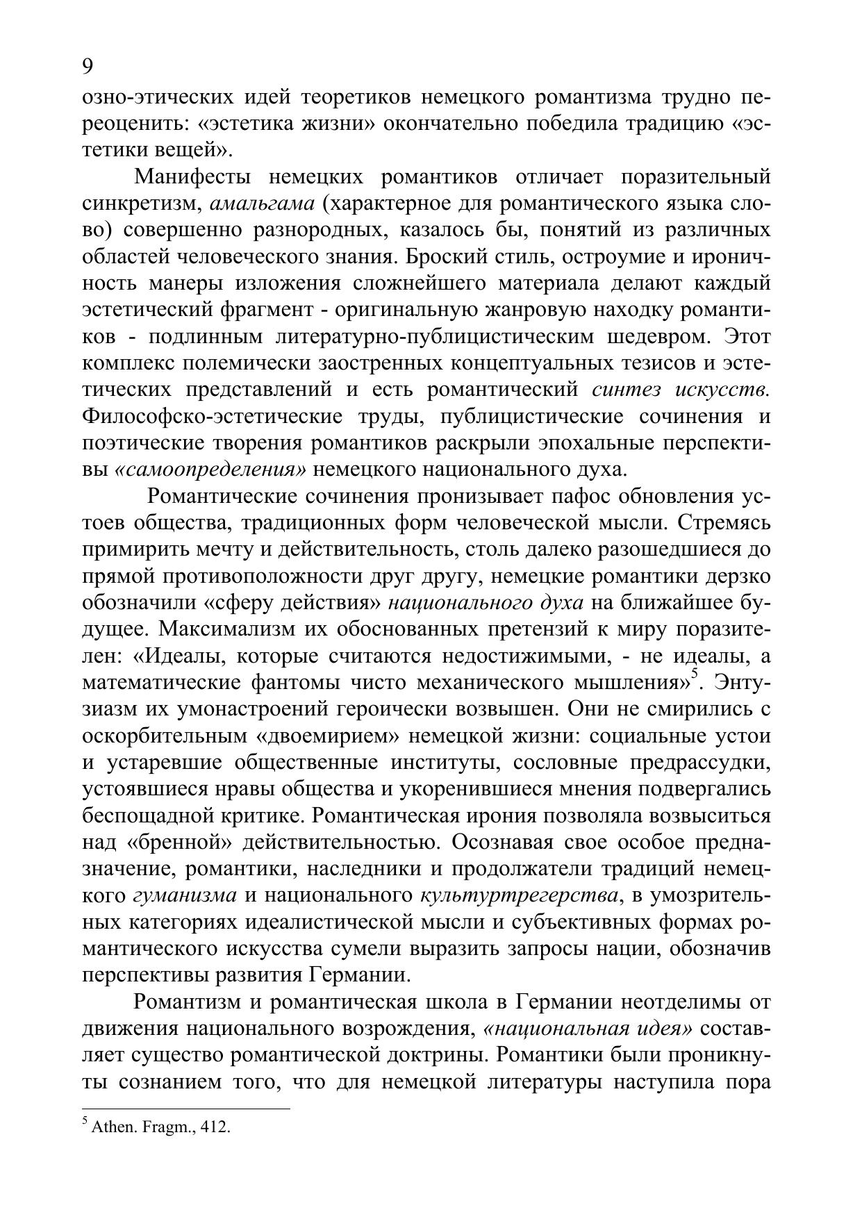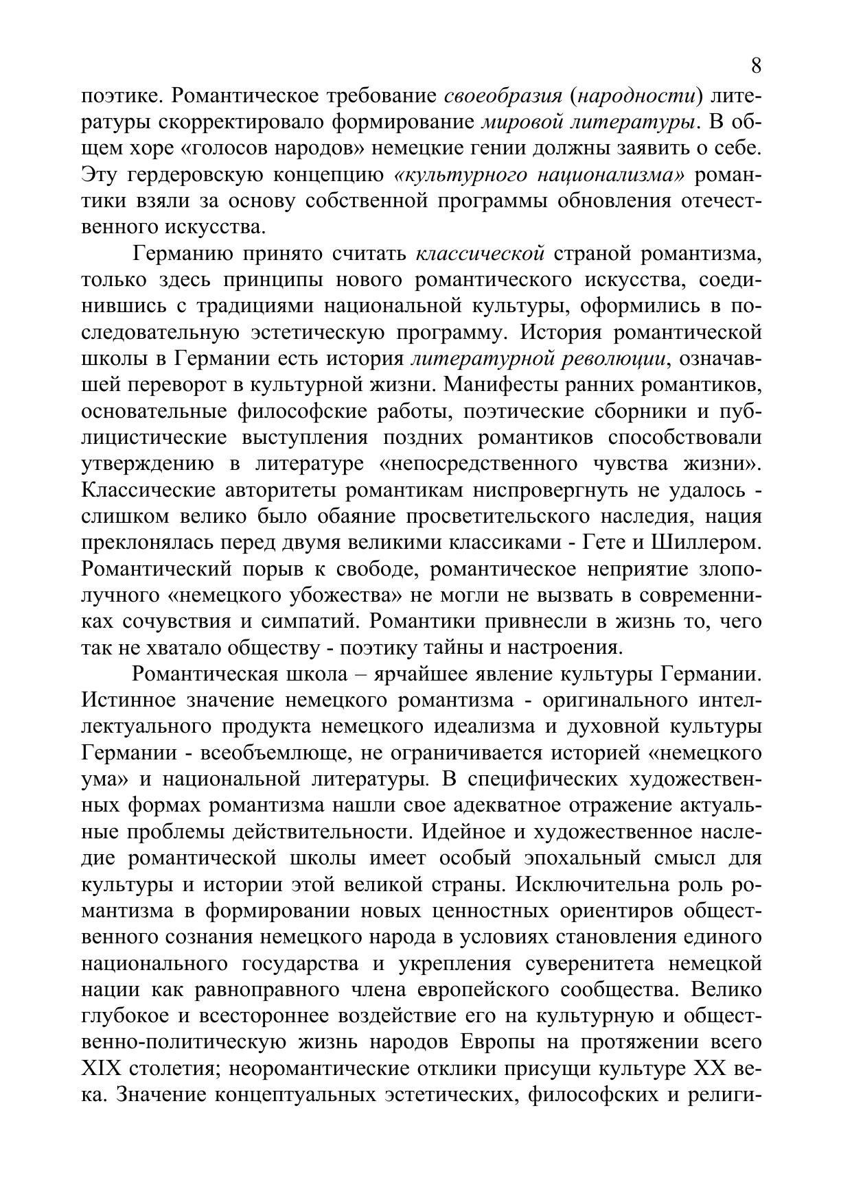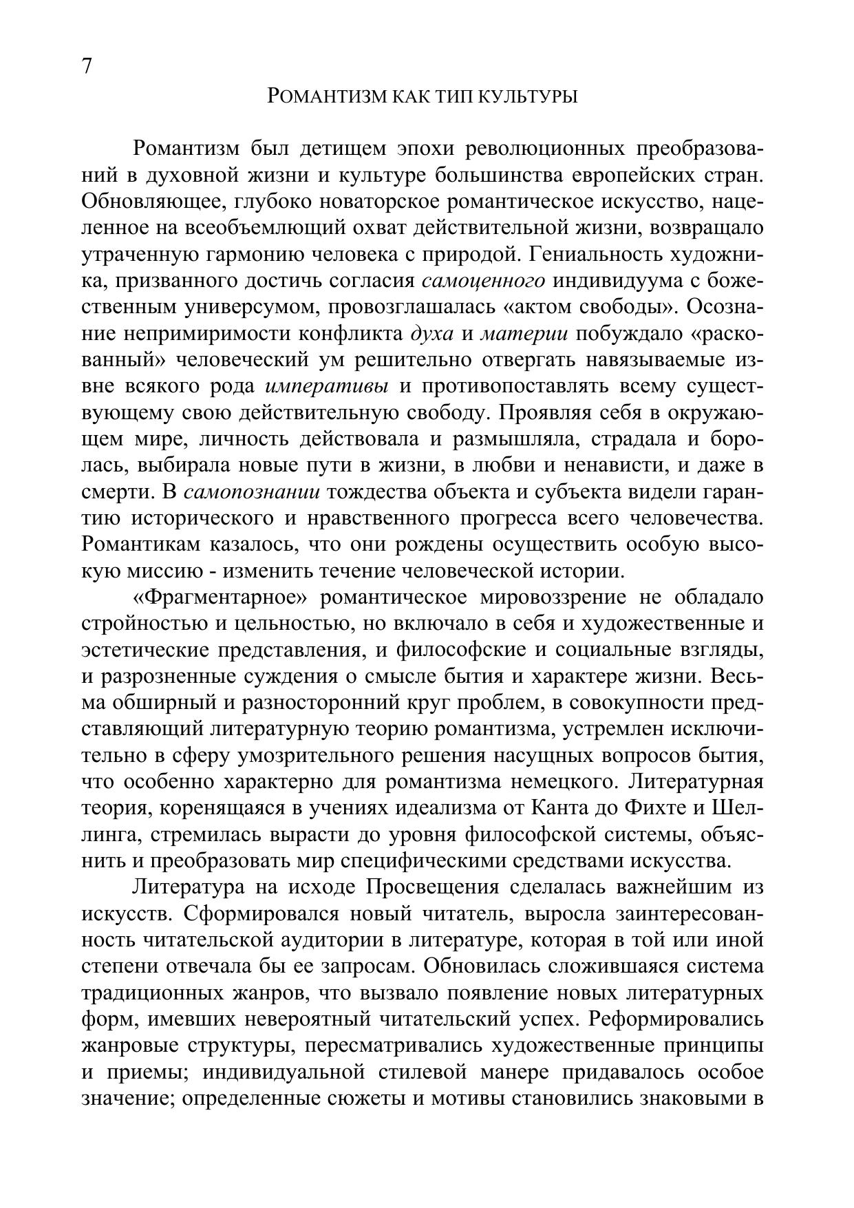 Романтизм – действенная форма национального самосознания в культуре, отвечающая потребностям общественной жизни; в разных идеологических вариантах романтическое движение выражало тенденции прогрессивного буржуазного развития. Определенные принципы романтического мировосприятия и эстетического мышления востребованы европейской культурой рубежа XIX–XX вв. Актуальность этого наследия очевидна: кризисные явления в современной культуре изменили культурную парадигму; возвращение к духовному опыту романтиков – верный путь спасения самой культуры. Немецкий романтизм в своей значимости вышел за рамки национальной литературы, литературная революция, совершенная романтиками, была эквивалентом социально-политических и других глобальных изменений эпохи. Выработанная теоретиками романтической школы литературная доктрина представляет собой органический сплав философии искусства, новой эстетики и новаторской литературной критики.