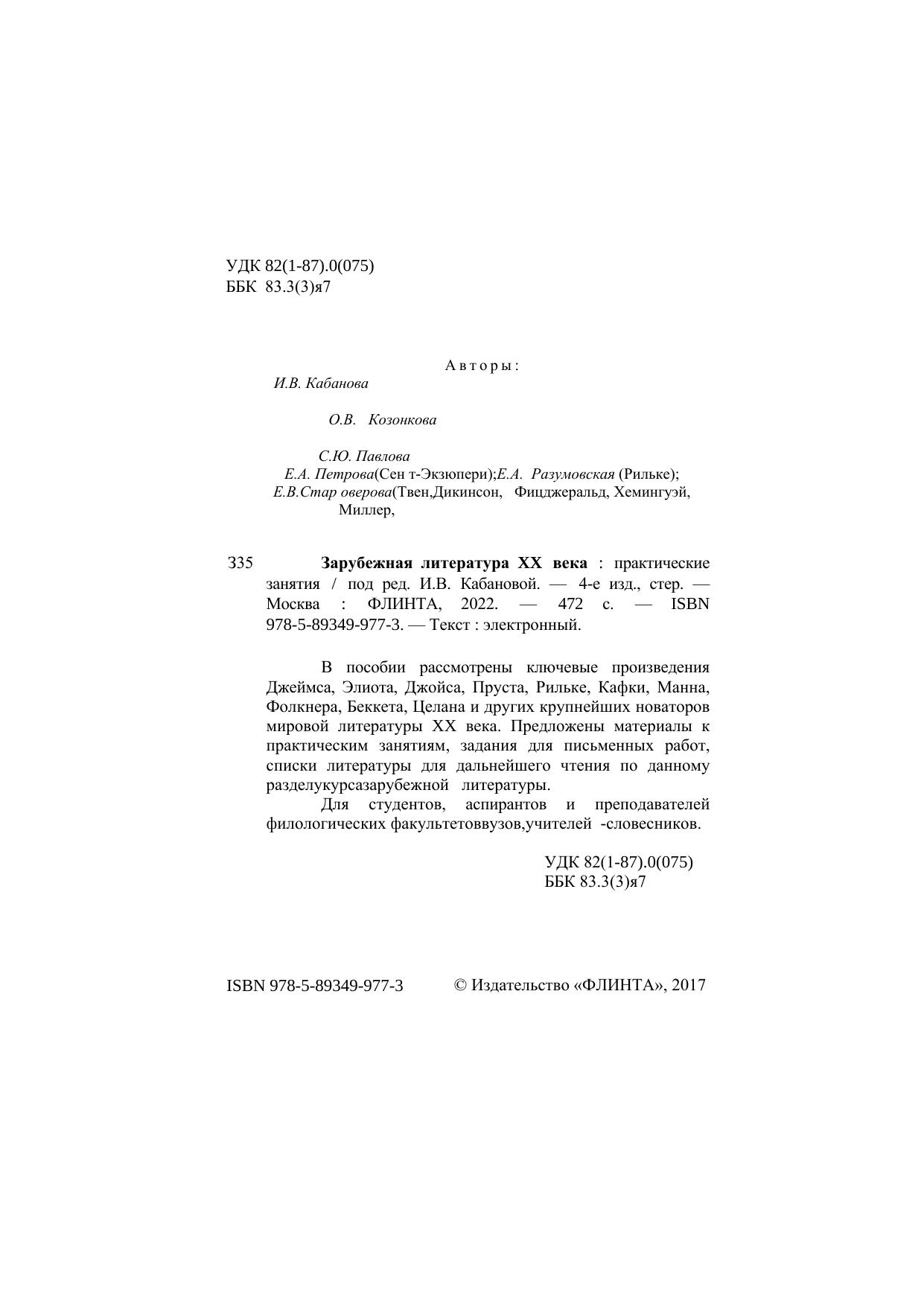 В пособии рассмотрены ключевые произведения Джеймса, Элиота, Джойса, Пруста, Рильке, Кафки, Манна, Фолкнера, Беккета, Целана и других крупнейших новаторов мировой литературы XX века. Предложены материалы к практическим занятиям, задания для письменных работ, списки литературы для дальнейшего чтения по данному разделу курса зарубежной литературы.