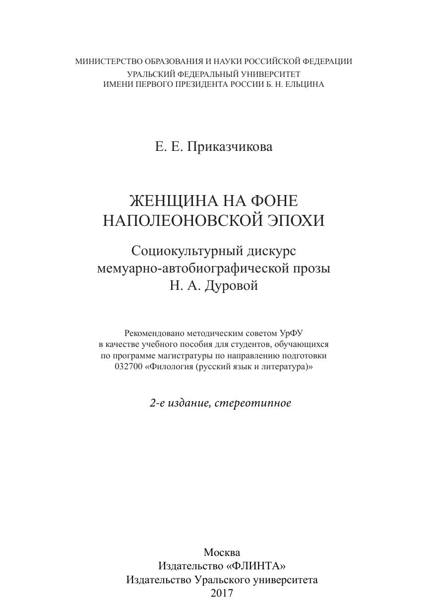 Женщина на фоне наполеоновской эпохи: социокультурный дискурс мемуарно-автобиографической прозы Н.А. Дуровой