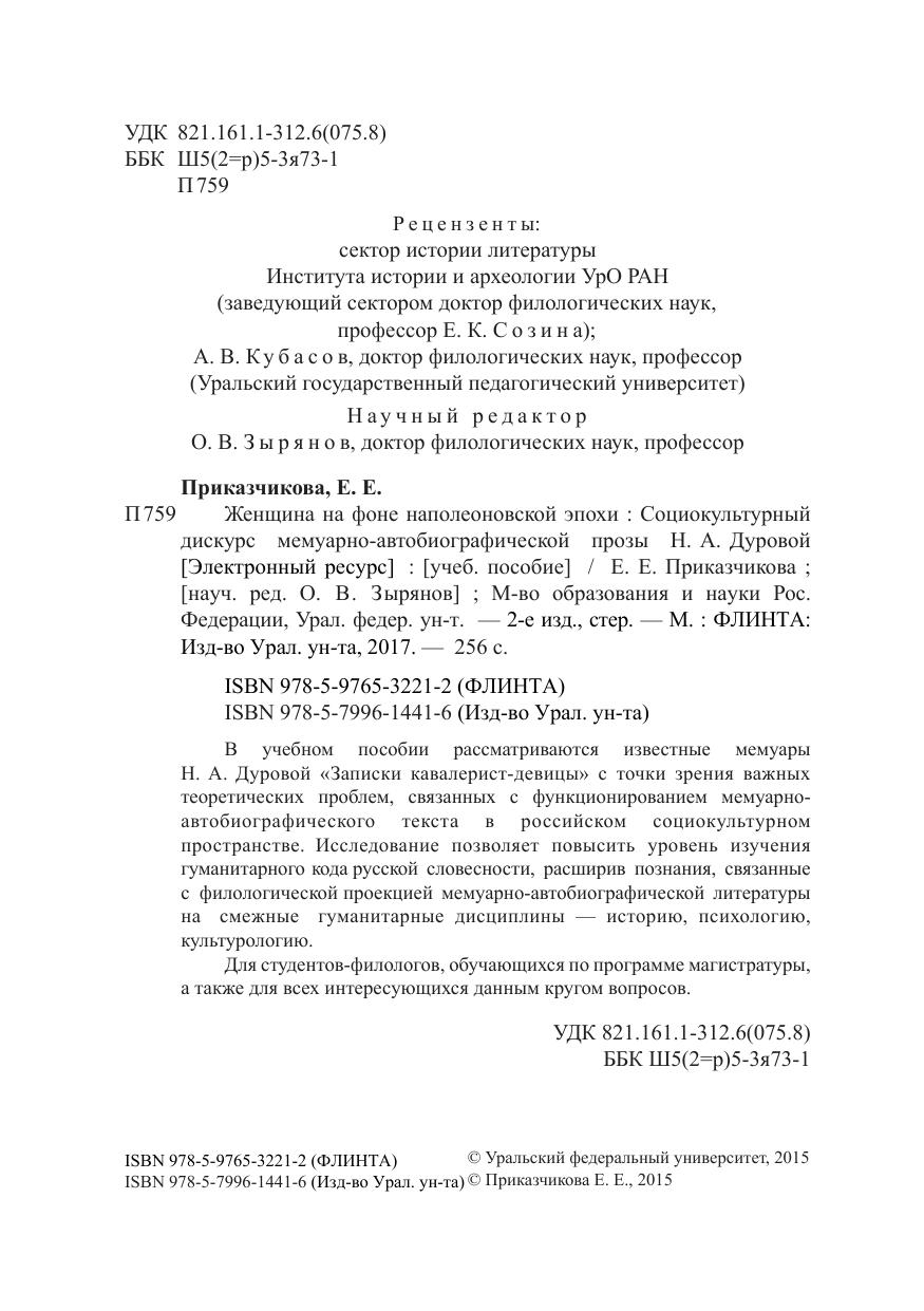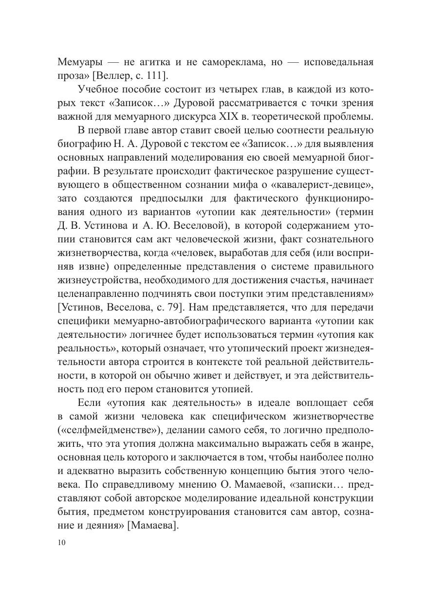 В учебном пособии рассматриваются известные мемуары Н.А. Дуровой «Записки кавалерист-девицы» с точки зрения важных теоретических проблем, связанных с функционированием мемуарно-автобиографического текста в российском социокультурном пространстве. Исследование позволяет повысить уровень изучения гуманитарного кода русской словесности, расширив познания, связанные с филологической проекцией мемуарно-автобиографической литературы на смежные гуманитарные дисциплины — историю, психологию, культурологию. Для студентов-филологов, обучающихся по программе магистратуры, а также для всех интересующихся данным кругом вопросов.