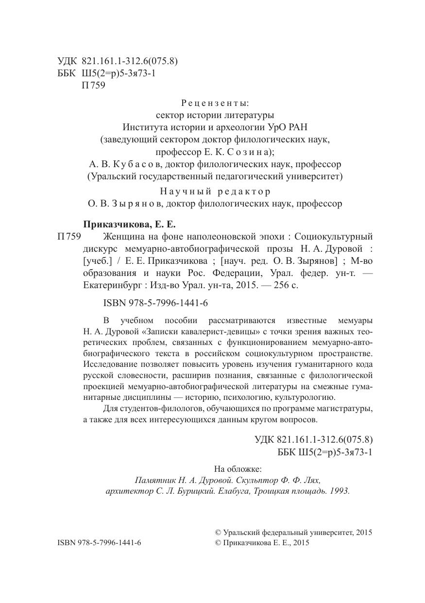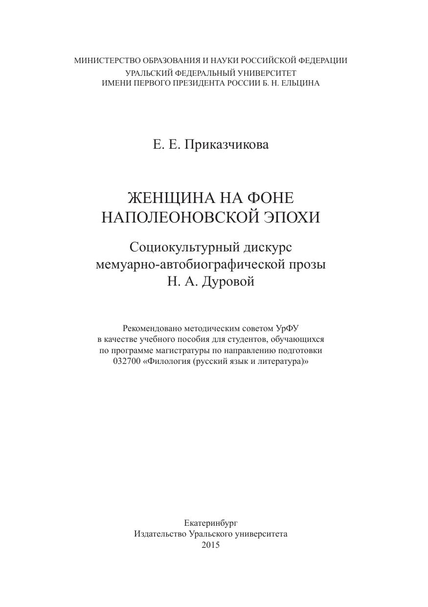 Женщина на фоне наполеоновской эпохи : Социокультурный дискурс мемуарно-автобиографической прозы Н. А . Дуровой : учеб.
