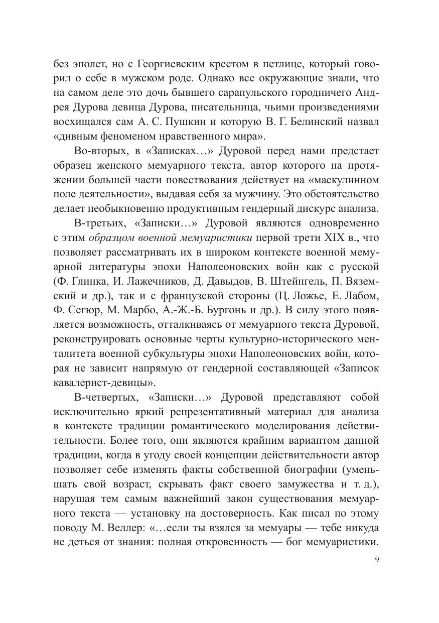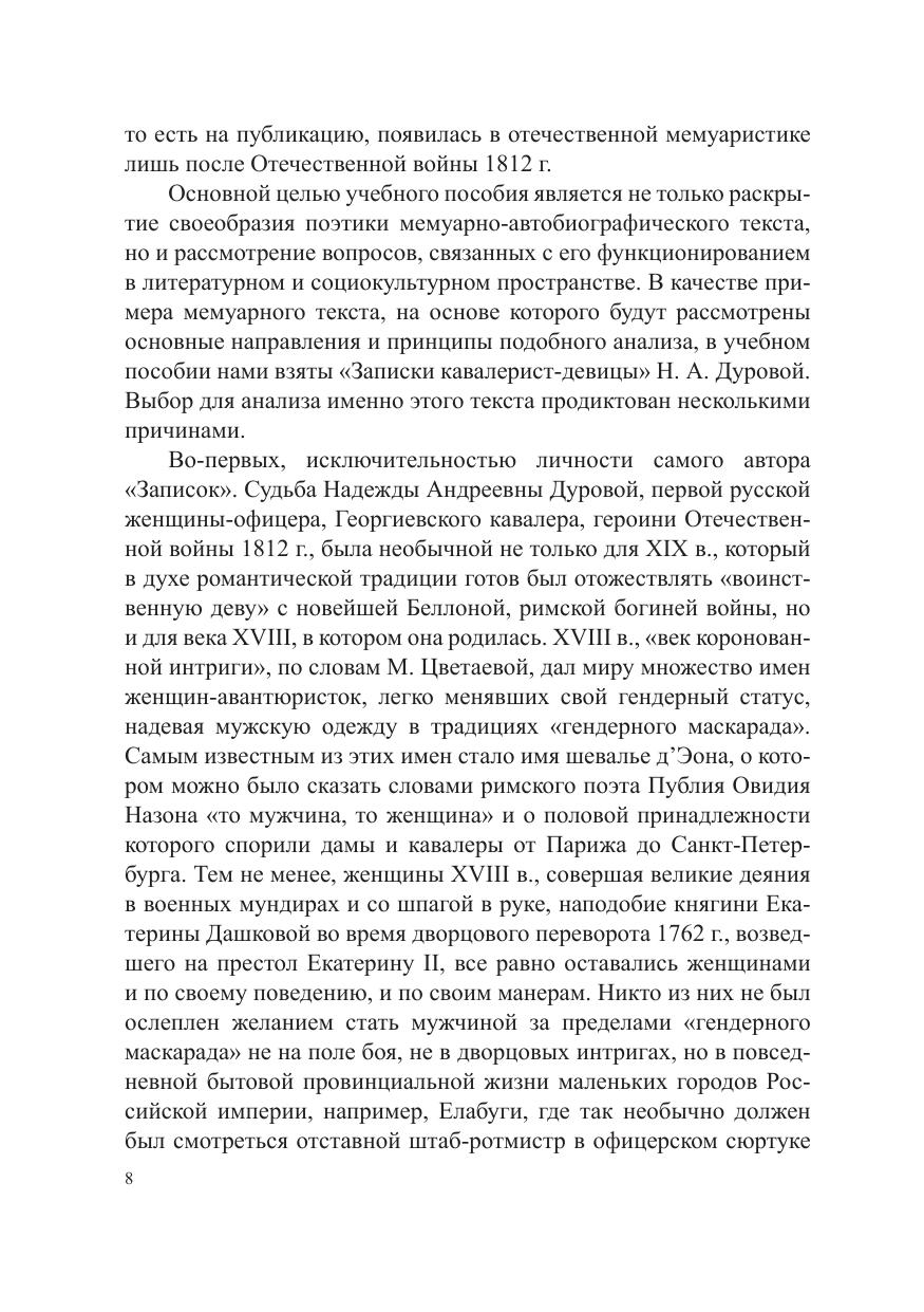 В учебном пособии рассматриваются известные мемуары Н. А . Дуровой «Записки кавалерист-девицы» с точки зрения важных теоретических проблем, связанных с функционированием мемуарно-автобиографического текста в российском социокультурном пространстве. Исследование позволяет повысить уровень изучения гуманитарного кода русской словесности, расширив познания, связанные с филологической проекцией мемуарно-автобиографической литературы на смежные гуманитарные дисциплины — историю, психологию, культурологию. Для студентов-филологов, обучающихся по программе магистратуры, а также для всех интересующихся данным кругом вопросов.