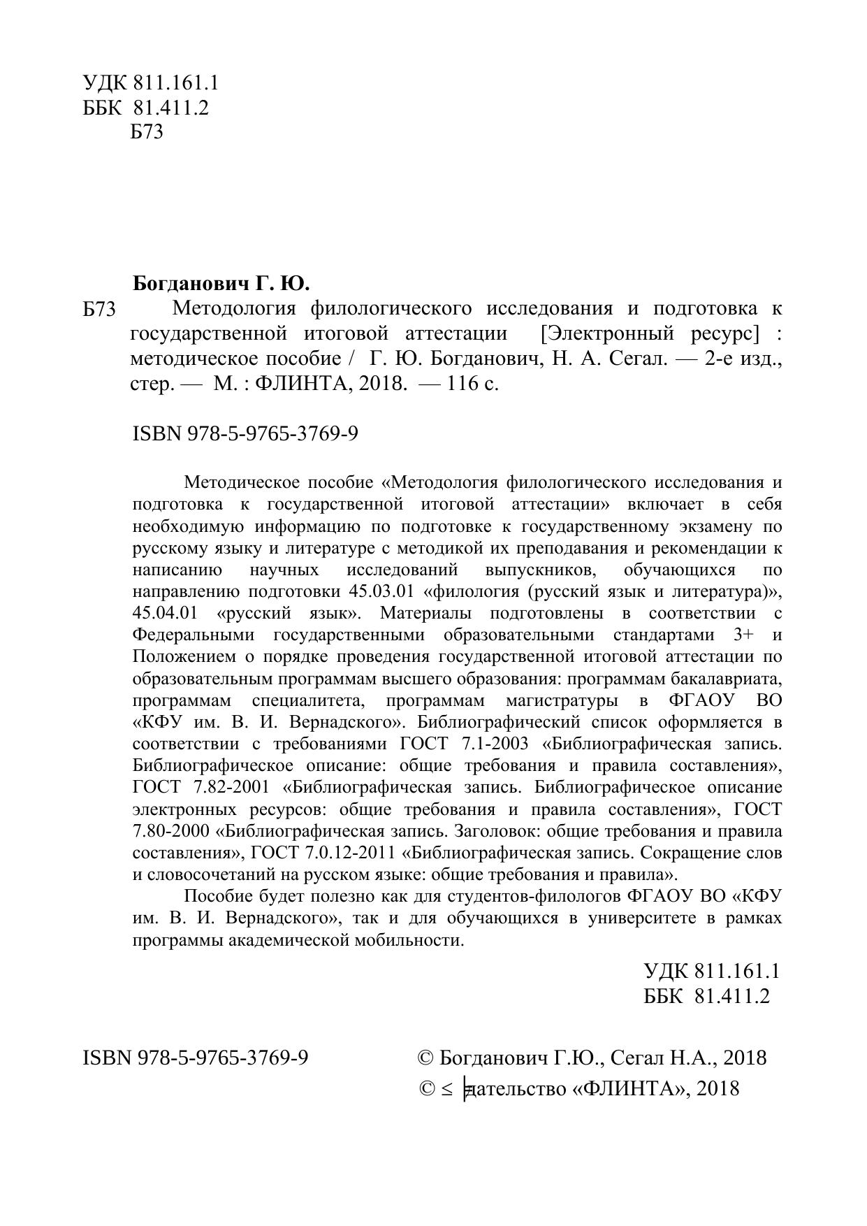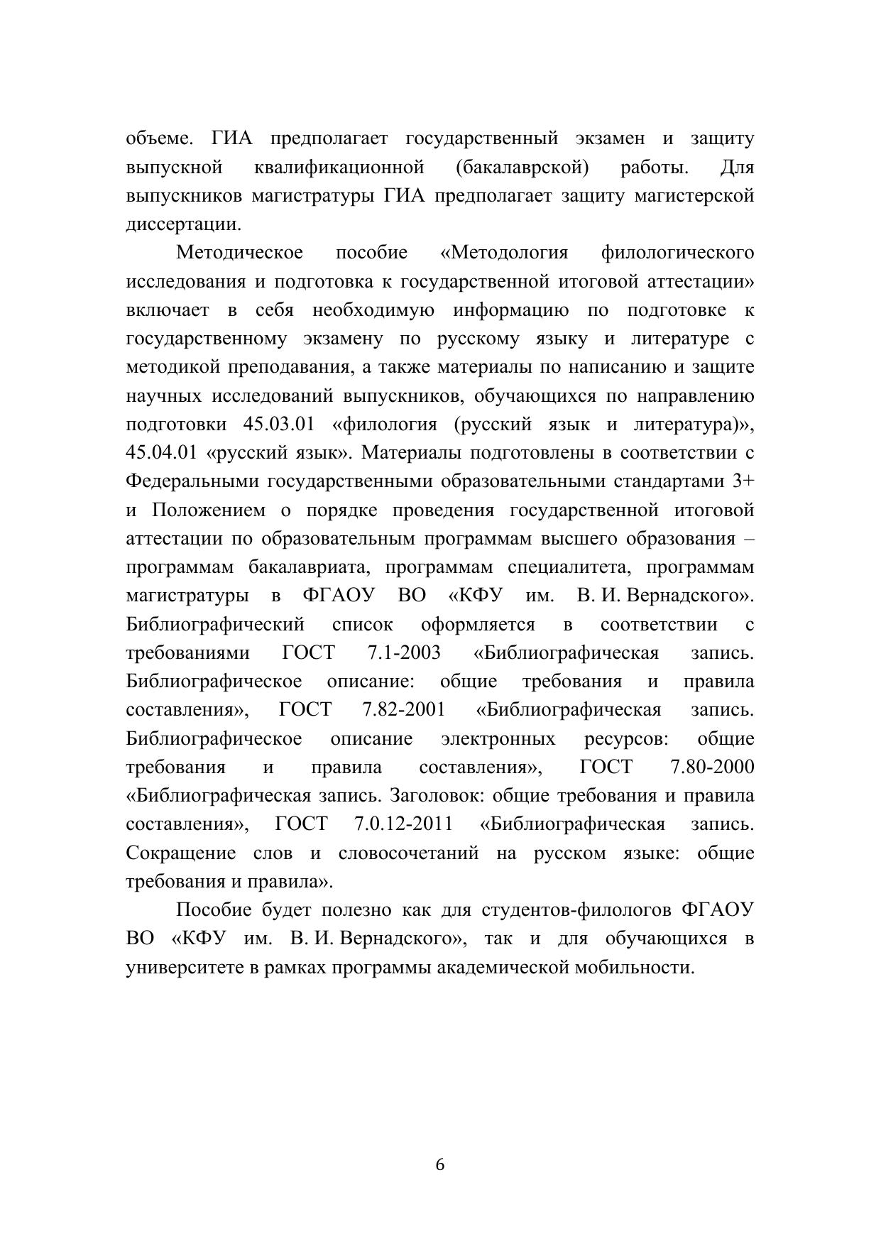 Методическое пособие «Методология филологического исследования и подготовка к государственной итоговой аттестации» включает в себя необходимую информацию по подготовке к государственному экзамену по русскому языку и литературе с методикой их преподавания и рекомендации к написанию научных исследований выпускников, обучающихся по направлению подготовки 45.03.01 «филология (русский язык и литература)», 45.04.01 «русский язык». Материалы подготовлены в соответствии с Федеральными государственными образовательными стандартами 3+ и Положением о порядке проведения государственной итоговой аттестации по образовательным программам высшего образования: программам бакалавриата, программам специалитета, программам магистратуры в ФГАОУ ВО «КФУ им. В. И. Вернадского». Библиографический список оформляется в соответствии с требованиями ГОСТ 7.1-2003 «Библиографическая запись. Библиографическое описание: общие требования и правила составления», ГОСТ 7.82-2001 «Библиографическая запись. Библиографическое описание электронных ресурсов: общие требования и правила составления», ГОСТ 7.80-2000 «Библиографическая запись. Заголовок: общие требования и правила составления», ГОСТ 7.0.12-2011 «Библиографическая запись. Сокращение слов и словосочетаний на русском языке: общие требования и правила». Пособие будет полезно как для студентов-филологов ФГАОУ ВО «КФУ им. В. И. Вернадского», так и для обучающихся в университете в рамках программы академической мобильности.