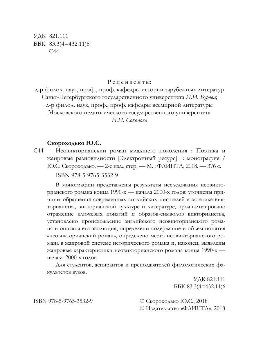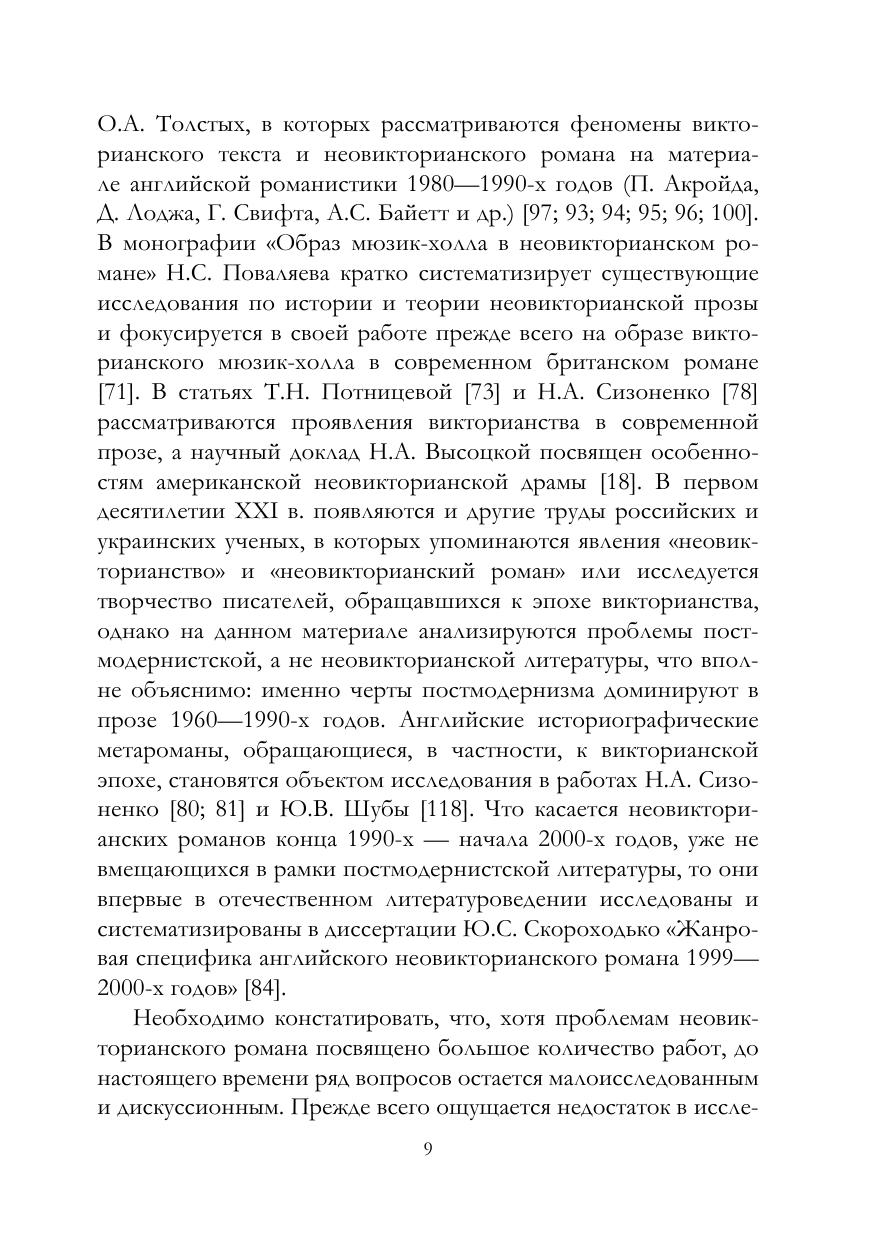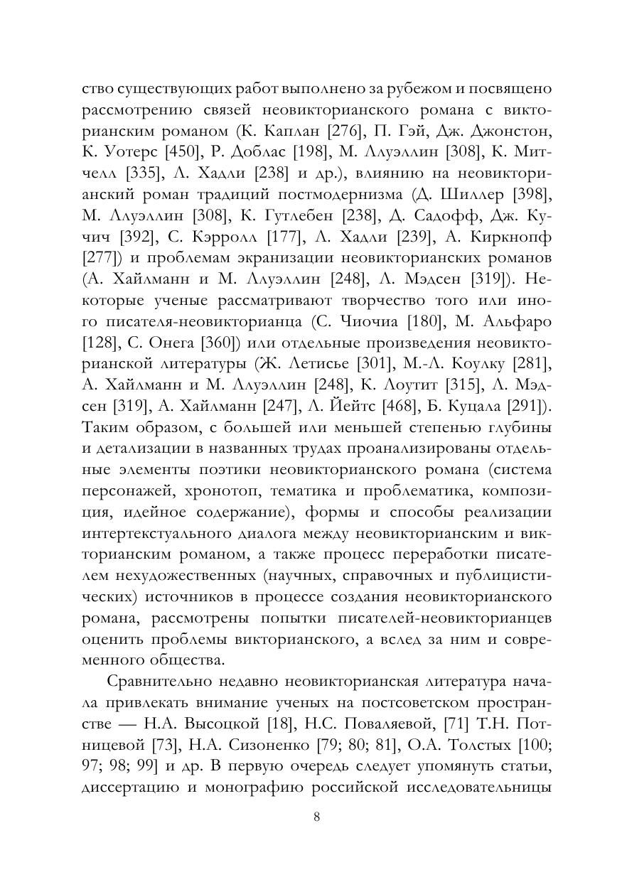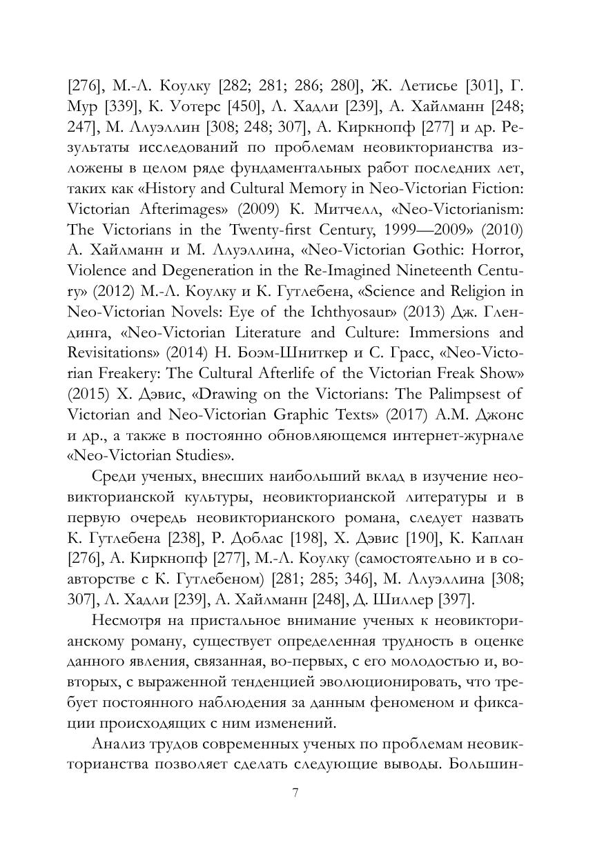 В монографии представлены результаты исследования неовикторианского романа конца 1990-х — начала 2000-х годов: уточнены причины обращения современных английских писателей к эстетике викторианства, викторианской культуре и литературе, проанализировано отражение ключевых понятий и образов-символов викторианства, установлено происхождение английского неовикторианского романа и описана его эволюция, определены содержание и объем понятия «неовикторианский роман», определено место неовикторианского романа в жанровой системе исторического романа и, наконец, выявлены жанровые характеристики неовикторианского романа конца 1990-х — начала 2000-х годов.