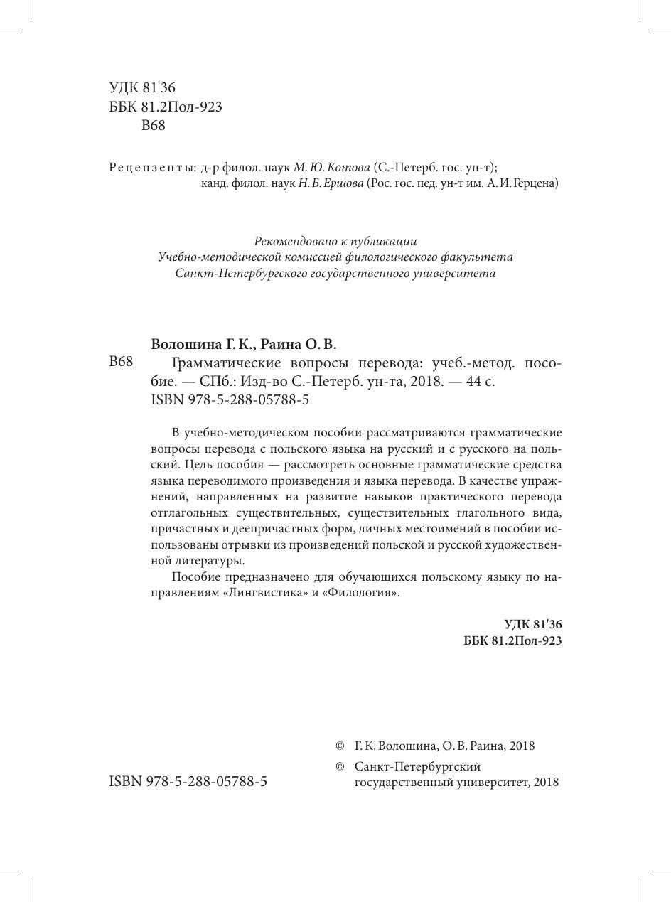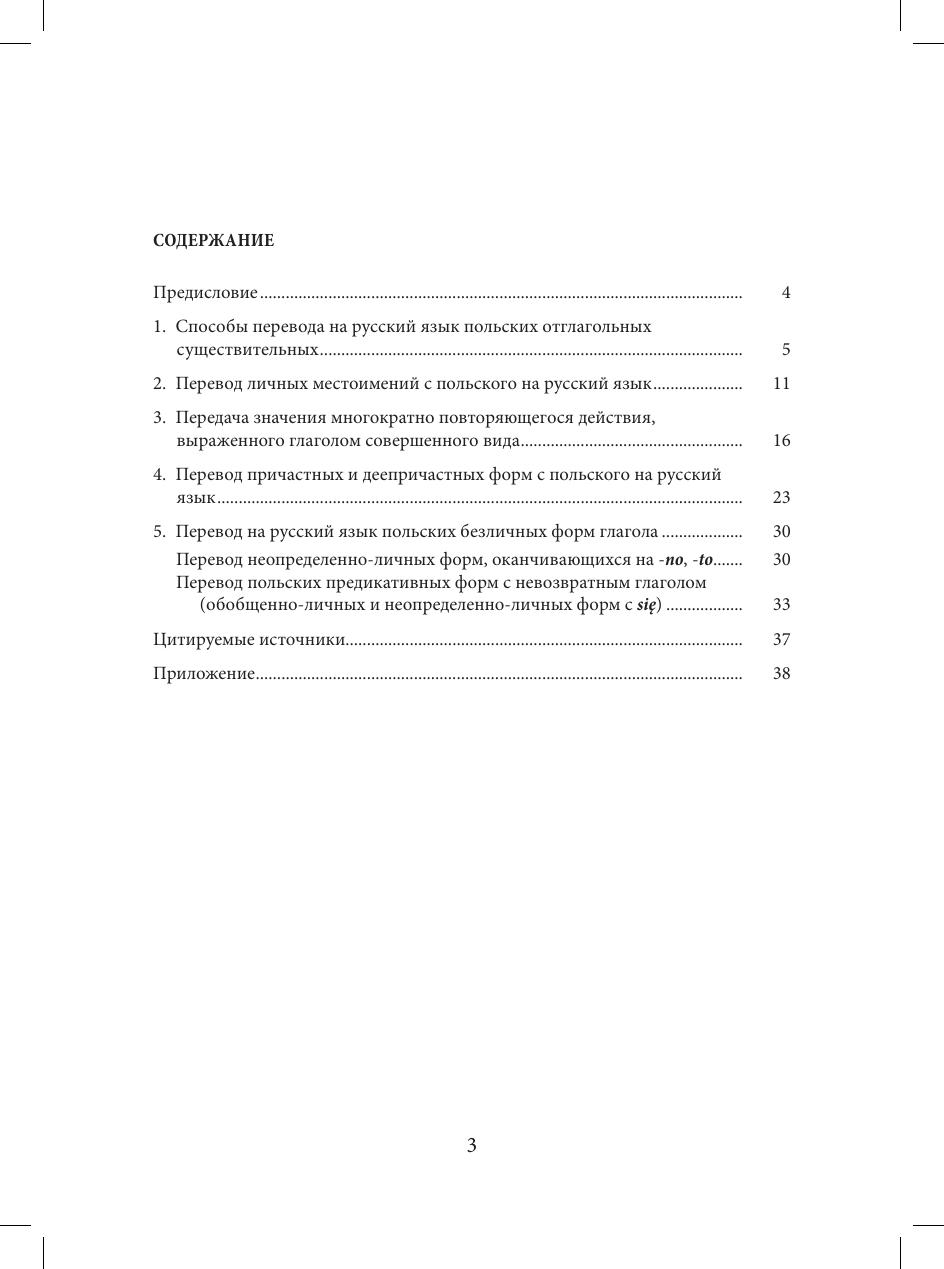 В учебно-методическом пособии рассматриваются грамматические вопросы перевода с польского языка на русский и с русского на польский. Цель пособия — рассмотреть основные грамматические средства языка переводимого произведения и языка перевода. В качестве упражнений, направленных на развитие навыков практического перевода отглагольных существительных, существительных глагольного вида, причастных и деепричастных форм, личных местоимений в пособии использованы отрывки из произведений польской и русской художественной литературы.