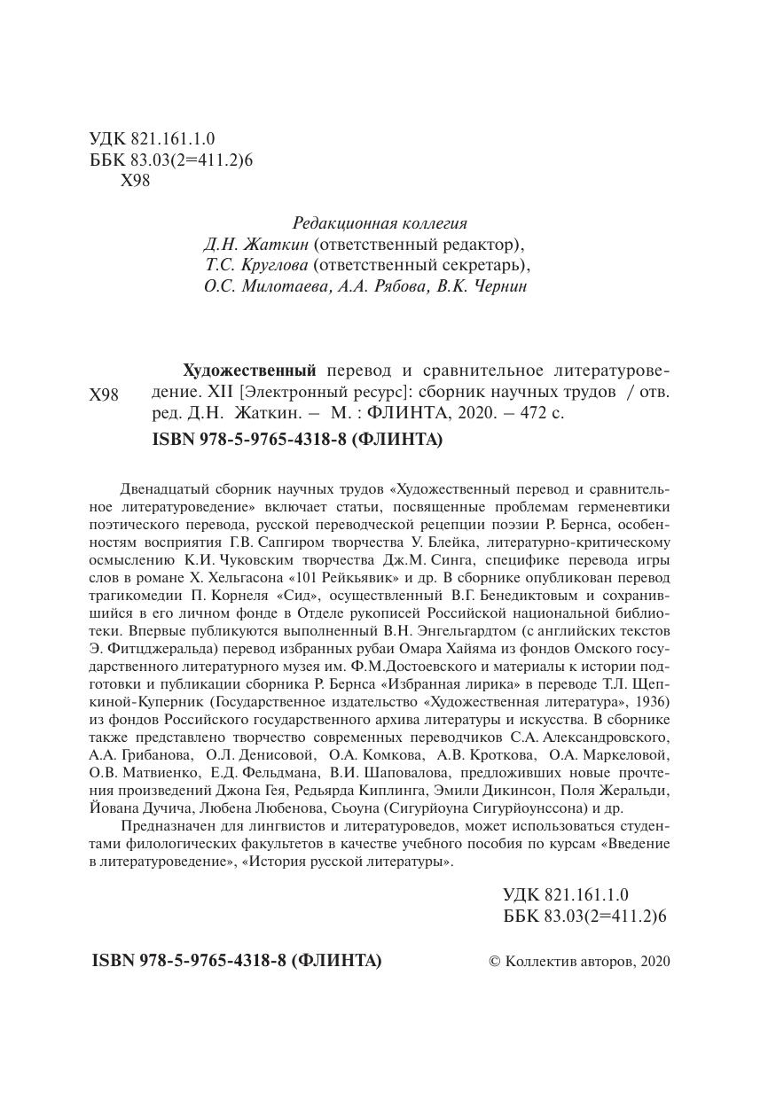 Двенадцатый сборник научных трудов «Художественный перевод и сравнительное литературоведение» включает статьи, посвященные проблемам герменевтики поэтического перевода, русской переводческой рецепции поэзии Р. Бернса, особенностям восприятия Г.В. Сапгиром творчества У. Блейка, литературно-критическому