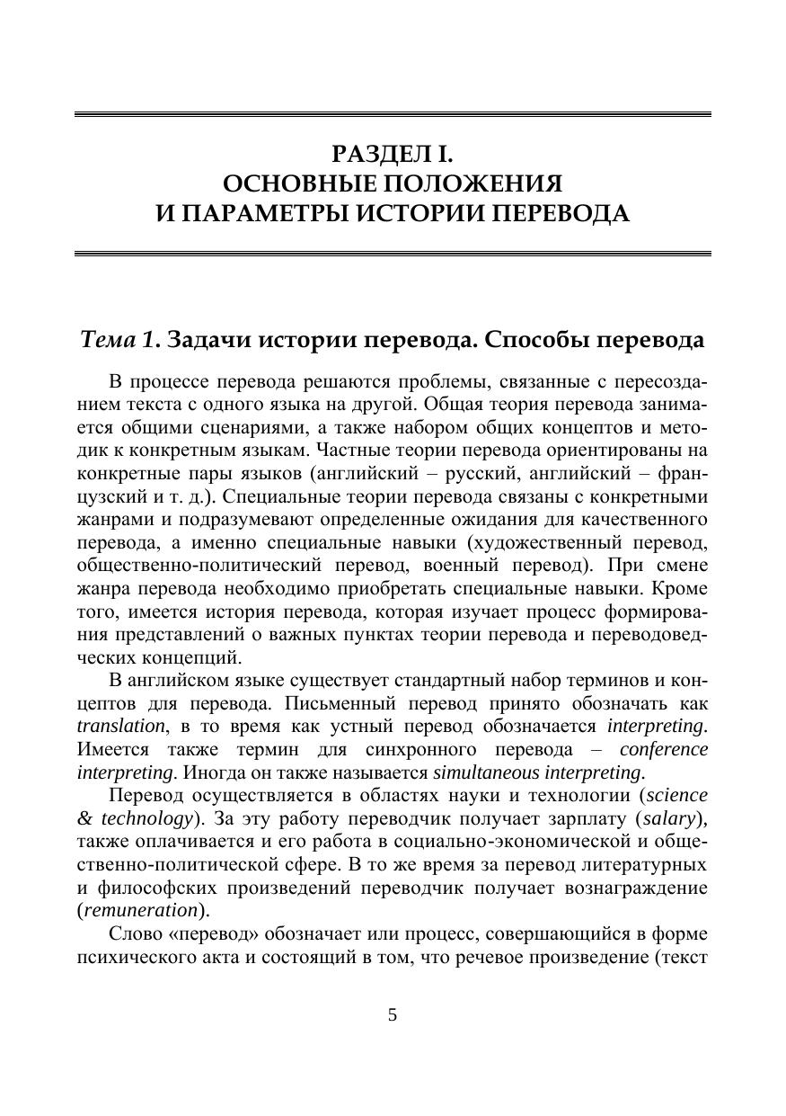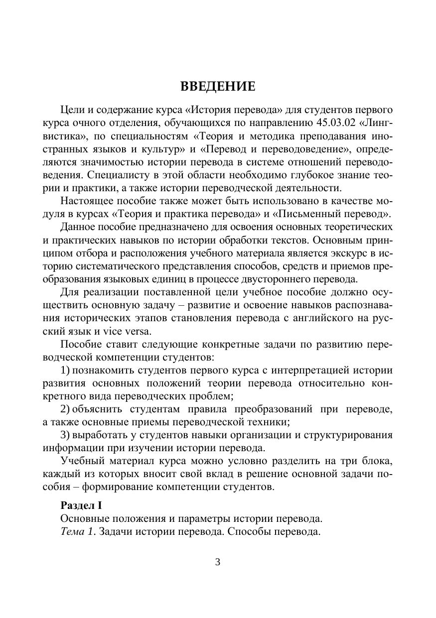Пособие посвящено вопросам истории перевода и переводоведения. История перевода рассматривается как история контекстов и формул, получавших различные интерпретации в процессе языкового развития. Освещаются основные проблемы теории и методов перевода. Пособие «История перевода» опирается на лингвистические предпосылки становления понятия «перевод» и учитывает такие качества перевода, как его процессуальность и результативность. Пособие рекомендуется бакалаврам, обучающимся по направлению подготовки «Лингвистика» по специальностям «Теория и методика преподавания иностранных языков и культур» и «Перевод и переводоведение», а также специалистам в области переводоведения.