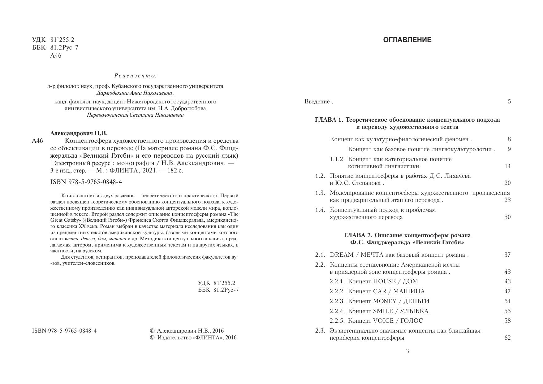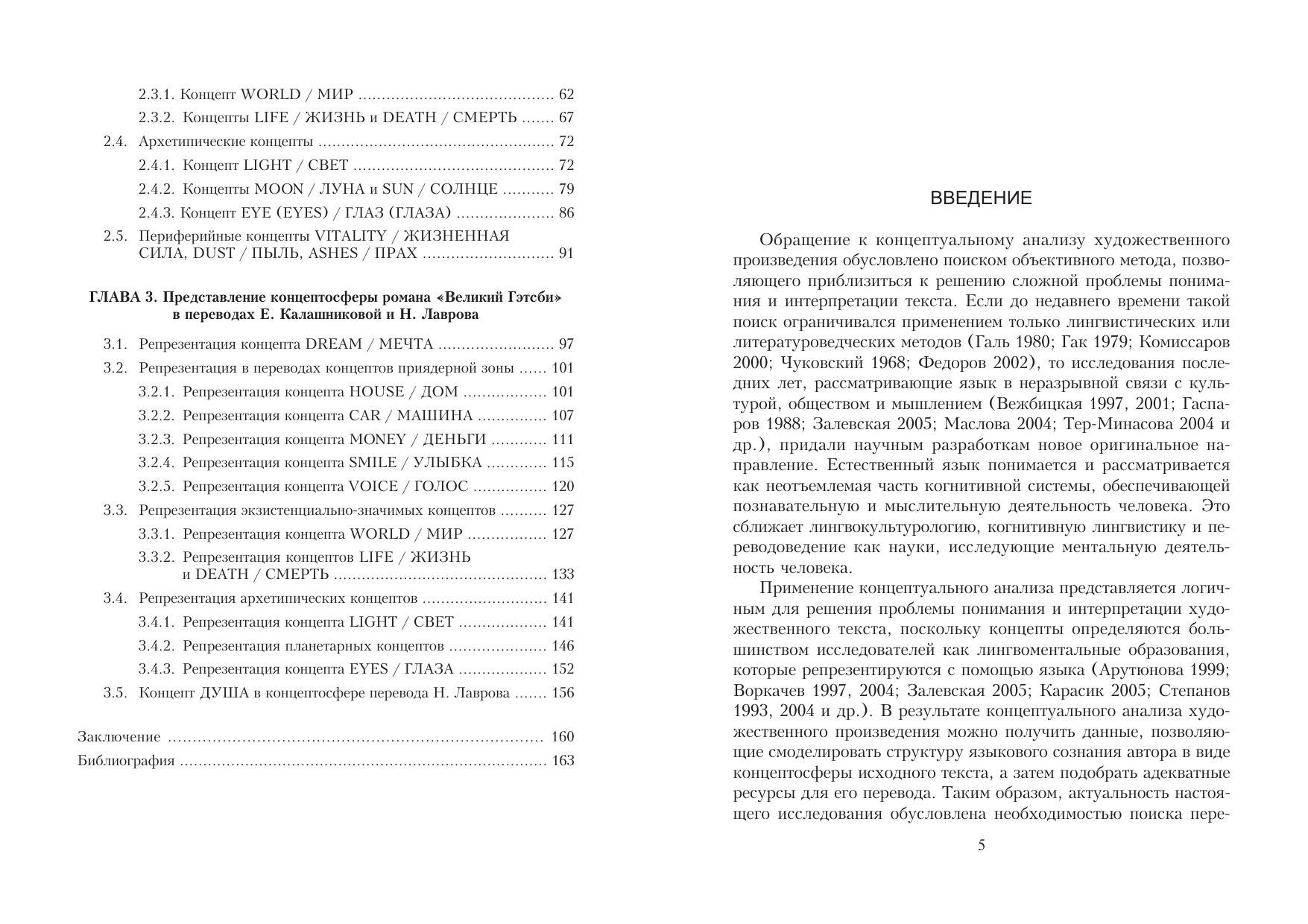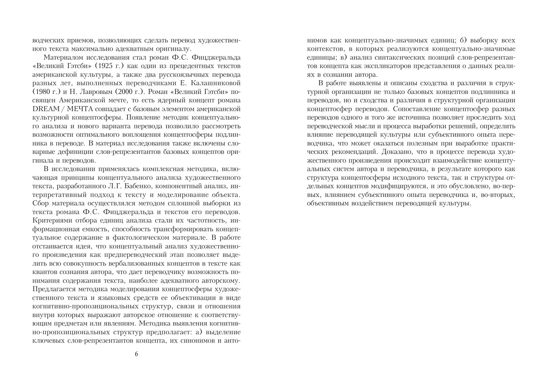 Книга состоит из двух разделов — теоретического и практического. Первый раздел посвящен теоретическому обоснованию концептуального подхода к художественному произведению как индивидуальной авторской модели мира, воплощенной в тексте. Второй раздел содержит описание концептосферы романа «The Great Gatsby» («Великий Гэтсби») Фрэнсиса Скотта Фицджеральда, американского классика XX века. Роман выбран в качестве материала исследования как один из прецедентных текстов американской культуры, базовыми концептами которого стали мечта, деньги, дом, машина и др. Методика концептуального анализа, предлагаемая автором, применима к художественным текстам и на других языках, в частности, на русском.