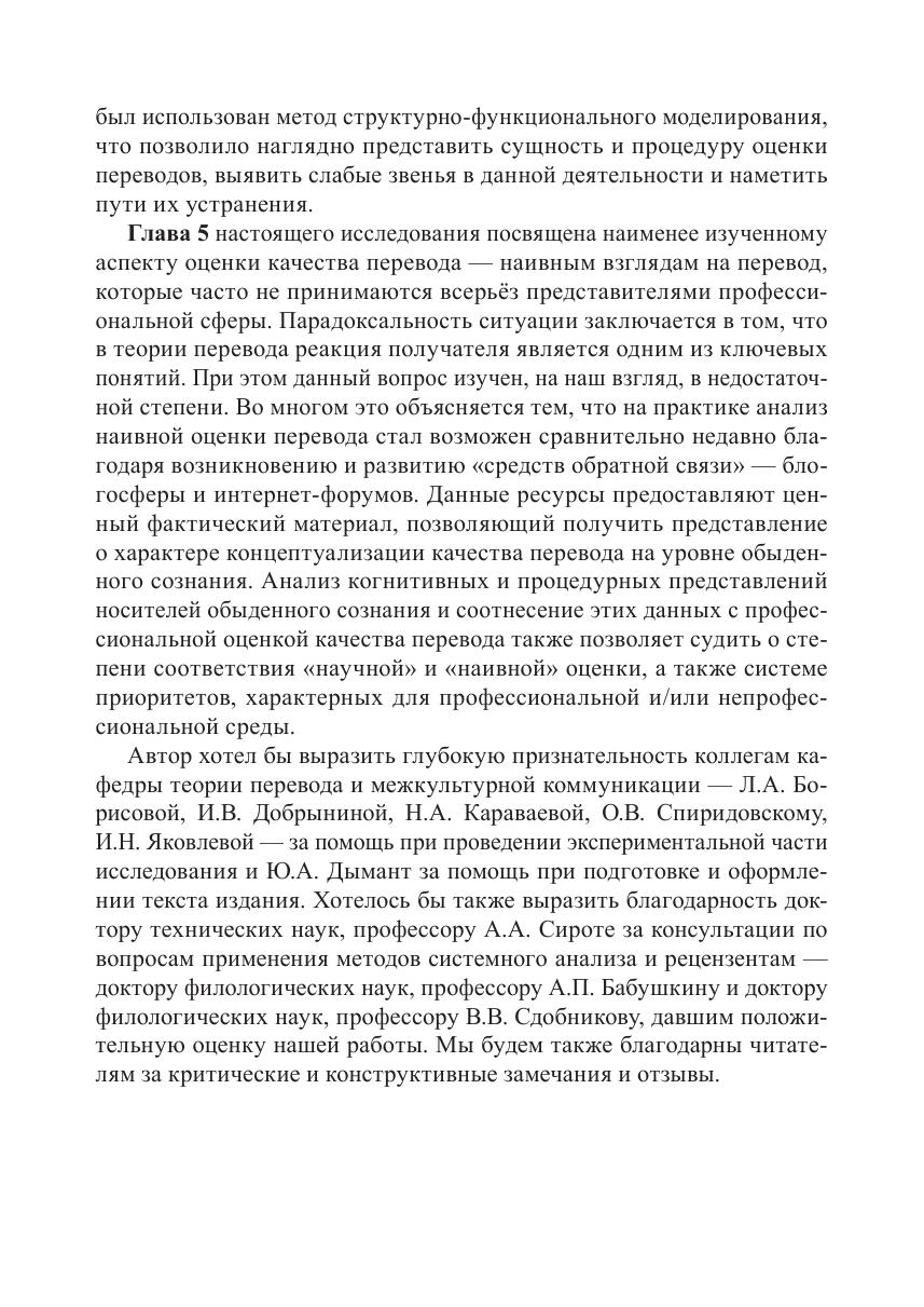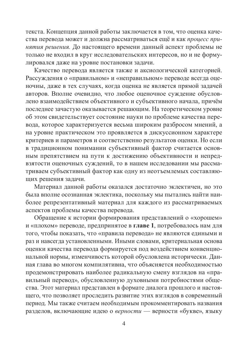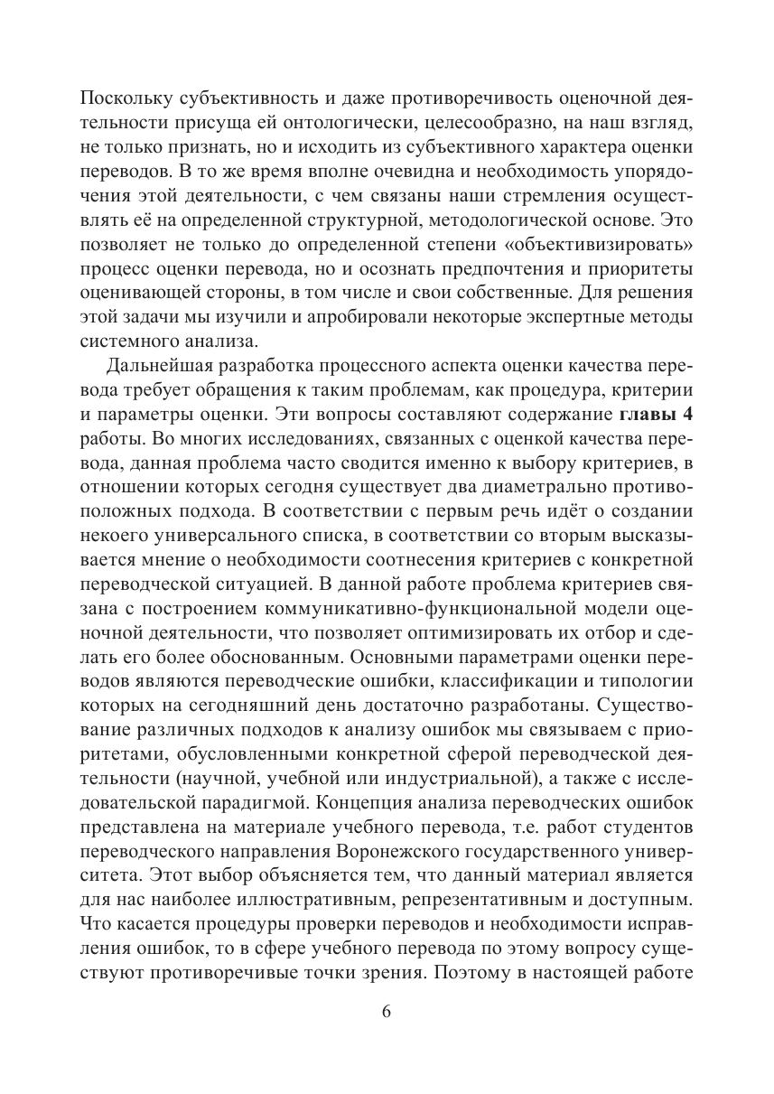 В монографии представлен междисциплинарный подход к проблеме оценки качества перевода. Рассматриваются исторический, теоретический и прикладной аспекты, а также результаты научных исследований и практической деятельности автора в рамках указанной тематики. Обосновывается целесообразность интерпретации понятия качество перевода как результата критического анализа и как процесса принятия решения. Значительное внимание уделяется вопросам применения экспертных методов системного анализа для исследований проблемы оценки качества перевода, а также обоснования коммуникативно-функциональной и структурно-функциональной моделей оценочной деятельности в интересах её упорядочения и объективизации. Метакогнитивный аспект исследования связан с проблемой реакции получателя и концептуализацией качества перевода в обыденном сознании.