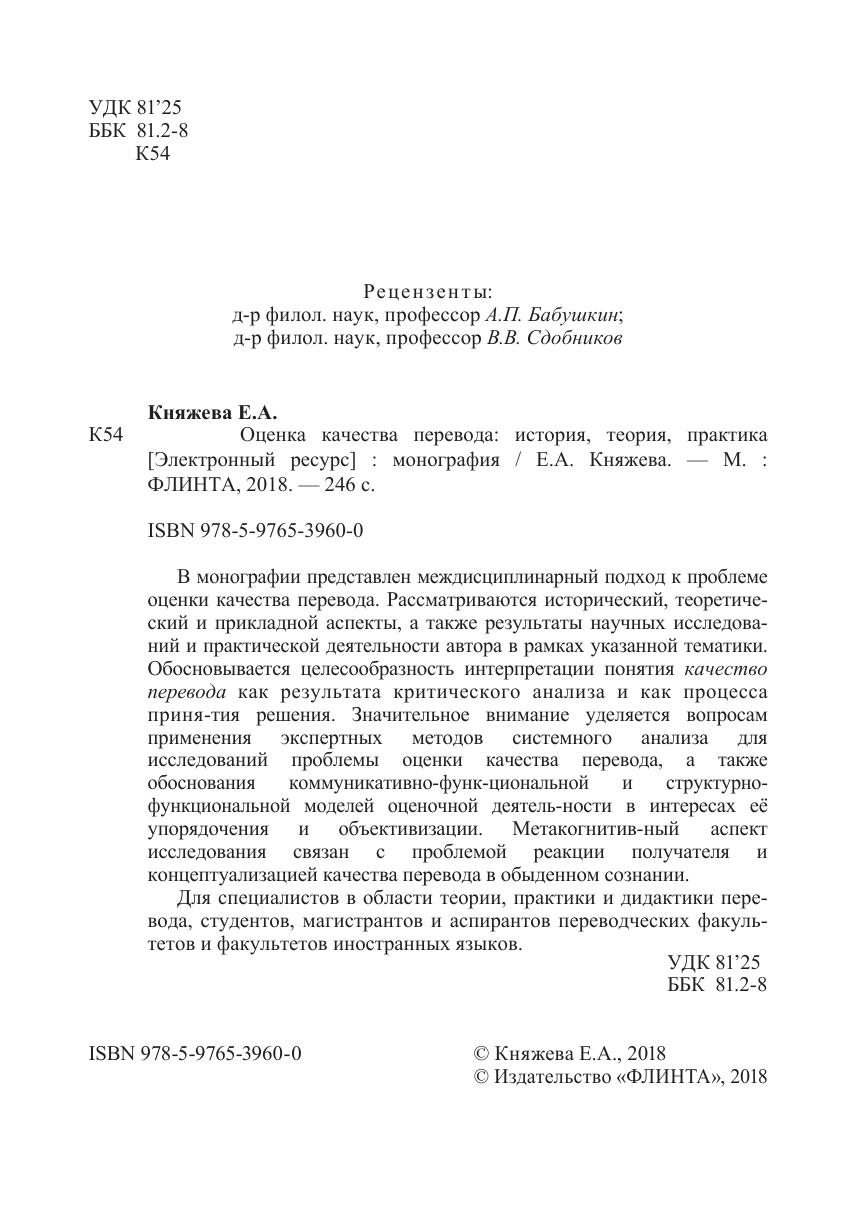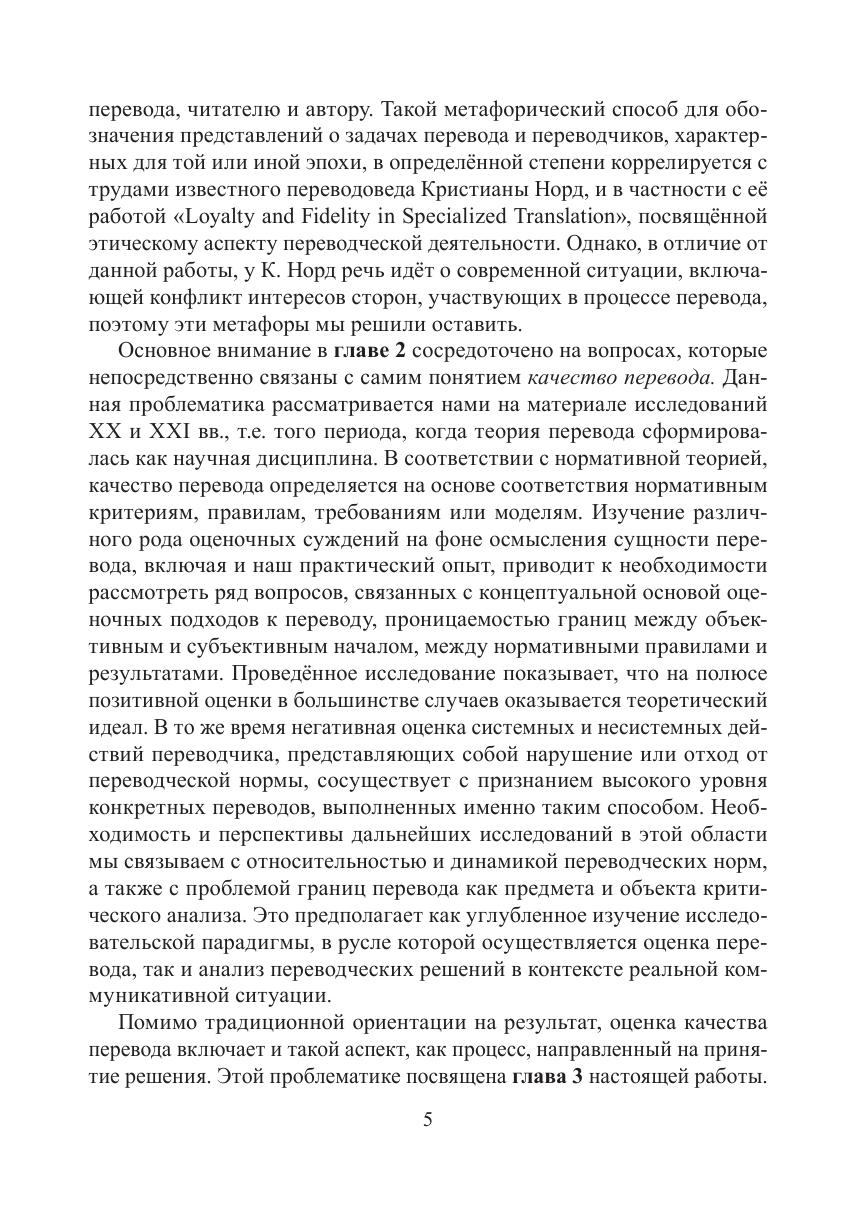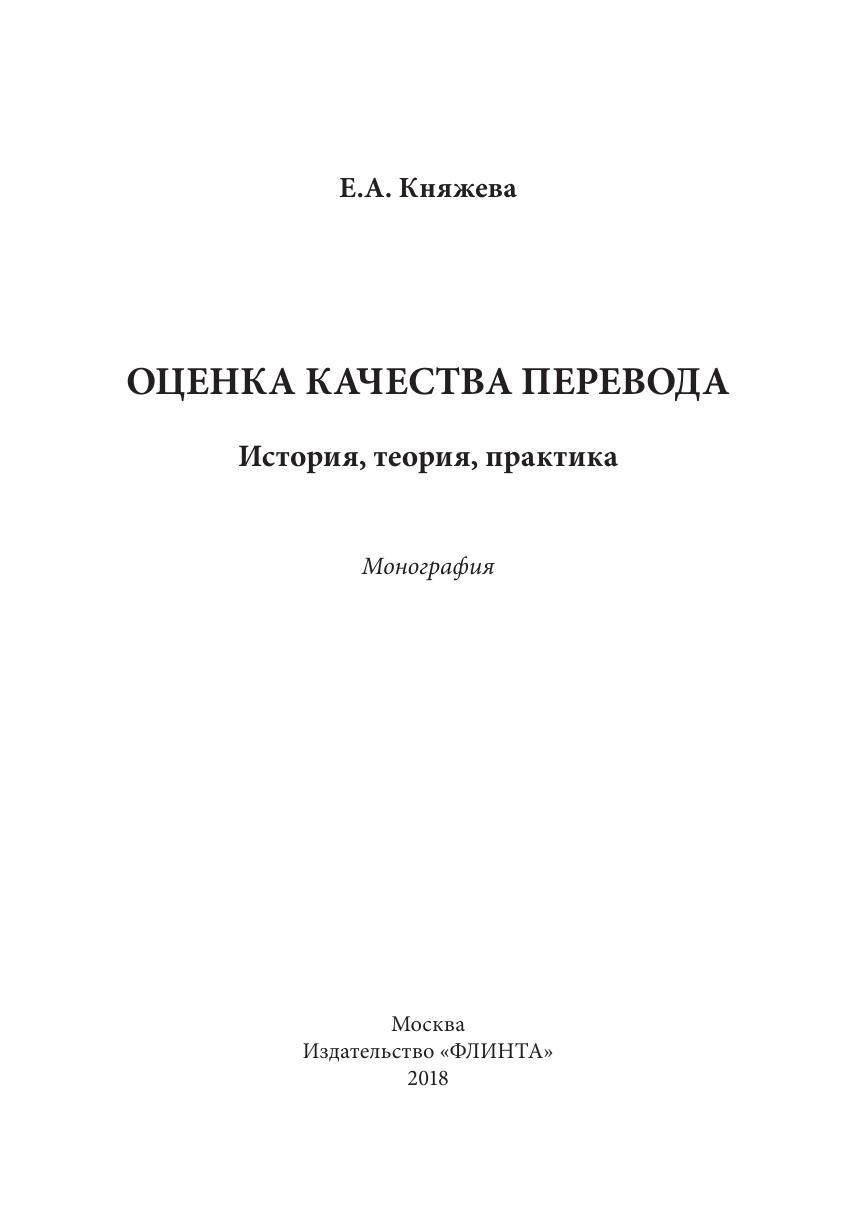 В монографии представлен междисциплинарный подход к проблеме оценки качества перевода. Рассматриваются исторический, теоретический и прикладной аспекты, а также результаты научных исследований и практической деятельности автора в рамках указанной тематики. Обосновывается целесообразность интерпретации понятия качество перевода как результата критического анализа и как процесса принятия решения. Значительное внимание уделяется вопросам применения экспертных методов системного анализа для исследований проблемы оценки качества перевода, а также обоснования коммуникативно-функциональной и структурно-функциональной моделей оценочной деятельности в интересах её упорядочения и объективизации. Метакогнитивный аспект исследования связан с проблемой реакции получателя и концептуализацией качества перевода в обыденном сознании.